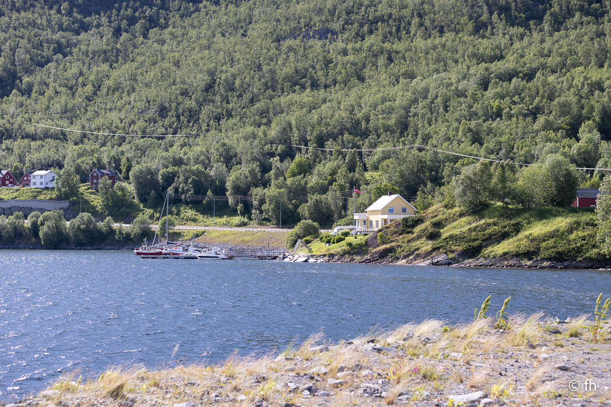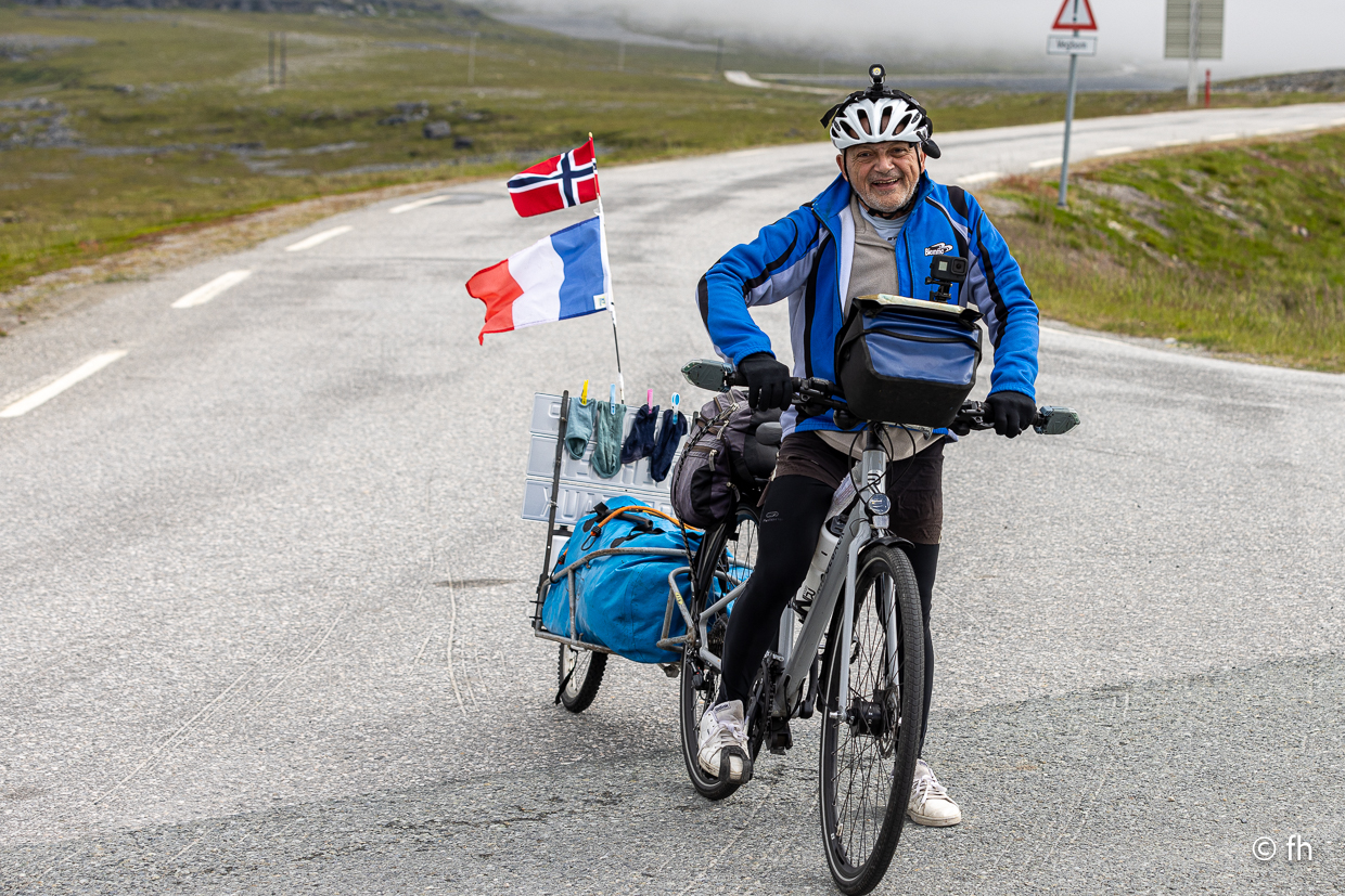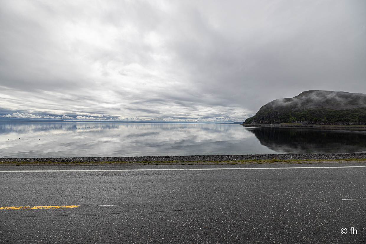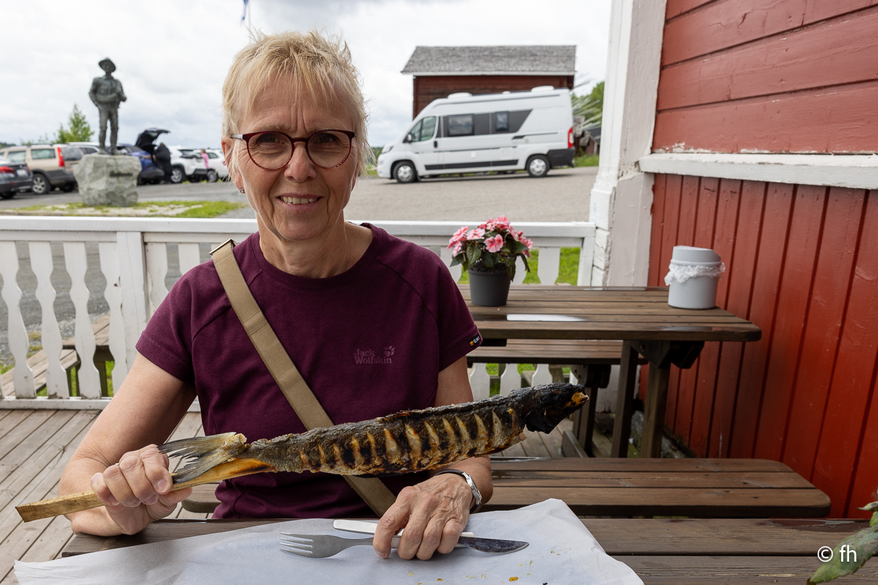 Gestern gab es keinen Bericht, es gab nicht viel zu berichten. Außer dass wir den Franzosen, den wir am Nordkap kenngelernt haben, nun zum dritten Mal auf der Straße gesehen haben. Er kam mit seinem Rad aus einer kleinen Seitenstraße, wo er auf einer Wiese übernachtet hatte. Gerade vor uns wollte er auf die E6 einbiegen, wir hatten leider Vorfahrt. Stopp. Das konnte ich mir nicht entgehen lassen. Darf ich ein Foto von Ihnen machen. Ja gerne. Nachdem wir dann alle Daten, E-Mail-Telefonnummer, ausgetauscht hatten, um ihm die Fotos zu senden, ging die Fahrt weiter. Mit einem schönen aber sehr windigen Schlafplatz direkt am Wasser endete der Tag. Übrigens die dritte Übernachtung ohne Campingplatz.