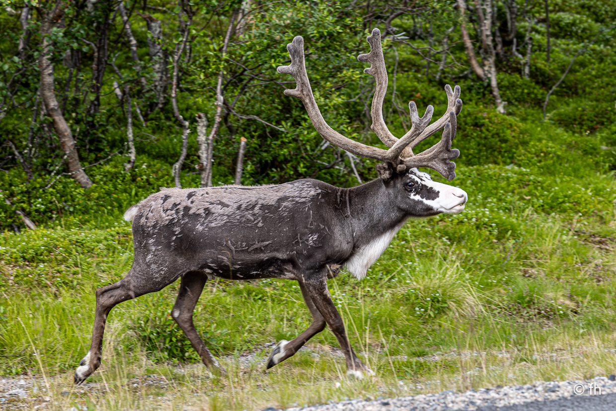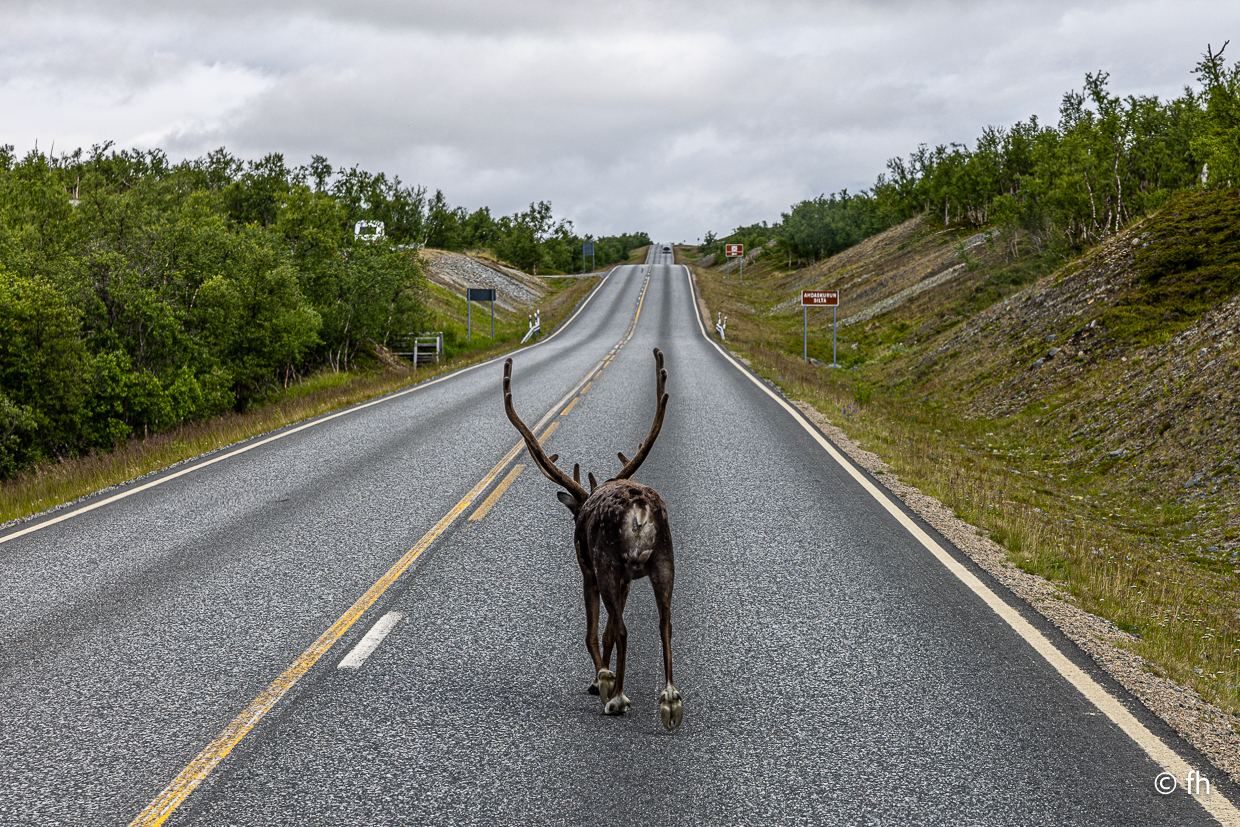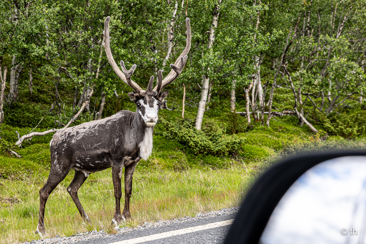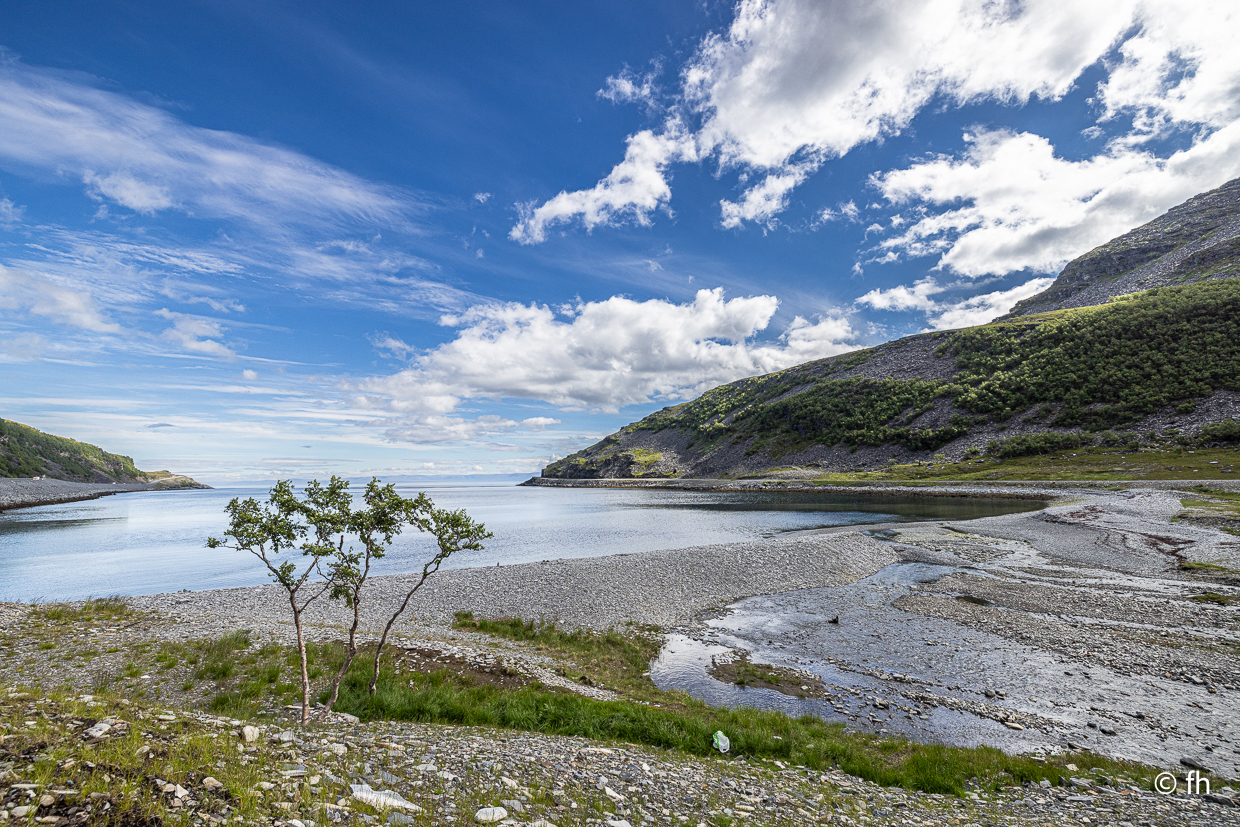 Gestern gab es keinen Bericht, es gab nicht viel zu berichten. Außer dass wir den Franzosen, den wir am Nordkap kenngelernt haben, nun zum dritten Mal auf der Straße gesehen haben. Er kam mit seinem Rad aus einer kleinen Seitenstraße, wo er auf einer Wiese übernachtet hatte. Gerade vor uns wollte er auf die E6 einbiegen, wir hatten leider Vorfahrt. Stopp. Das konnte ich mir nicht entgehen lassen. Darf ich ein Foto von Ihnen machen. Ja gerne. Nachdem wir dann alle Daten, E-Mail-Telefonnummer, ausgetauscht hatten, um ihm die Fotos zu senden, ging die Fahrt weiter. Mit einem schönen aber sehr windigen Schlafplatz direkt am Wasser endete der Tag. Übrigens die dritte Übernachtung ohne Campingplatz.