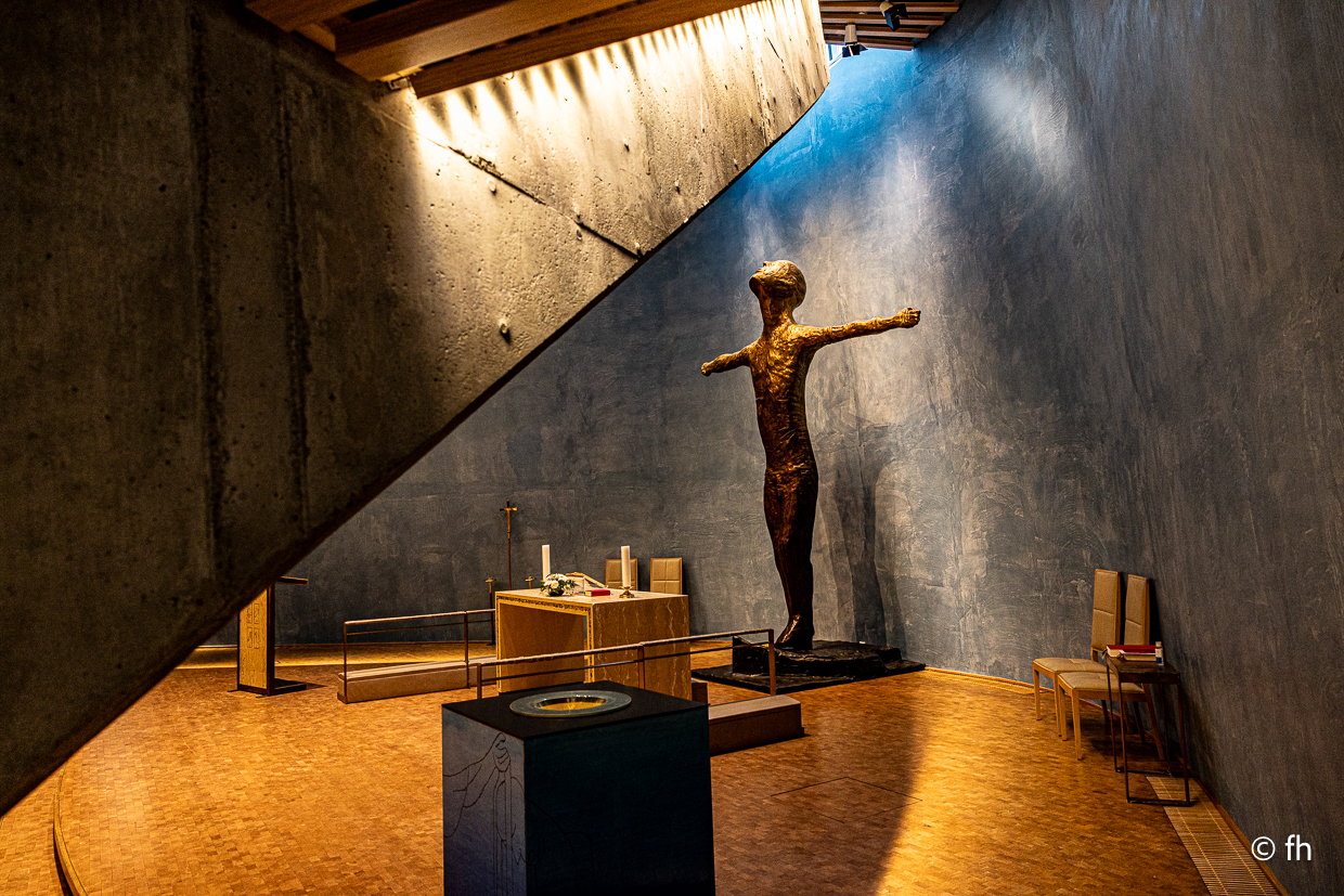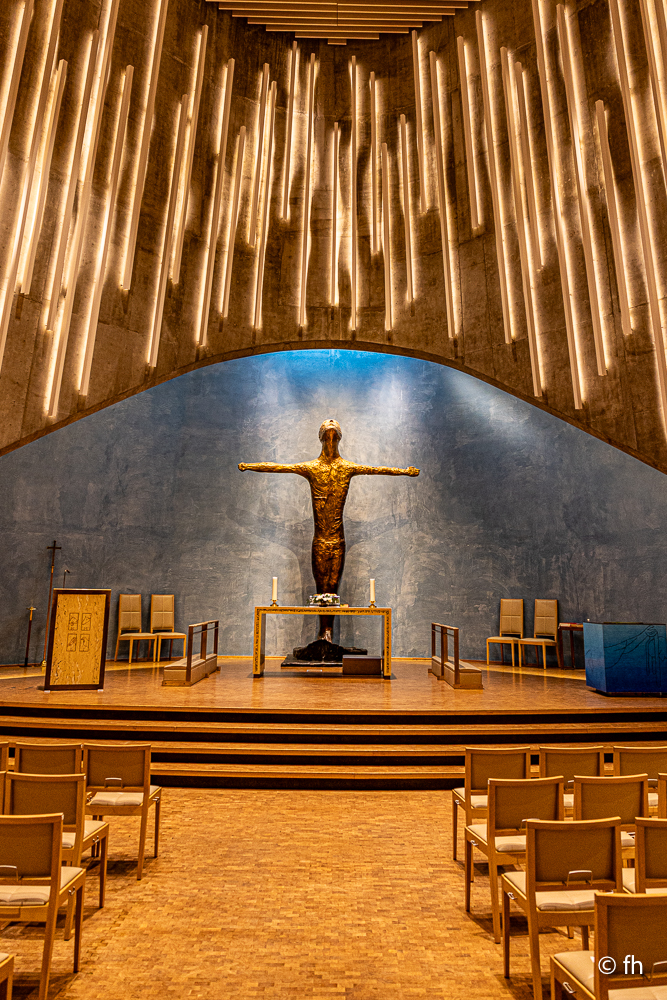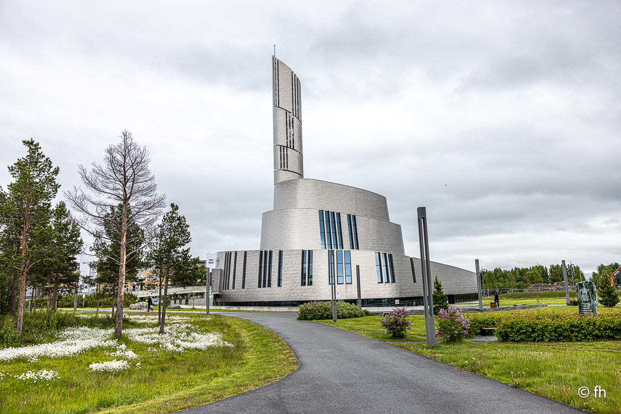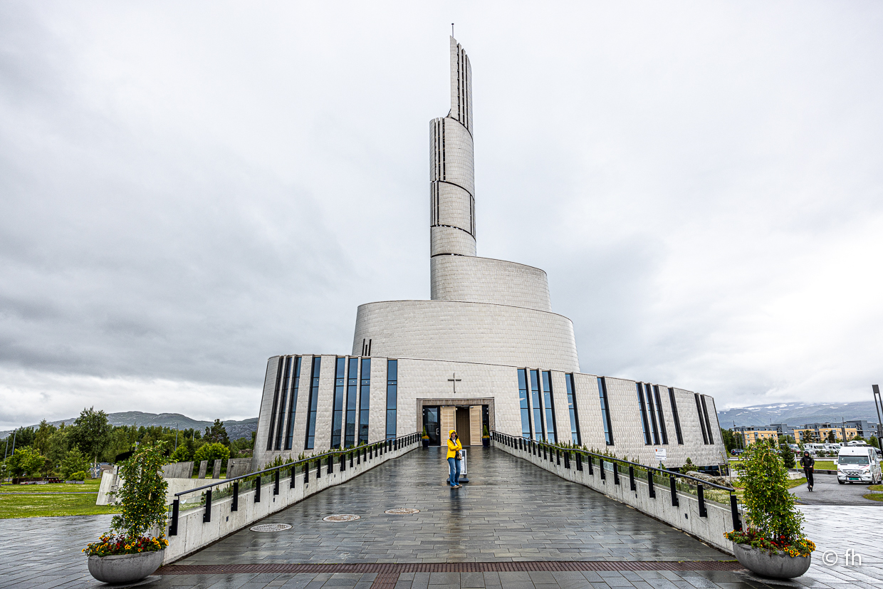 Hier in Alta ist es mückenfrei, noch. Denn im Moment regnet es. Aber wir haben vorgesorgt. Einige Mücken haben die lange Fahrt von Kilpisjärvi bis Alta im Wohnmobil überlebt und werden, wenn wir es schaffen, im Staubsaugerbeutel landen. Ansonsten gibt es heute nicht viel zu berichten. Außer einer Besichtigung der Kirche in Alta. Die Nordlichtkathedrale Alta Kirche. Ein beeindruckendes Bauwerk. Die Kirche ist ganz aus Beton gebaut und außen mit Titanplatten verkleidet.