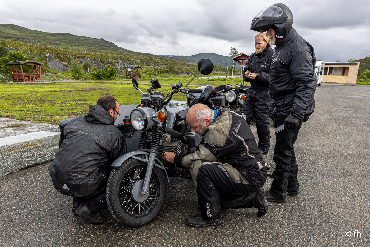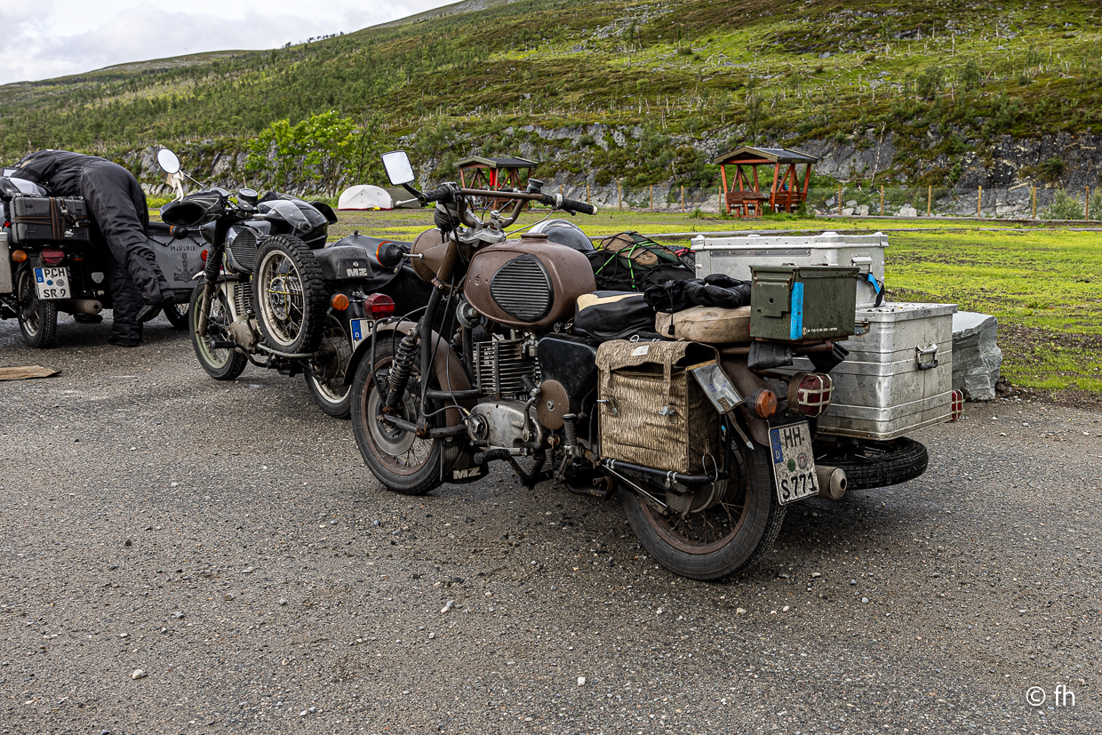 Heute ist es soweit, wir werden das Nordkap erreichen. Der nördlichste Punkt, den man mit dem Auto erreichen kann. Leider haben es gestern Abend nicht alle Mücken in den Staubsaugerbeutel geschafft. Christel hat sich noch ein bisschen stechen lassen. Bei mir habe ich aufgehört die Einstiche zu kontrollieren. Also früh aus den Betten, obwohl, wir haben nur eins. Egal. Um 7:00 Uhr war die Nacht vorbei. Um 8:45 Uhr ging es auf die Piste. 229 km zum Nordkap stand auf dem ersten Schild. Bei der ersten kleinen Pause standen da fünf Mopeds aus vergangenen Tagen, Oldies im wahrsten Sinne. Die Teile sahen aus, als wenn sie es nicht bis zur nächsten Ecke schaffen würden. An einer Maschine wurde auch fleißig geschraubt. Auf der Fahrt hierhin – Regen, Nebel – die Sicht war nicht schön. Was uns da wohl am Nordkap erwartet. Aber die Reiseleiterin Christel war bestens informiert, ab Mittag Sonne am Nordkap bis morgen um 11:00 Uhr. Das reicht für uns. Deshalb übrigens die Eile heute zum Nordkap zu kommen, denn die nächsten Tage sehen nicht gut aus in der Wettervorschau. Und, was soll ich sagen, voll ins Schwarze getroffen, strahlender Sonnenschein. Im Moment sogar komplett wolkenlos. Es ist jetzt 20:30 Uhr. Das Licht ist unbeschreiblich, wenn die Sonne versucht hinter dem Horizont zu verschwinden. Wird Sie aber nicht, denn kurz über dem Horizont geht Sie gleich wieder auf. Ein einmaliger Vorgang. Einfach Klasse anzusehen. Vielleicht gelingen uns ein paar schöne Fotos.