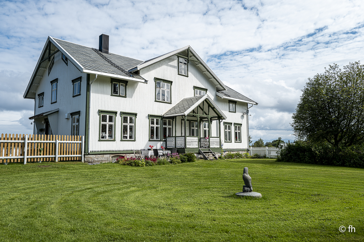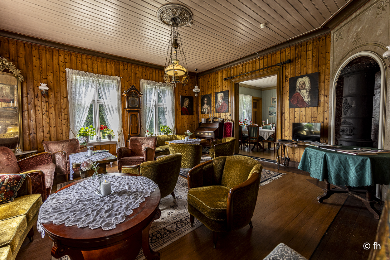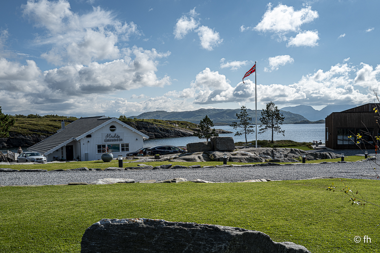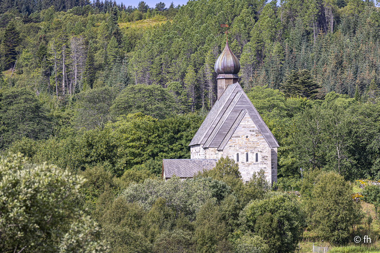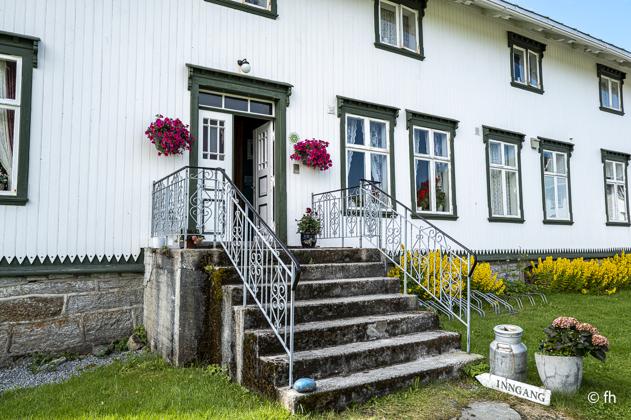 Der Mittwoch, also heute, begrüßte uns von seiner besten Seite. Sonne pur. Der Weg führte uns zunächst zu einer alten Stein-Kirche. Gleich nebenan ein Hotel mit Café. Da die Kirche noch geschlossen war, haben wir uns das Café angeschaut, natürlich incl. Waffel und Kaffee. Eine Einrichtung wie zu Omas Zeiten und in eines der Zimmer haben wir auch einen Blick riskiert. Das stand sogar noch die Schüssel mit einem Krug für die morgendliche Wäsche. Die Führung in der Kirche geht los, aber leider auf Norwegisch, und für uns die Kurzfassung in Englisch. Der Bauernhof bei der Kirche, in den nun das Café und Hotel sind, stammt aus dem Mittelalter und war historisch gesehen ein Zentrum von Macht und Reichtum in der Region. Die Dønnes-Kirche gehörte bis Ende des 18.Jahrhundert zum Hof. Ende des 17. Jahrhunderts wurde eine Grabkammer neben der Kirche für die auf dem Hof lebenden Familien errichtet. Heute ist die Grabkammer eines der größten und am besten erhaltenen Mausoleen Norwegens, davon konnten wir uns selbst überzeugen. Die Dame hat die Grabkammer geöffnet und wir konnten uns die Särge anschauen. Fotografieren durfte man dort nicht. Auf die Frage, ob noch jemand in den Särgen liegt, ja selbstverständlich. Der erste Gast in der Kammer war „Peder Christophersen Tønder“ 1641–1994. Die Jüngste „Anna Rebecca Angell“ 1704-1793.