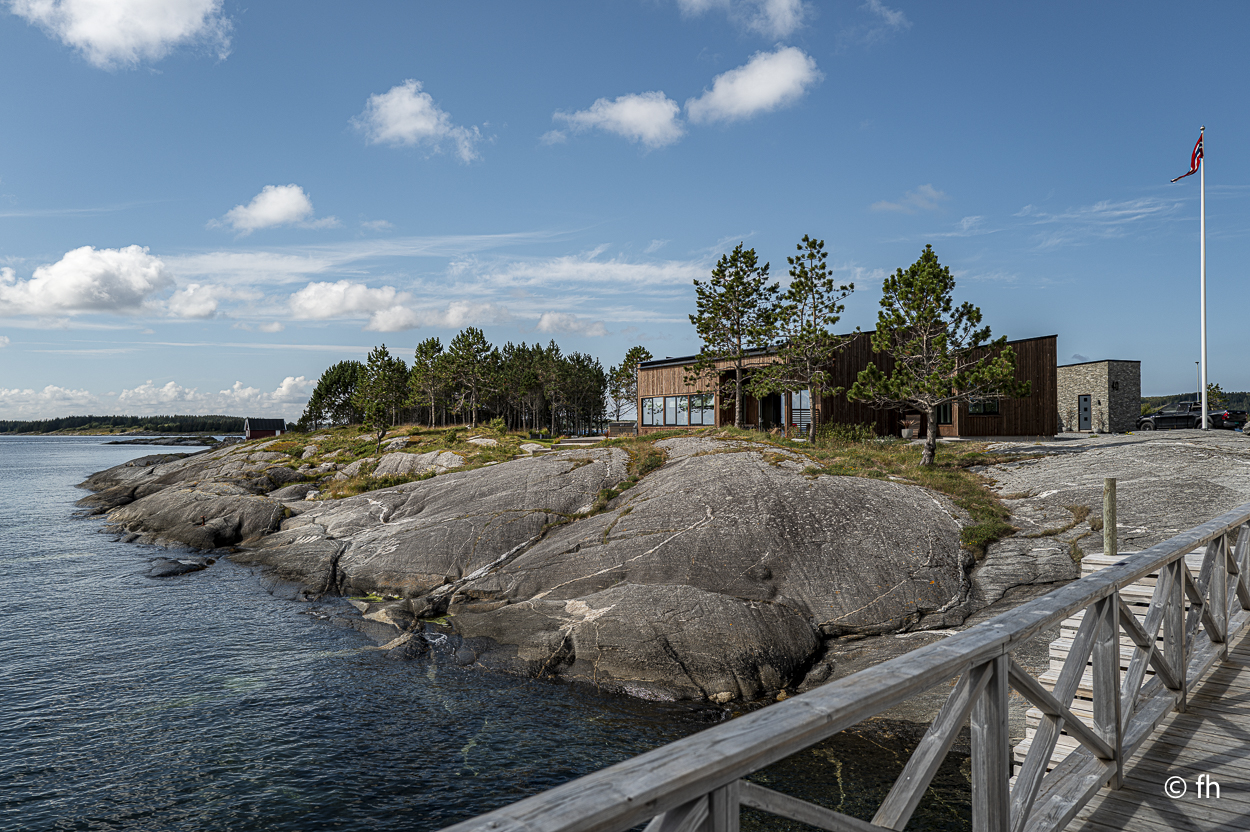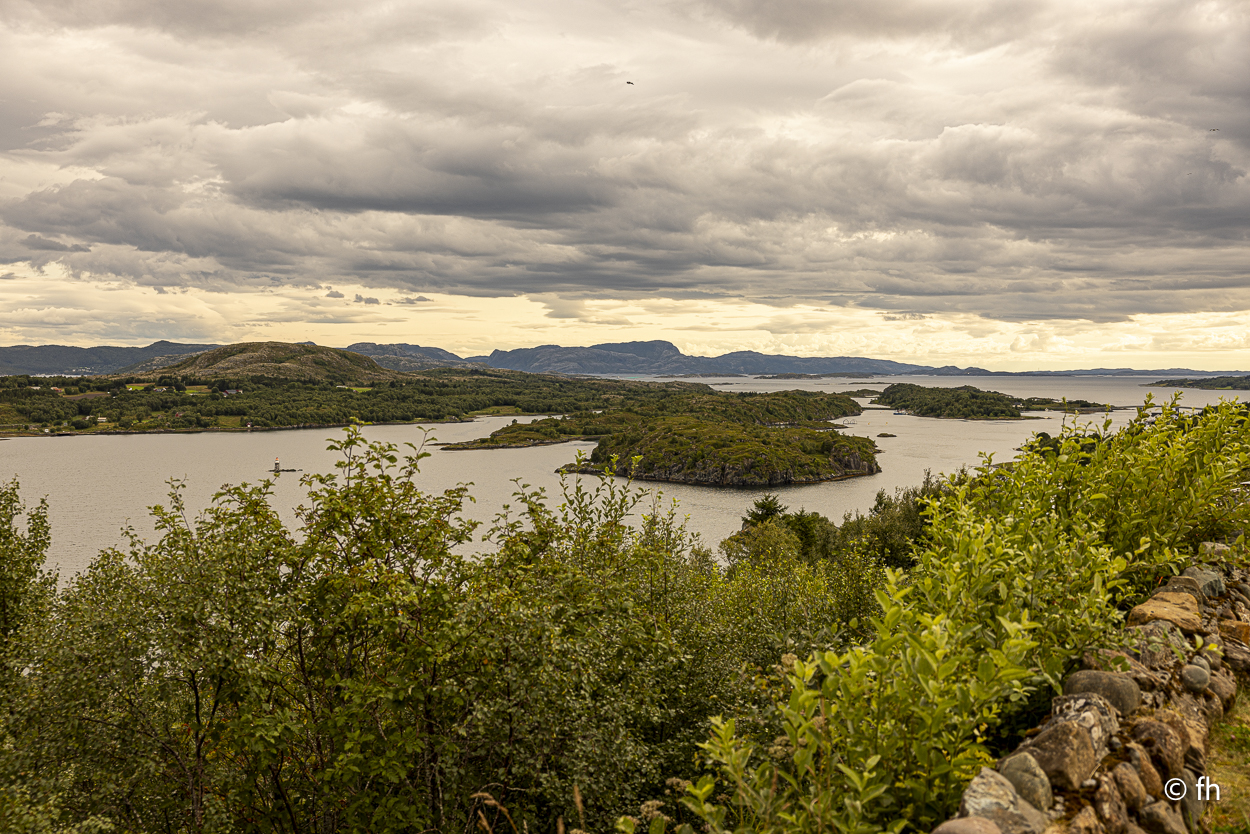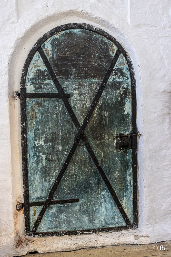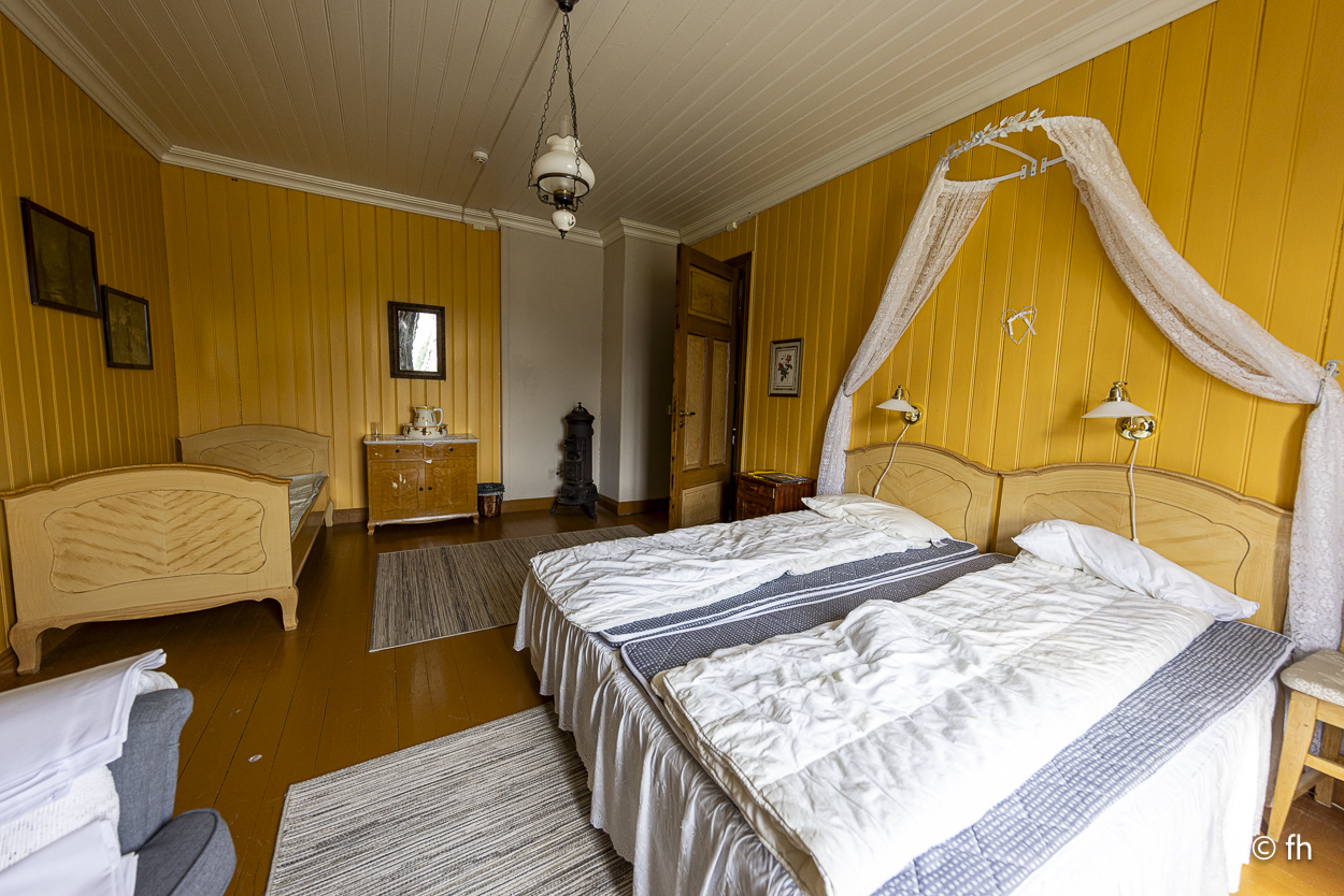 Der Mittwoch, also heute, begrüßte uns von seiner besten Seite. Sonne pur. Der Weg führte uns zunächst zu einer alten Stein-Kirche. Gleich nebenan ein Hotel mit Café. Da die Kirche noch geschlossen war, haben wir uns das Café angeschaut, natürlich incl. Waffel und Kaffee. Eine Einrichtung wie zu Omas Zeiten und in eines der Zimmer haben wir auch einen Blick riskiert. Das stand sogar noch die Schüssel mit einem Krug für die morgendliche Wäsche. Die Führung in der Kirche geht los, aber leider auf Norwegisch, und für uns die Kurzfassung in Englisch. Der Bauernhof bei der Kirche, in den nun das Café und Hotel sind, stammt aus dem Mittelalter und war historisch gesehen ein Zentrum von Macht und Reichtum in der Region. Die Dønnes-Kirche gehörte bis Ende des 18.Jahrhundert zum Hof. Ende des 17. Jahrhunderts wurde eine Grabkammer neben der Kirche für die auf dem Hof lebenden Familien errichtet. Heute ist die Grabkammer eines der größten und am besten erhaltenen Mausoleen Norwegens, davon konnten wir uns selbst überzeugen. Die Dame hat die Grabkammer geöffnet und wir konnten uns die Särge anschauen. Fotografieren durfte man dort nicht. Auf die Frage, ob noch jemand in den Särgen liegt, ja selbstverständlich. Der erste Gast in der Kammer war „Peder Christophersen Tønder“ 1641–1994. Die Jüngste „Anna Rebecca Angell“ 1704-1793.