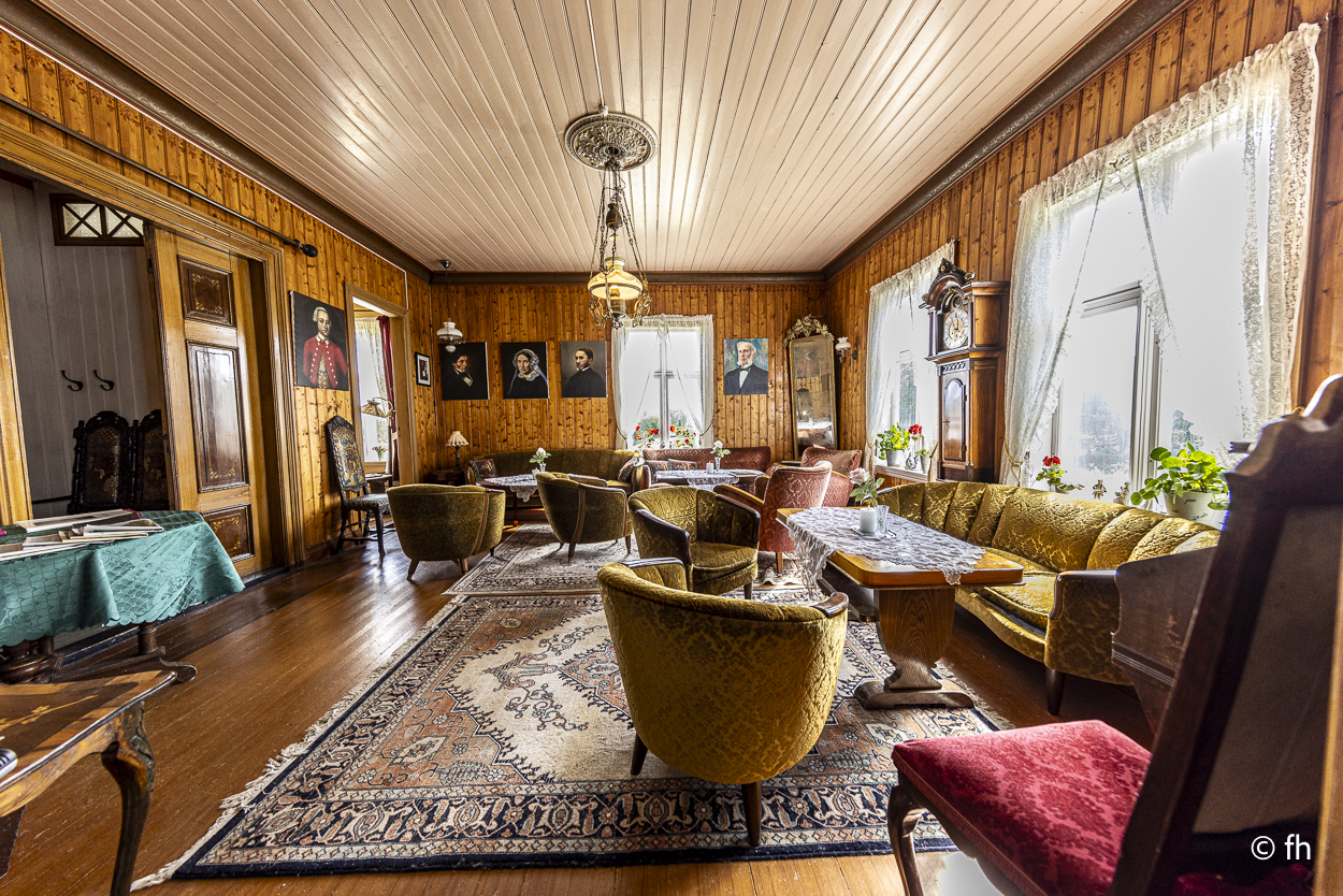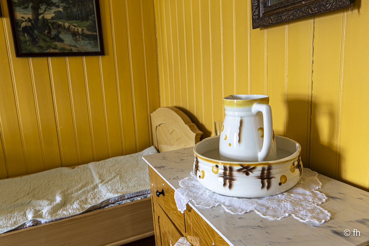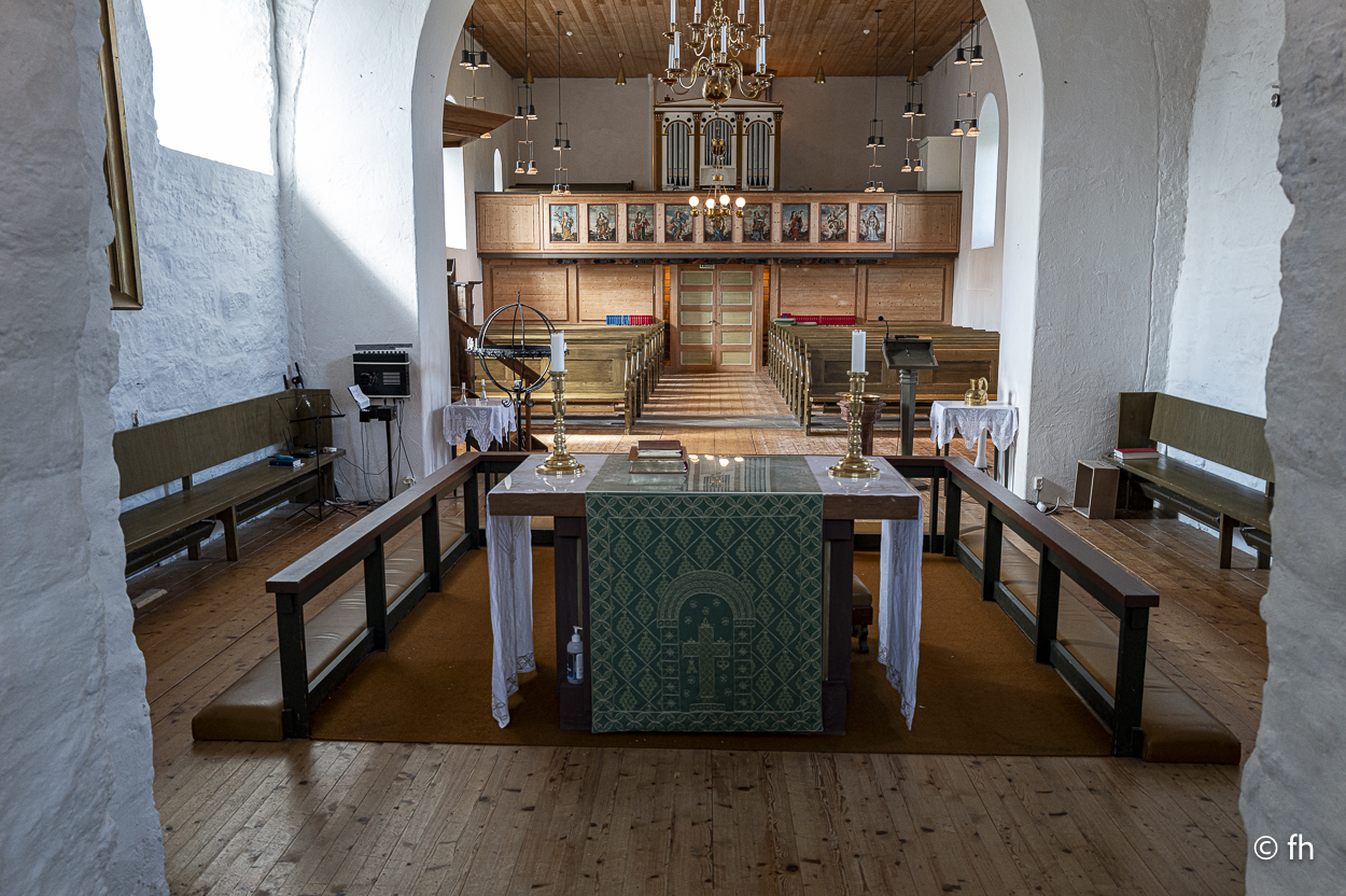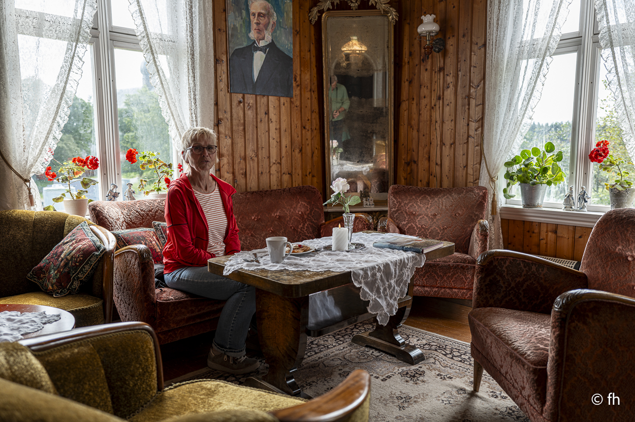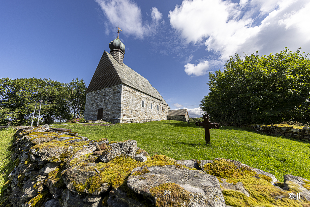 Der Mittwoch, also heute, begrüßte uns von seiner besten Seite. Sonne pur. Der Weg führte uns zunächst zu einer alten Stein-Kirche. Gleich nebenan ein Hotel mit Café. Da die Kirche noch geschlossen war, haben wir uns das Café angeschaut, natürlich incl. Waffel und Kaffee. Eine Einrichtung wie zu Omas Zeiten und in eines der Zimmer haben wir auch einen Blick riskiert. Das stand sogar noch die Schüssel mit einem Krug für die morgendliche Wäsche. Die Führung in der Kirche geht los, aber leider auf Norwegisch, und für uns die Kurzfassung in Englisch. Der Bauernhof bei der Kirche, in den nun das Café und Hotel sind, stammt aus dem Mittelalter und war historisch gesehen ein Zentrum von Macht und Reichtum in der Region. Die Dønnes-Kirche gehörte bis Ende des 18.Jahrhundert zum Hof. Ende des 17. Jahrhunderts wurde eine Grabkammer neben der Kirche für die auf dem Hof lebenden Familien errichtet. Heute ist die Grabkammer eines der größten und am besten erhaltenen Mausoleen Norwegens, davon konnten wir uns selbst überzeugen. Die Dame hat die Grabkammer geöffnet und wir konnten uns die Särge anschauen. Fotografieren durfte man dort nicht. Auf die Frage, ob noch jemand in den Särgen liegt, ja selbstverständlich. Der erste Gast in der Kammer war „Peder Christophersen Tønder“ 1641–1994. Die Jüngste „Anna Rebecca Angell“ 1704-1793.