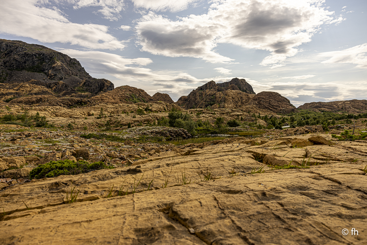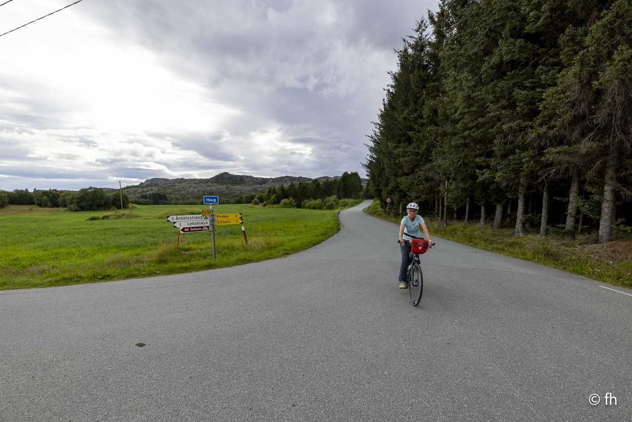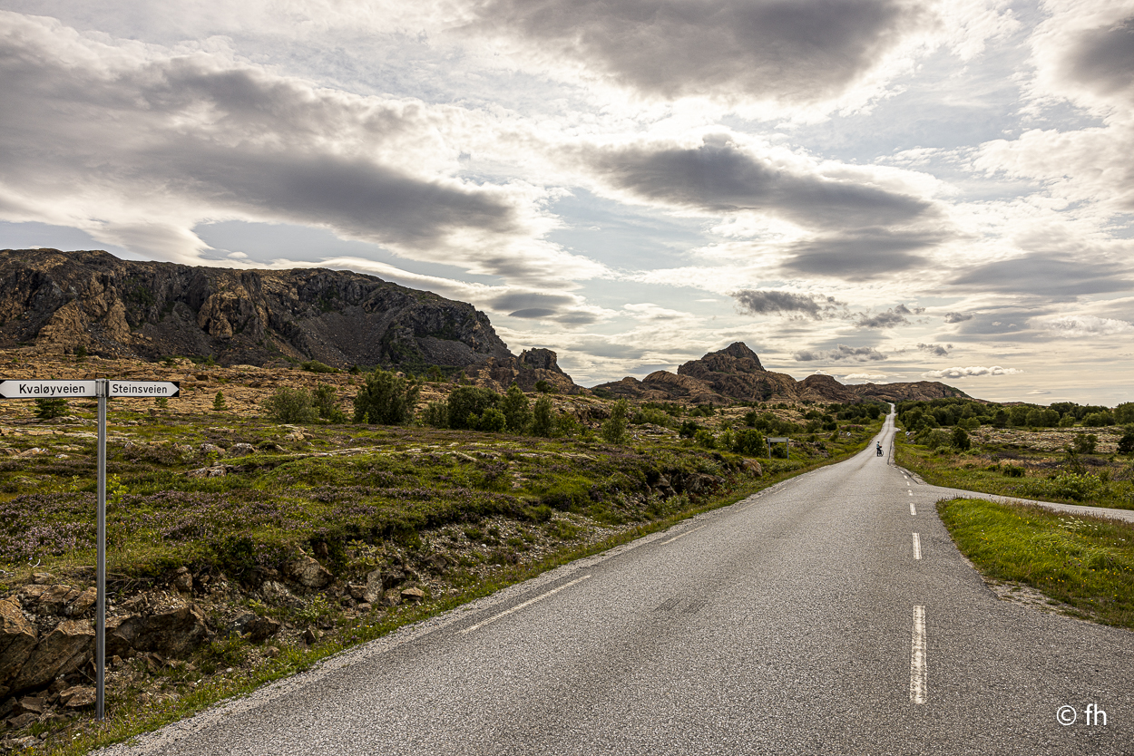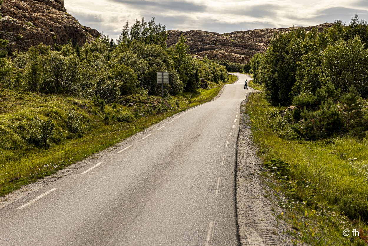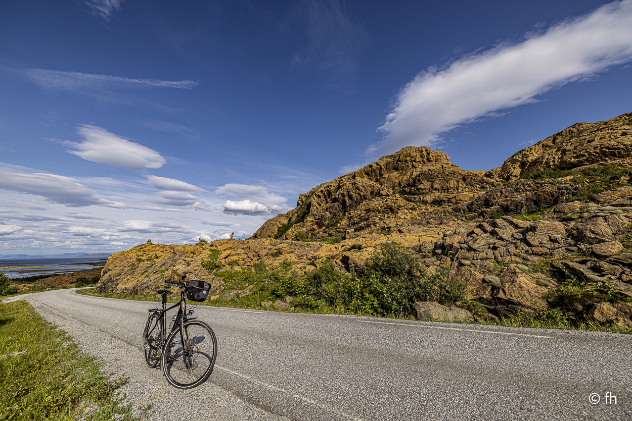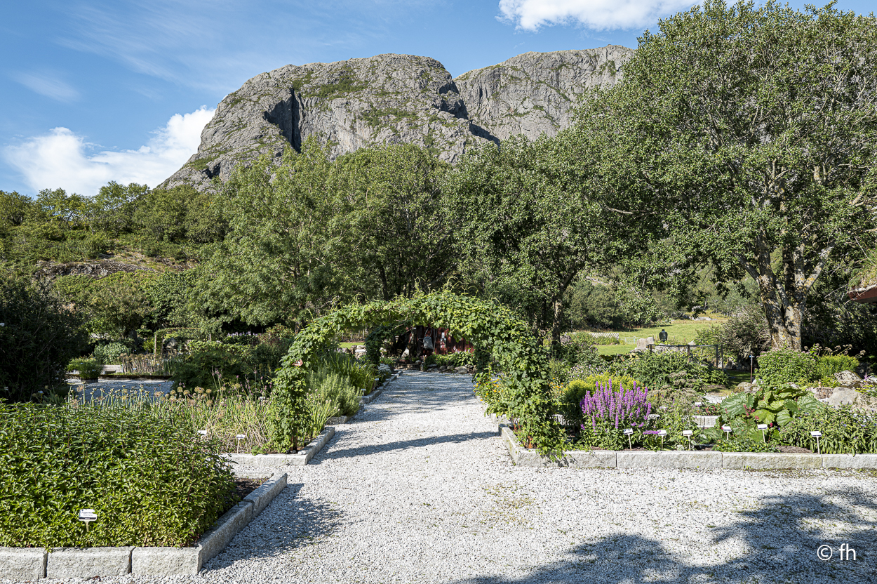 Heute Morgen habe ich den Chef in seinem Kräutergarten bei der Arbeit getroffen. Seine Mutter Hildrus hat das ganze aufgebaut, er sei die zweite Generation, aber auch schon in Rente. Seine Kinder leiten jetzt das Café, Restaurant und Hotel. Wir haben die Nacht nicht ganz alleine auf dem Parkplatz verbracht, es war noch ein Paar aus Hamburg dort. Bei einem netten Gespräch hat uns die Dame die Insel „Leka“ schmackhaft gemacht. Da wir noch keinen Plan hatten, haben wir uns auf den Weg gemacht. Es hat sich gelohnt. Was du hier auf der kleinen Insel zu sehen bekommst ist schon atemberaubend. Mit dem Rad kannst du die Insel locker umrunden, es sind ca. 25 km. Eine leicht zu fahrende Strecke stand in dem Reisführer. Weiß nicht, wer das geschrieben hat. Jan Ullrich? Uns ist auf jeden Fall teilweise die Puste ausgegangen, so lange und steile Anstiege mussten wir erklimmen. Aber jeder Kilometer hat sich gelohnt. Auf einer Seite der Insel gibt es Steinformationen, die im Sonnenlicht warm rötlich leuchten. Auf der anderen Seite der Insel führt der Weg durch ein dicht bewaldetes Gebiet. Unglaublich, ich hoffe man kann es auf den Bildern etwas nachvollziehen.