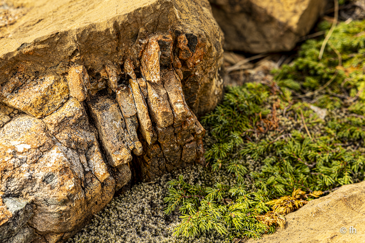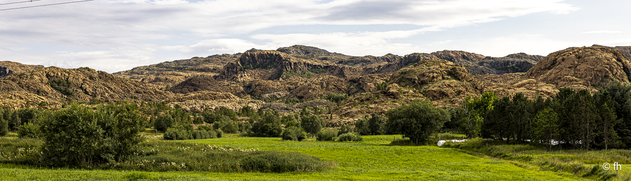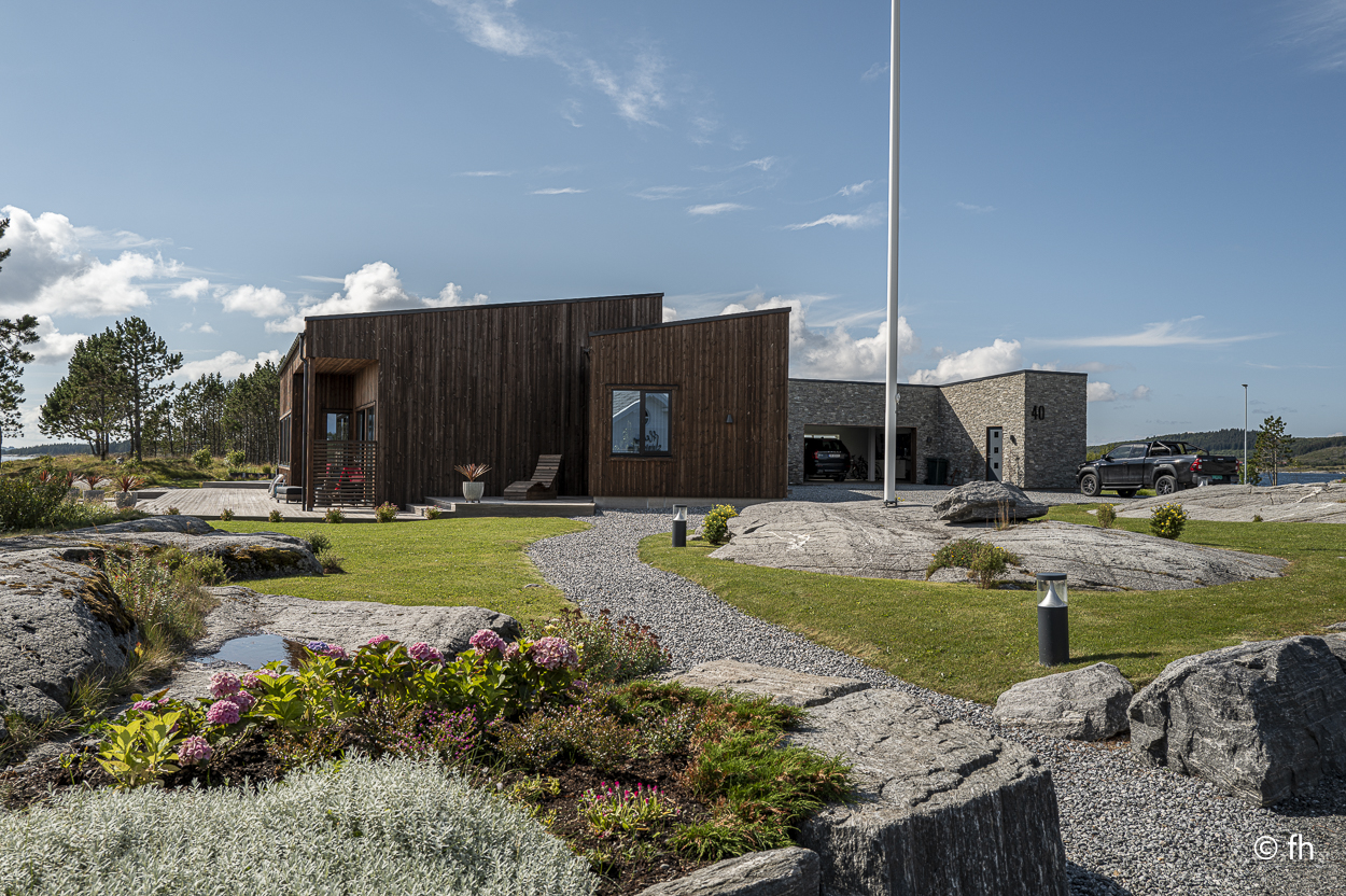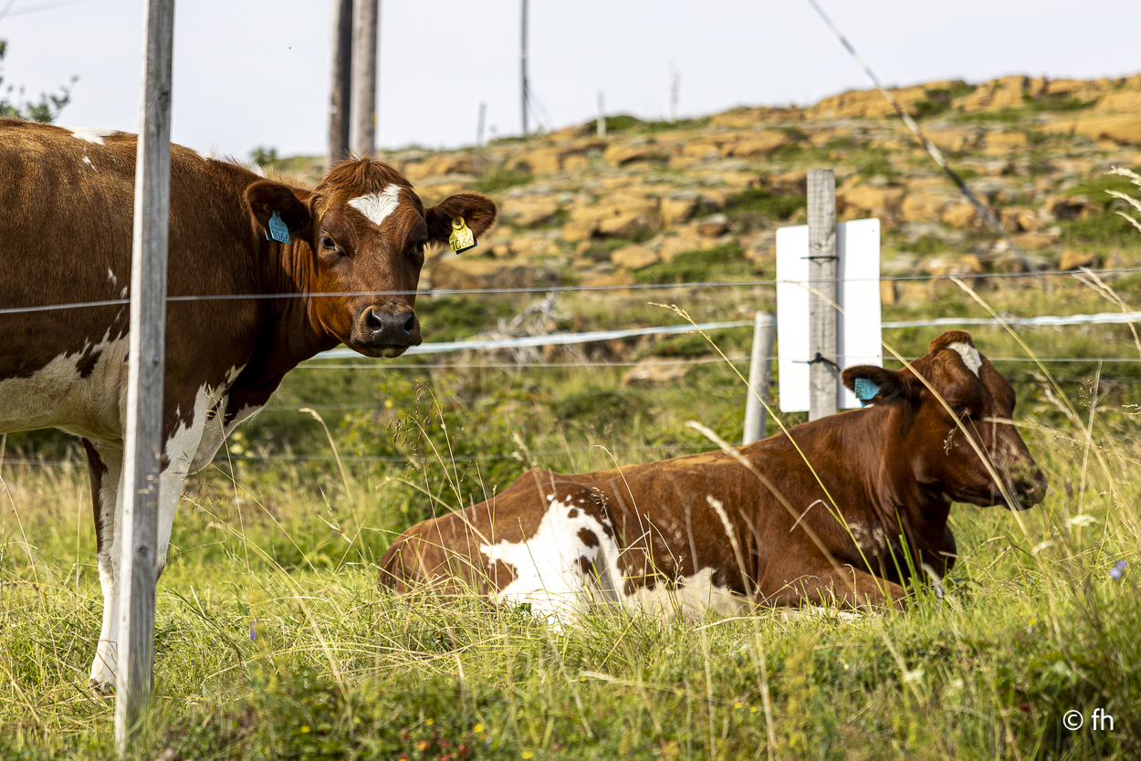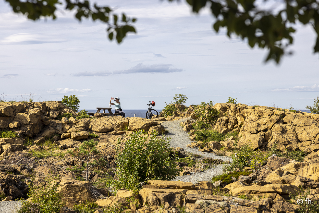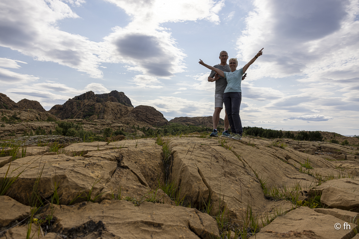 Heute Morgen habe ich den Chef in seinem Kräutergarten bei der Arbeit getroffen. Seine Mutter Hildrus hat das ganze aufgebaut, er sei die zweite Generation, aber auch schon in Rente. Seine Kinder leiten jetzt das Café, Restaurant und Hotel. Wir haben die Nacht nicht ganz alleine auf dem Parkplatz verbracht, es war noch ein Paar aus Hamburg dort. Bei einem netten Gespräch hat uns die Dame die Insel „Leka“ schmackhaft gemacht. Da wir noch keinen Plan hatten, haben wir uns auf den Weg gemacht. Es hat sich gelohnt. Was du hier auf der kleinen Insel zu sehen bekommst ist schon atemberaubend. Mit dem Rad kannst du die Insel locker umrunden, es sind ca. 25 km. Eine leicht zu fahrende Strecke stand in dem Reisführer. Weiß nicht, wer das geschrieben hat. Jan Ullrich? Uns ist auf jeden Fall teilweise die Puste ausgegangen, so lange und steile Anstiege mussten wir erklimmen. Aber jeder Kilometer hat sich gelohnt. Auf einer Seite der Insel gibt es Steinformationen, die im Sonnenlicht warm rötlich leuchten. Auf der anderen Seite der Insel führt der Weg durch ein dicht bewaldetes Gebiet. Unglaublich, ich hoffe man kann es auf den Bildern etwas nachvollziehen.