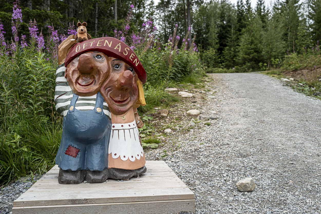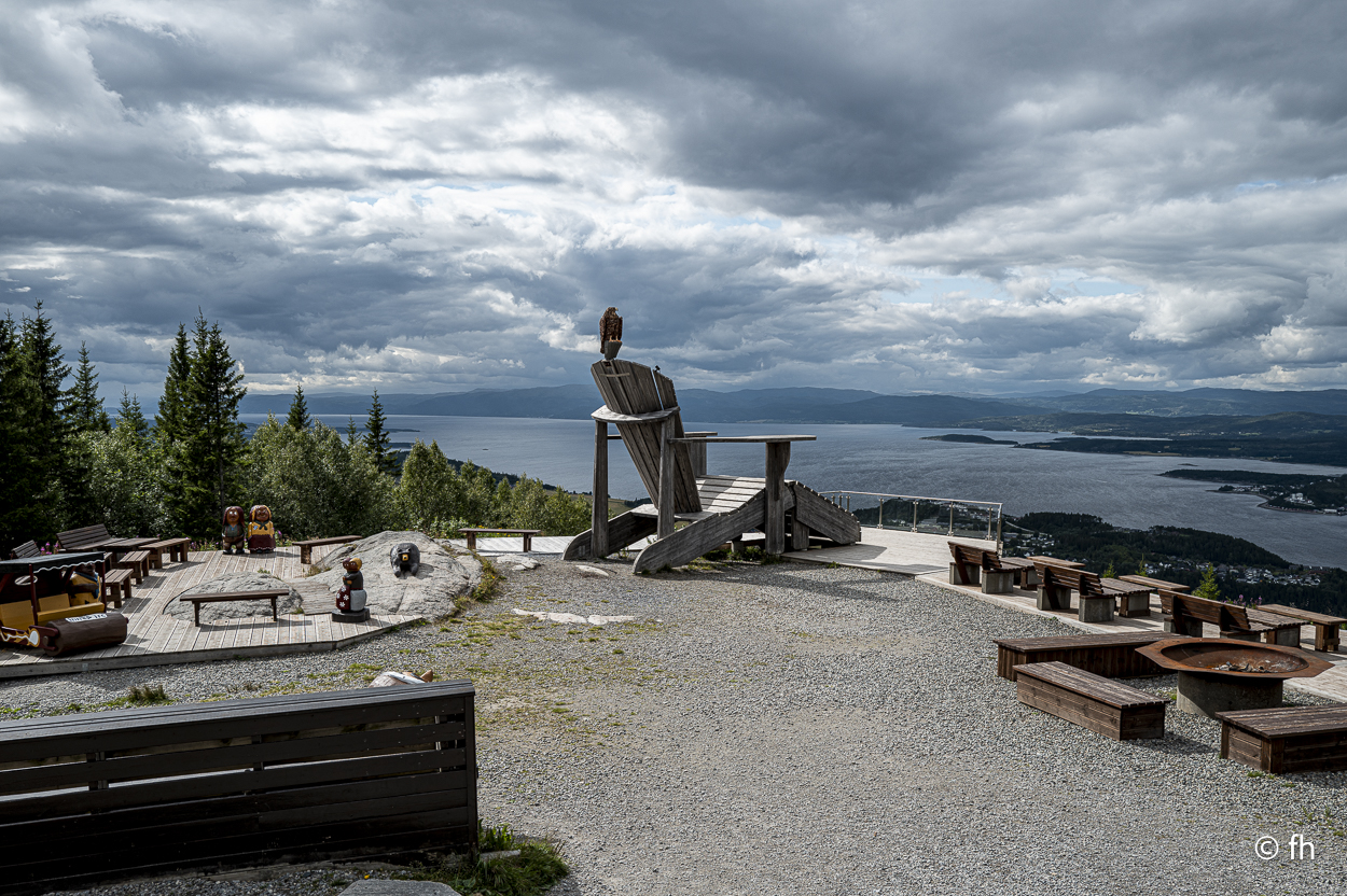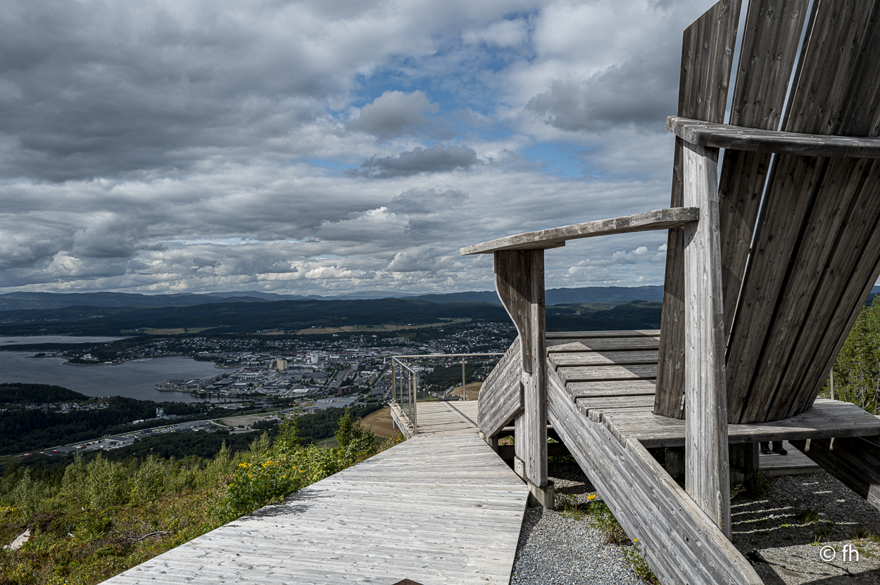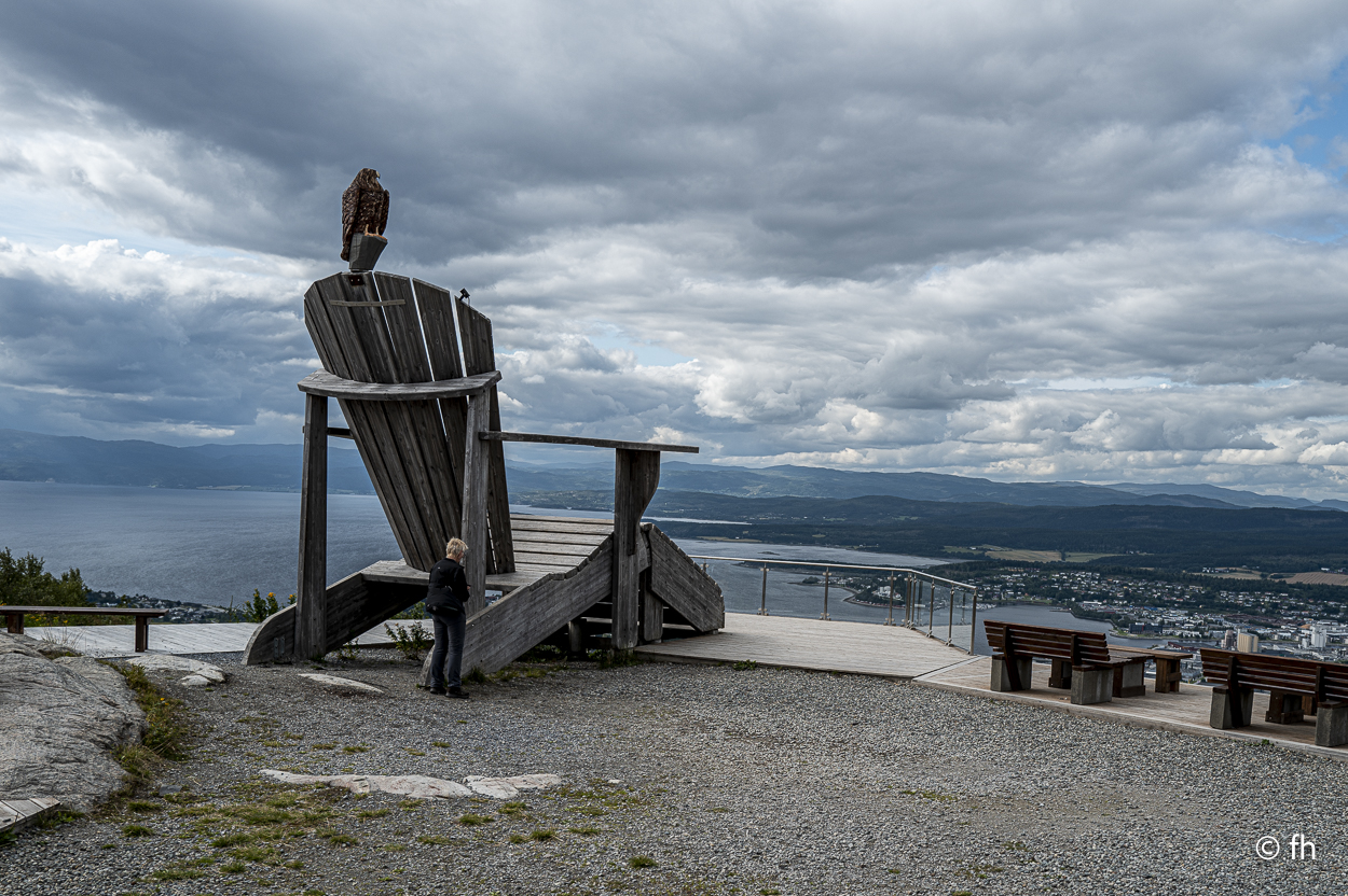 Was soll ich sagen, da standen doch heute meine Laufschuhe incl. Sportsachen vor meinem Bett. Soll heißen, Christel meint ich sollte mich bewegen. Nach 6,5 km entlang einer alten Bahnstrecke konnte ich zwischen den Schienen, die alle noch im Original dort lagen, meine Runde drehen. Das Frühstück hatte ich mir verdient. Danach führte uns der Weg nach Steinkjer, zu dem größten Gartenstuhl der Welt. Der steht allerdings auf dem Berg Oftennåsen. Der Stuhl ist 4,75 Meter hoch und wiegt 2,5 Tonnen. Wie schon gesagt, der Stuhl steht auf einem Berg. Vom Parkplatz aus kann man zwei Wege wählen, jeweils 2,5 km. Es ist ein Rundkurs von ca. 5 km Länge. Wie wir wissen, sind die Angaben im Internet mit Vorsicht zu genießen, denn du kennst den Schreiber nicht. So auch heute. So war zu lesen, dass der Weg gegen den Uhrzeigersinn zum Stuhl der schwierigere ist. Es soll steil werden. Der Weg vom Stuhl bergab im Uhrzeigersinn sollte der leichtere sein. Wir haben uns für das hochgehen die schwere Variante ausgesucht, um es dann bergab leichter zu haben. Bergauf war es sehr steil, so wie angegeben, aber was uns da auf dem vermeintlich leichterem bergab erwartete, war teilweise noch steiler als bergauf. Wir hatten Schwierigkeiten auf dem Kies nicht auszurutschen. Ohne Beulen, aber ziemlich platt, haben wir den Parkplatz erreicht.