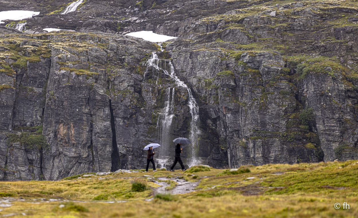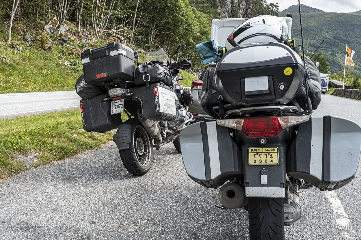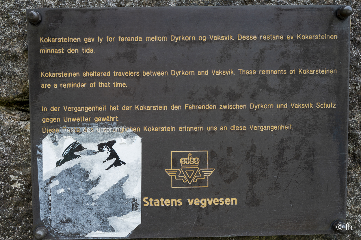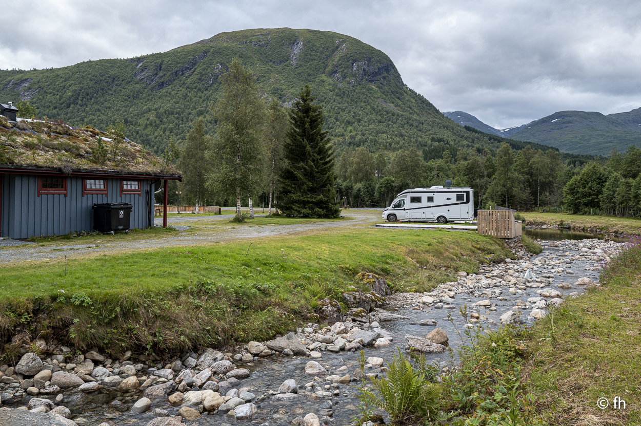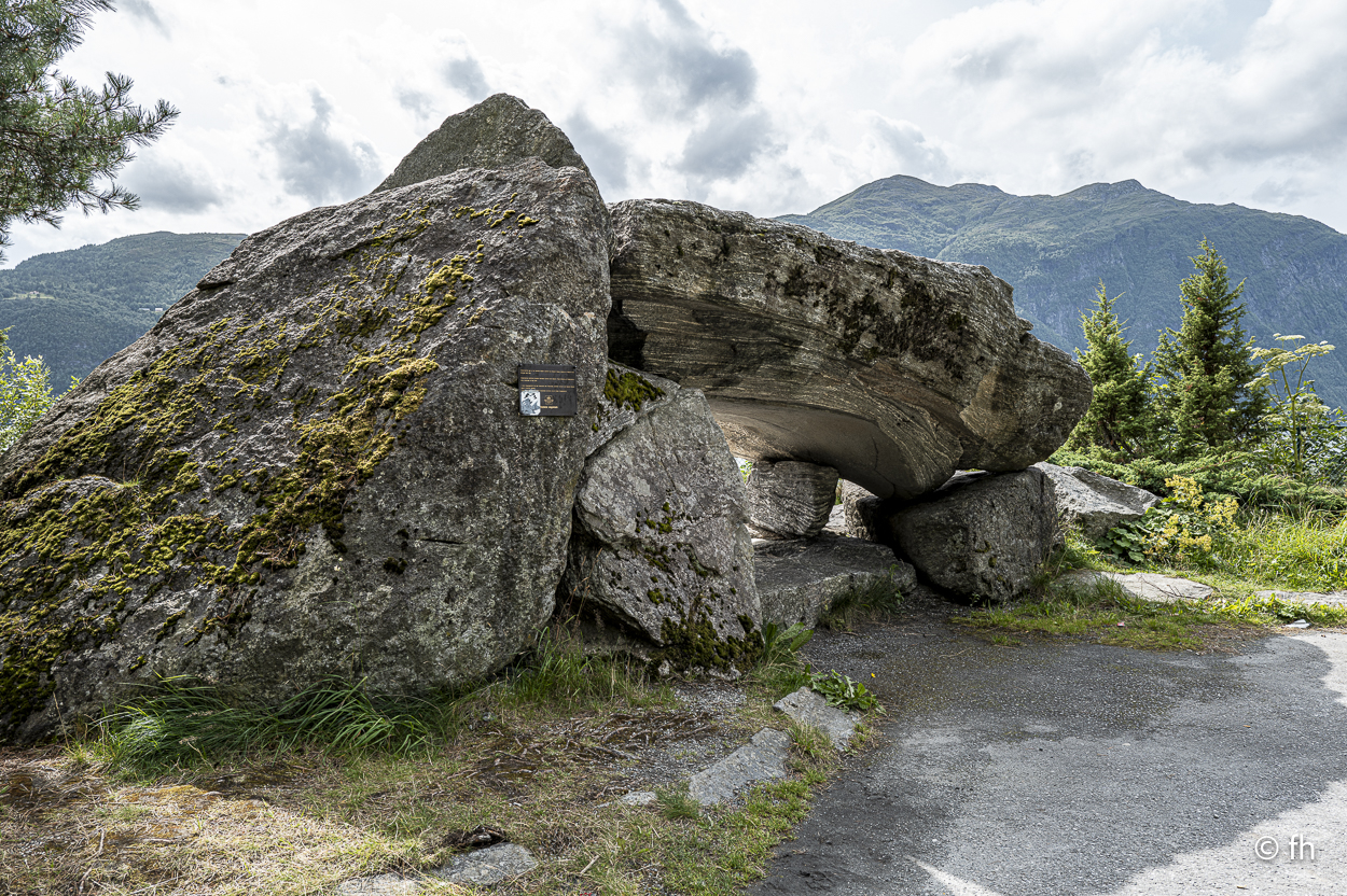Du darfst hier, ohne besondere Vorkenntnisse, an der See Angeln. Bei Binnengewässern ist das wohl nicht erlaubt. So haben uns Angler aus Norddeutschland berichtet. Na ja, wie dem auch sei. Gestern Abend konnten wir beobachten, dass es wohl auch den ungeübtesten Angler gelingt innerhalb von wenigen Minuten einen dicken Fisch an Land zu ziehen. Das Zerlegen desselben, war aber dann eine mittlere Katastrophe. Deshalb angeln wir nicht, weil wir nicht wissen wie es geht. Wir essen die leckeren Fischfrikadellen aus dem COOP. Bei einem Zwischenstopp auf unserer Fahrt nach Horndøla haben wir die beiden Biker aus Kuwiat, die wir an der Atlantikstraße kennengelernt haben, wieder getroffen. Die Welt ist ein Dorf. Auf dem Campingplatz in Horndøla waren wir die einzigen Gäste, allein mit dem Platzwart. Da wir vor hatten am nächsten Tag, also Donnerstag, auf den nahe gelegen Berg zu gehen, haben wir uns beim Chef erkundigt, wie weit ist es, wie schwierig zu gehen usw. Er kam aus dem Reden nicht mehr heraus. Bis zu dem Punkt, in dem er uns anbot ein Stück der Straße zu zeigen, zumindest so weit, wie man mit dem Auto kommt. Es war so gegen 22:30 Uhr und ab ging die Fahrt. Bis zu seinem Wochenendhäuschen, das er uns dann auch noch zeigen musste. Der Campingplatz liegt an der Horndøla-Brücke. Es ist eine alte Steinbrücke und wird nur noch von Touristen besichtigt. Am Ende der Brücke befindet sich ein Ring aus Stein, der sogenannte Heirats- und Jungfrauenstein.