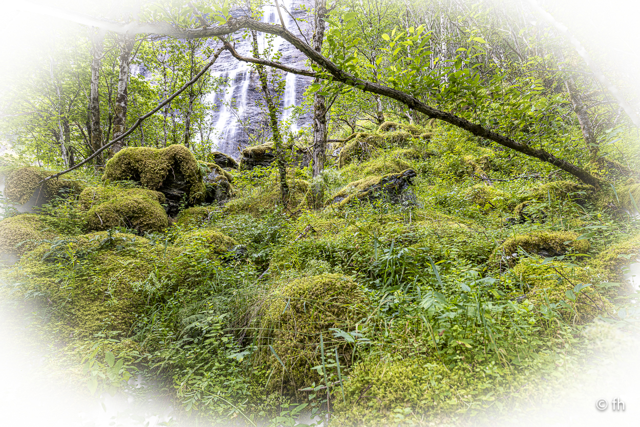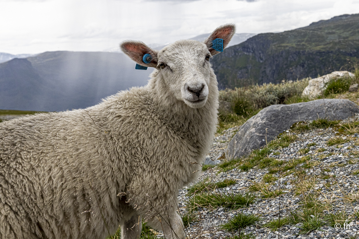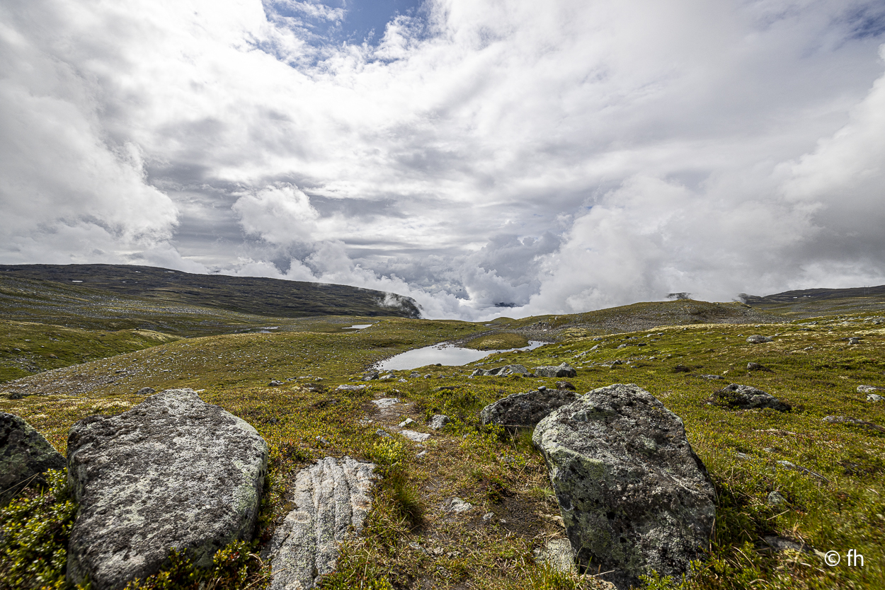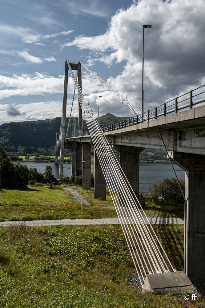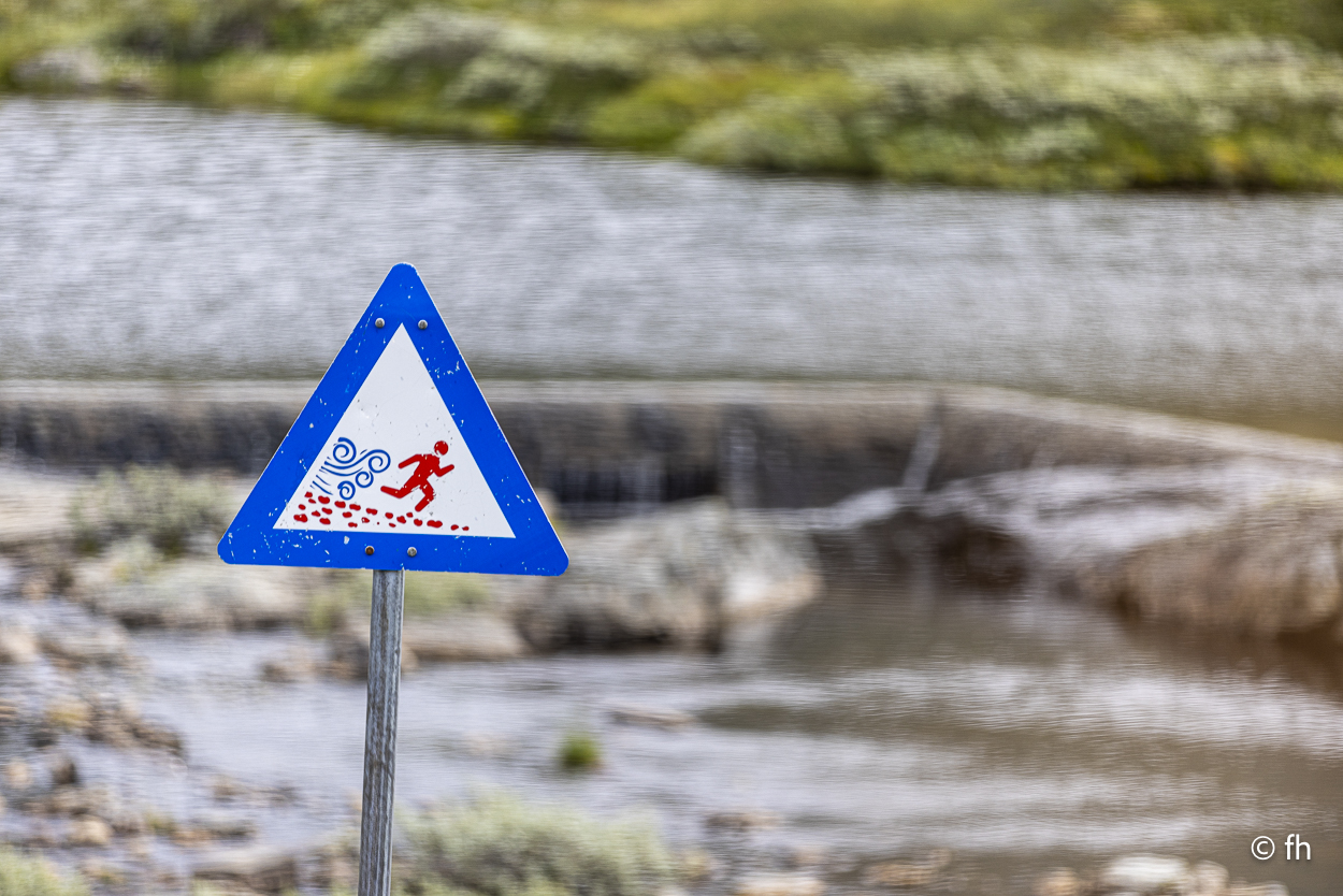 Du darfst hier, ohne besondere Vorkenntnisse, an der See Angeln. Bei Binnengewässern ist das wohl nicht erlaubt. So haben uns Angler aus Norddeutschland berichtet. Na ja, wie dem auch sei. Gestern Abend konnten wir beobachten, dass es wohl auch den ungeübtesten Angler gelingt innerhalb von wenigen Minuten einen dicken Fisch an Land zu ziehen. Das Zerlegen desselben, war aber dann eine mittlere Katastrophe. Deshalb angeln wir nicht, weil wir nicht wissen wie es geht. Wir essen die leckeren Fischfrikadellen aus dem COOP. Bei einem Zwischenstopp auf unserer Fahrt nach Horndøla haben wir die beiden Biker aus Kuwiat, die wir an der Atlantikstraße kennengelernt haben, wieder getroffen. Die Welt ist ein Dorf. Auf dem Campingplatz in Horndøla waren wir die einzigen Gäste, allein mit dem Platzwart. Da wir vor hatten am nächsten Tag, also Donnerstag, auf den nahe gelegen Berg zu gehen, haben wir uns beim Chef erkundigt, wie weit ist es, wie schwierig zu gehen usw. Er kam aus dem Reden nicht mehr heraus. Bis zu dem Punkt, in dem er uns anbot ein Stück der Straße zu zeigen, zumindest so weit, wie man mit dem Auto kommt. Es war so gegen 22:30 Uhr und ab ging die Fahrt. Bis zu seinem Wochenendhäuschen, das er uns dann auch noch zeigen musste. Der Campingplatz liegt an der Horndøla-Brücke. Es ist eine alte Steinbrücke und wird nur noch von Touristen besichtigt. Am Ende der Brücke befindet sich ein Ring aus Stein, der sogenannte Heirats- und Jungfrauenstein.