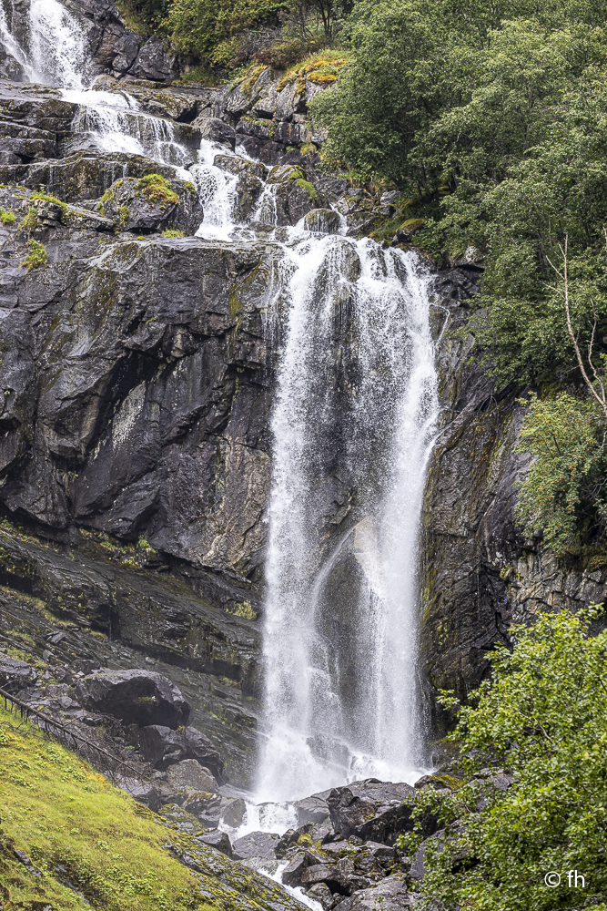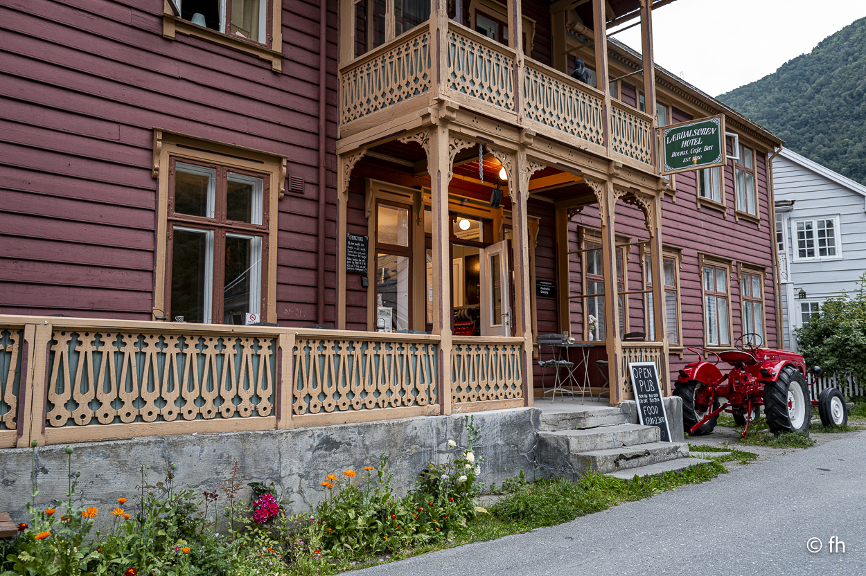 Das Highlight heute war der der Åsafossen Wasserfall In Vassbakken. Ein Energieunternehmen wollte den Fluss Asaeivi nutzen, um mit der Wasserkraft Strom zu erzeugen. Zum Schutz der Landschaft, des Tourismus und der Outdoor-Aktivitäten lehnte die norwegische Energiedirektion aber den Antrag 2015 ab. Deshalb konnten wir den Wasserfall heute noch in seiner vollen Pracht sehen. Den Ort Lærdalsøyri kennen wir noch aus dem letzten Jahr. Der Campingplatz ist aber neu für uns. Ein schöner Platz, nahe der Stadt mit einem Restaurant. Sehr gut. Mal sehen was da so auf der Speisenkarte steht. Pizza.. Das ist es! Nachdem wir uns eine Pizza geteilt haben, denn wir wollten wegen der Figur nicht so viel essen, haben wir das gleiche noch einmal bestellt. Es war einfach zu lecker. Der Verdauungsspaziergang ging dann in die Altstadt von Lærdalsøyri. Alte Hotels, altes Postamt, Holzhäuser, alles was man sich so vorstellen kann in einem alten Dorf. Dann noch einen Absacker in einer Hotelbar. Was man so Bar nennt. Ne Dose Bier auf die Hand, ohne Glas, im Garten hinter dem Haus. Ein Hotel von und für Autoliebhaber. Alles voller Fotos und Accessoires aus vergangen Zeiten. Nachdem wir uns mit dem Barkeeper über die schönsten Autos ausgetauscht haben, zeigte er uns die Privatbar, in der sich der Autoclub regelmäßig trifft. Auf unseren Reisen hatten wir immer wieder mal das Glück, dass uns die Menschen ihre privaten Dinge gezeigt haben.