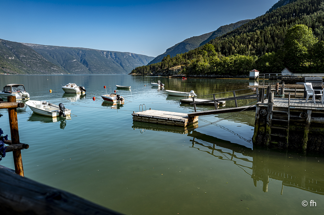 Solvorn ist wirklich ein verschlafenes Dorf. Wir haben heute Morgen um 8:00 Uhr das Fenster in unserem Schlafzimmer geöffnet, um die aufgehende Sonne zu genießen. Kein Ton hier in dem Dorf, kein Auto einfach nix. Außer zwei Vögel, die sich über eine längere Distanz unterhalten haben. Einer war sehr laut zu hören und sein Kumpel war aufgrund der Distanz entsprechend leiser. Die haben den üblichen Dorftratsch gehalten.