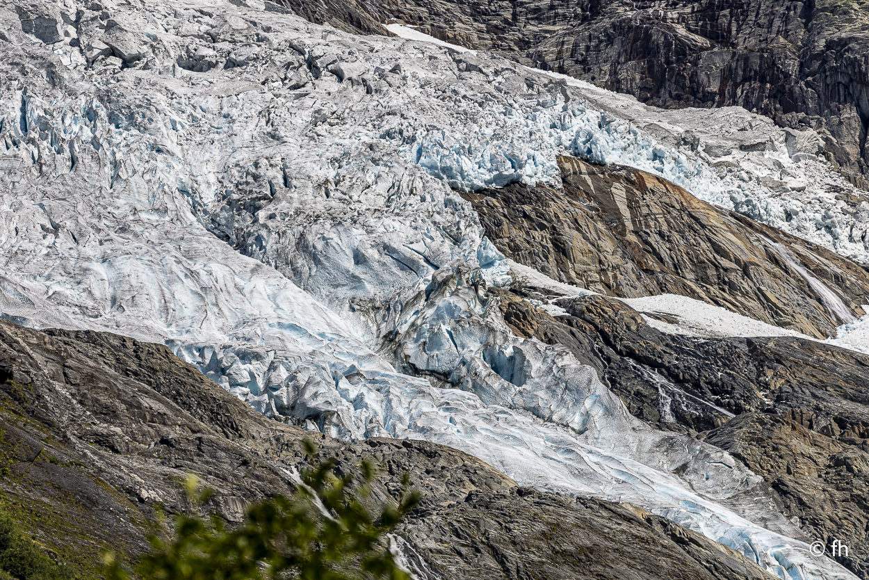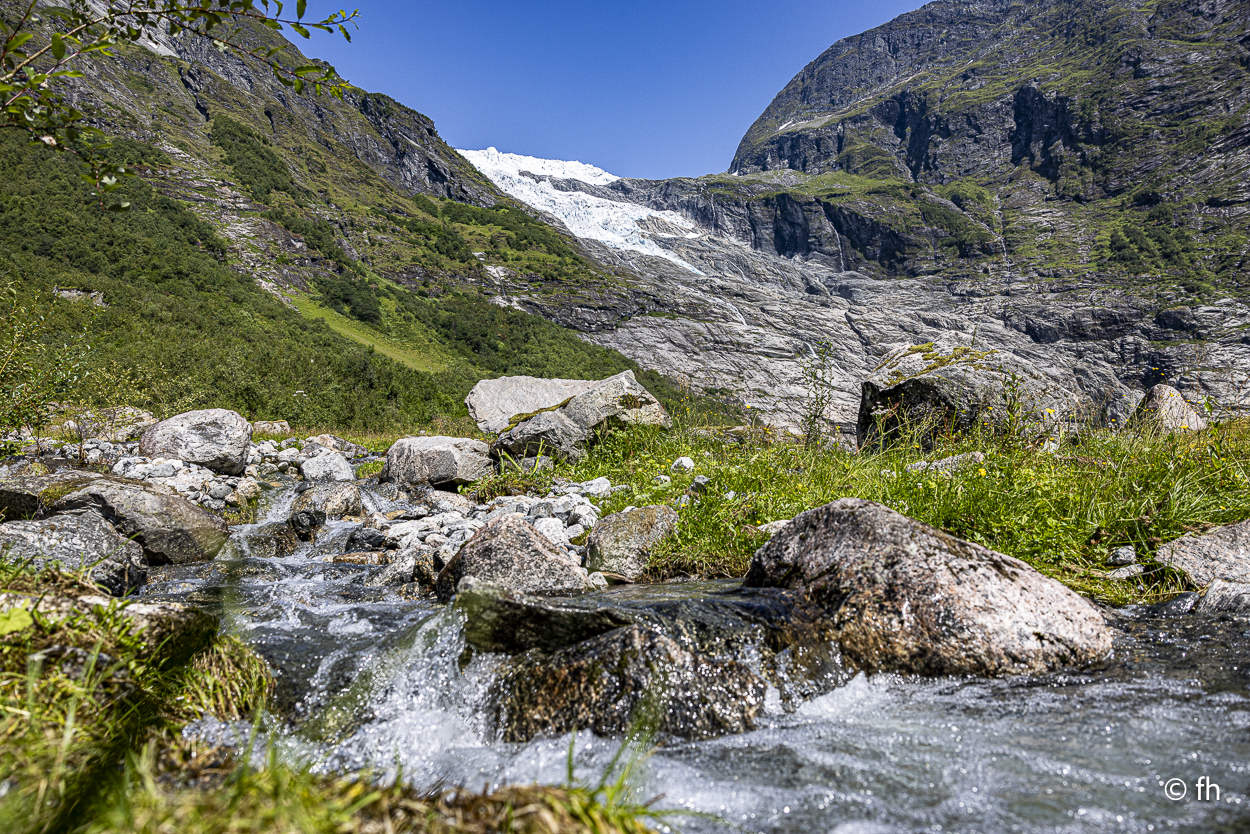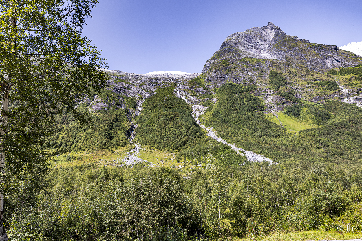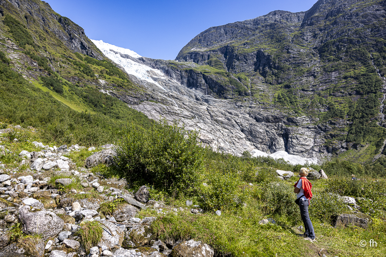 Gestern ging es, wie schon gesagt, auf den Berg. Nichts Spektakuläres, einfach mal einen Tag Pause ohne Fahrdienst. Nach einem Frühstück im schönsten Sonnenschein ging es zu dem Bøya-Gletscher. Der Gletscher liegt in einem Gebiet, in dem es vor Gletschern nur so wimmelt. Diese Region ist die gletscherreichste in Norwegen. Zum Bøya kommt man mit dem Auto am nächsten. Die anderen muss man sich mit langen Fußmärschen hart erarbeiten. Das haben wir im letzten Urlaub erledigt. Da waren wir bis an den Gletscher, ein beeindruckendes Erlebnis. Das haben wir uns heute gekniffen. Das Tagesziel liegt in einem verträumten Ort namens Solvorn. Einen tollen Platz haben wir hier mit Blick über den Ort und auf den Fjord.