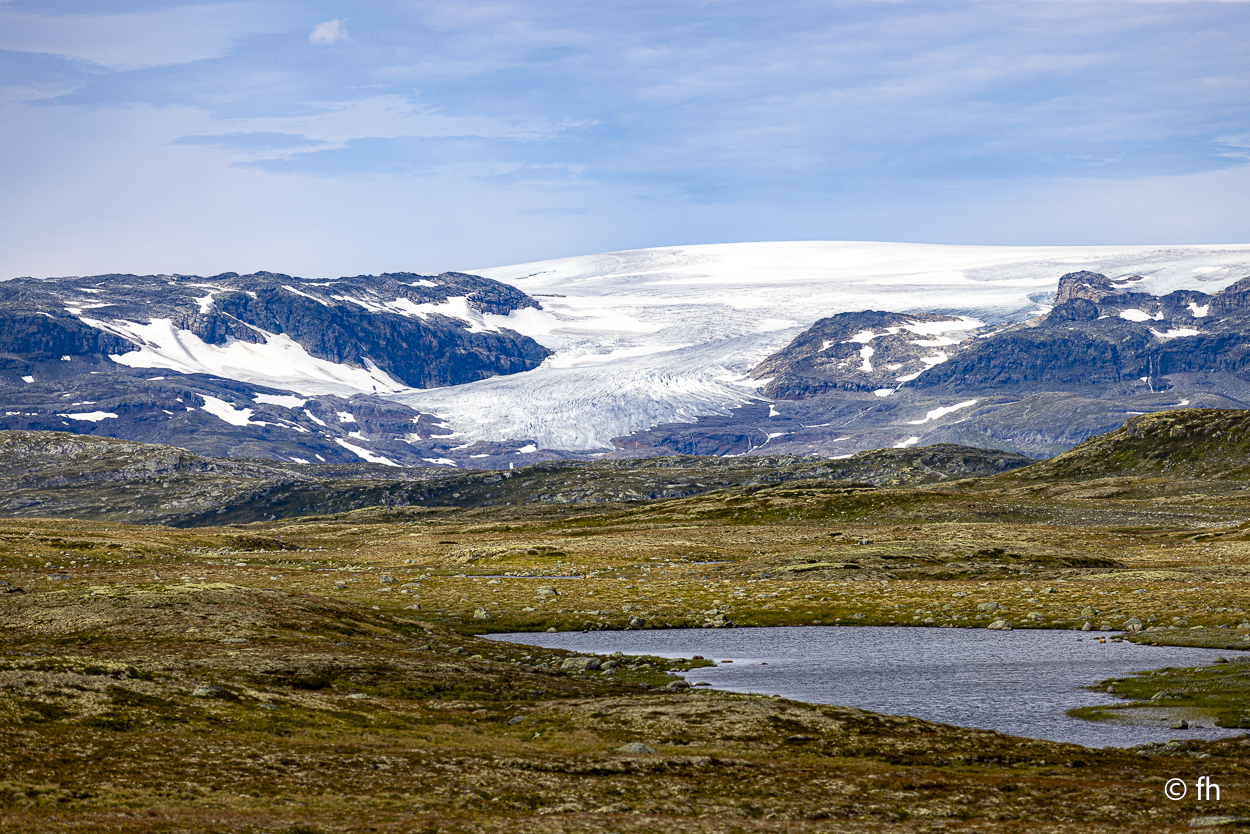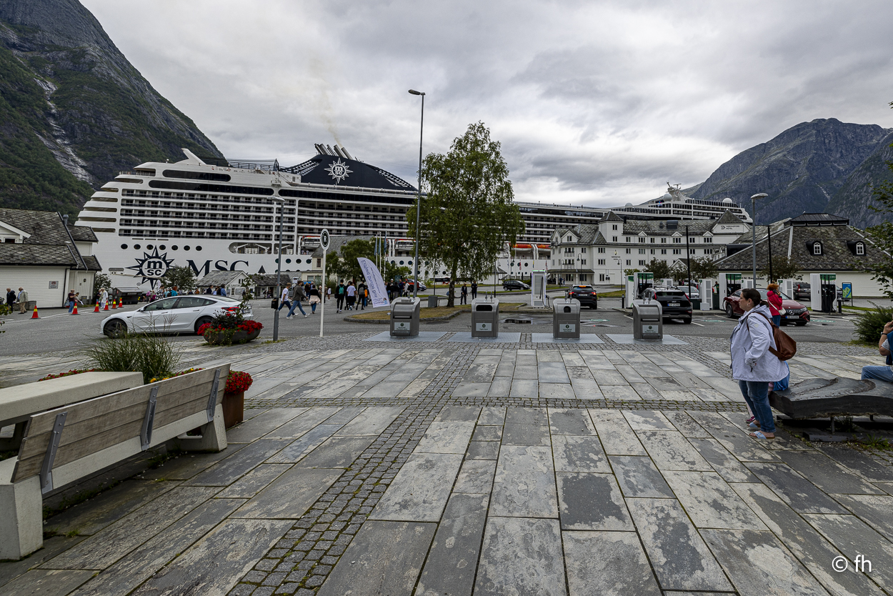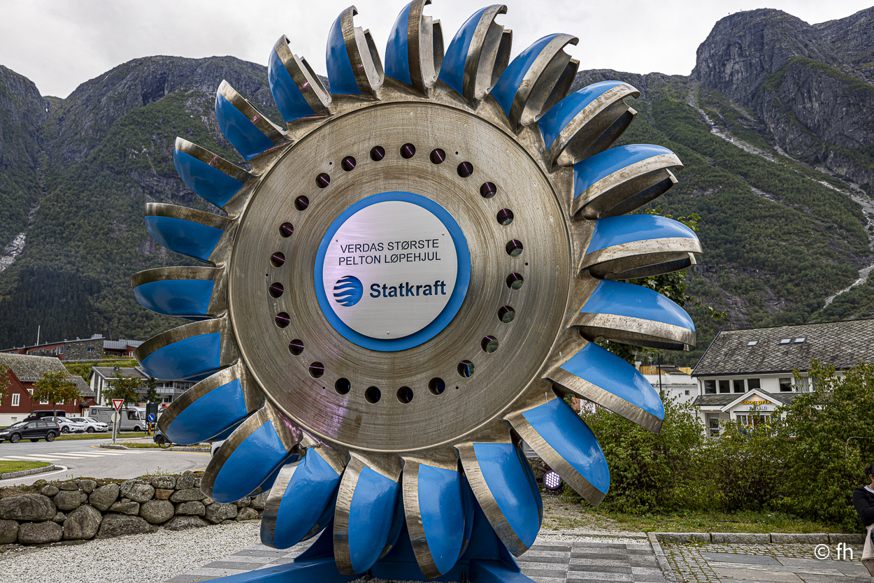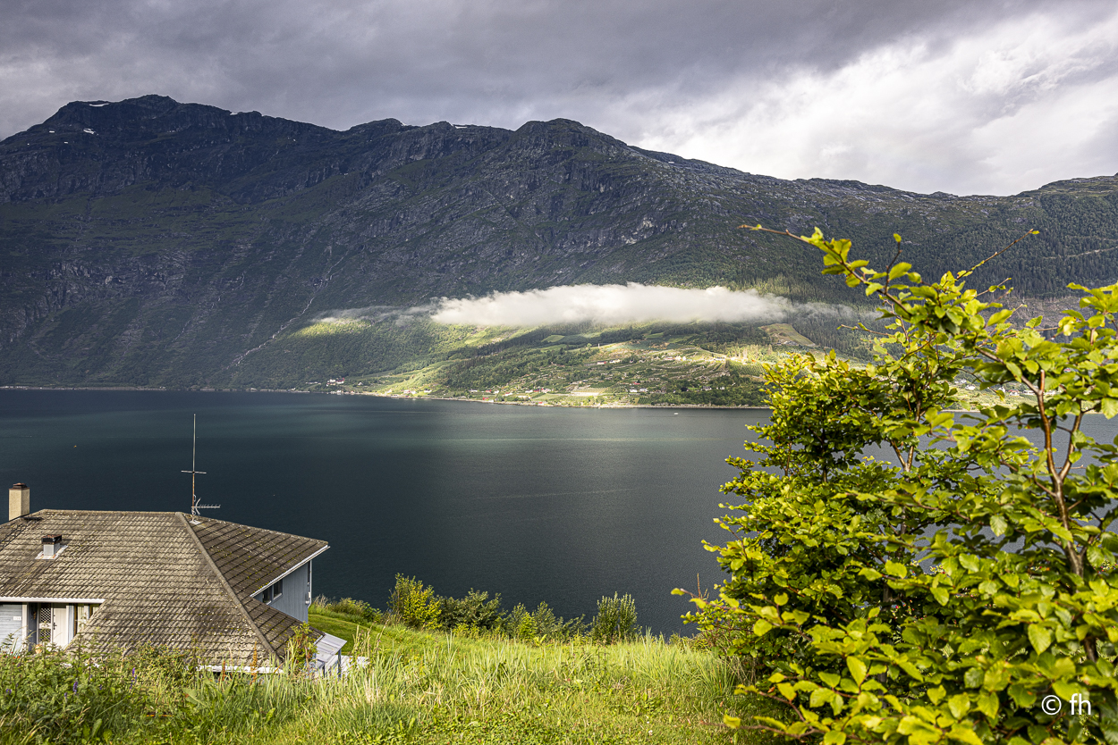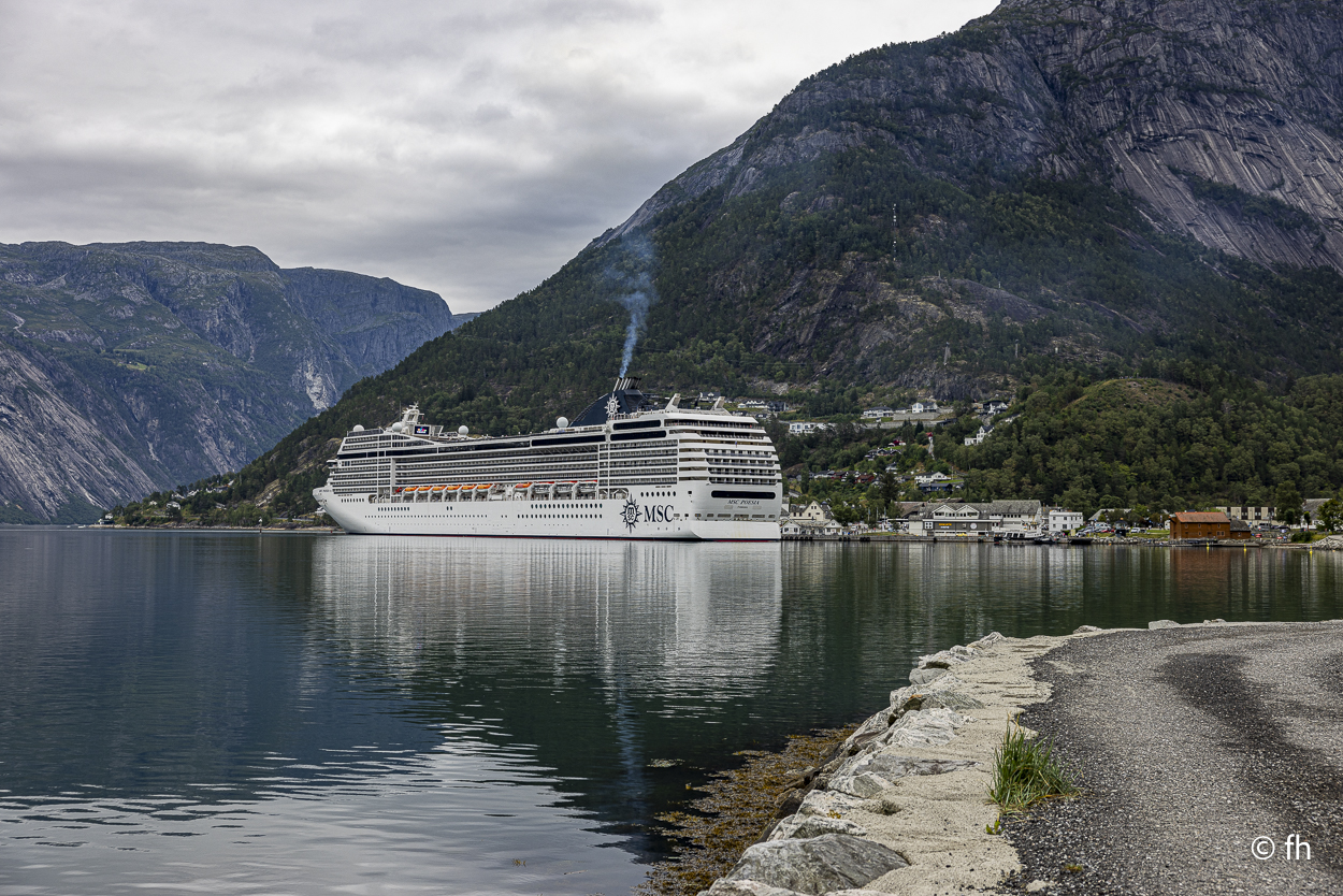 Ein beeindruckendes Bild dieser Wasserfall, besonders die Treppe, die über den Wasserfall führt. Für mich war die Treppe eine besondere Herausforderung, denn ich bin nicht schwindelfrei. Jetzt stehen wir am Eidfjord, eingerahmt von einem Massiv aus Bergen rundherum und vor uns der Fjord. Wir genießen den ungetrübten Blick auf das Wasser.