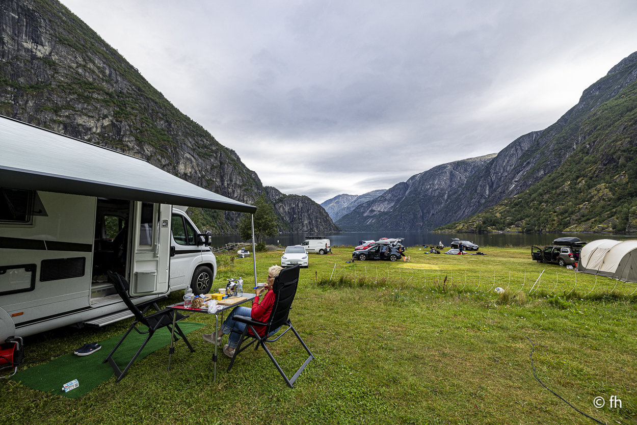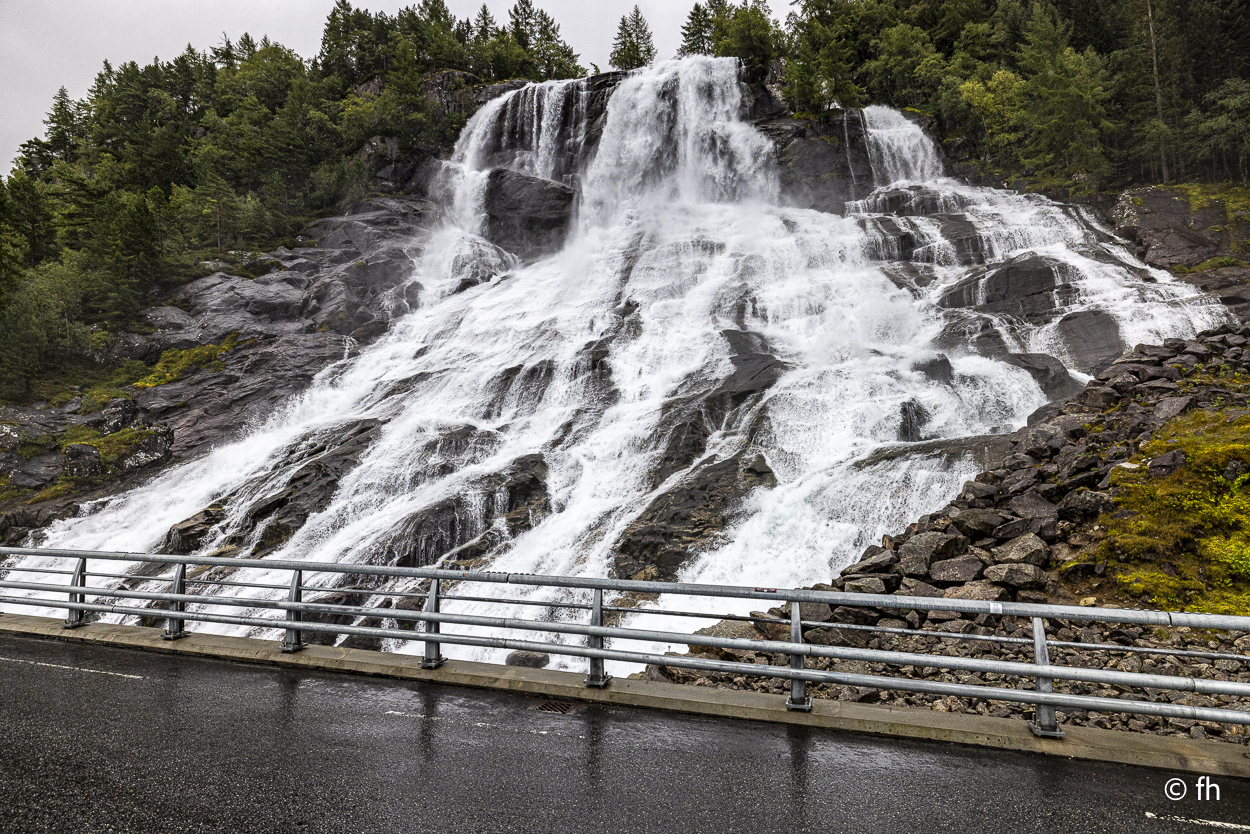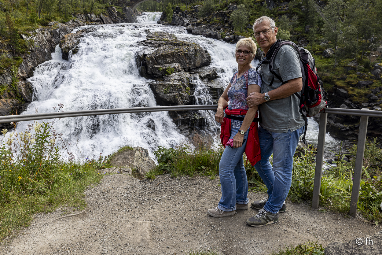 Nach der Fahrt gestern ging es noch mal in die Laufschuhe. Die vielen Kanelboller (Zimtschnecken) müssen verarbeitet werden. Die gibt es hier genauso, wie die Waffeln an jeder Ecke. Die Kanelboller sind fertig zum Verzehr, die Waffeln darfst du dir selbst belegen. Dazu stehen in der Regel zwei Schalen zur Verfügung, eine mit Sauerrahm und eine mit Marmelade. Du kannst dir damit die Waffel nach Bedarf vollpacken. Das haben wir fast jeden Tag auf dem Programm. So auch heute. Danach stand der Besuch des meistbesuchten Wasserfalls Norwegens auf dem Programm. Wir hatten bedenken, dass wir im Trubel der Menschen untergehen. Die Parkplatzsituation ist dann meist auch nicht besonders, vor allem mit einem 7,40 Meter langen Wohnmobil. Nichts davon ist eingetreten. Parkplätze genug und Besucher in überschaubarer Menge.