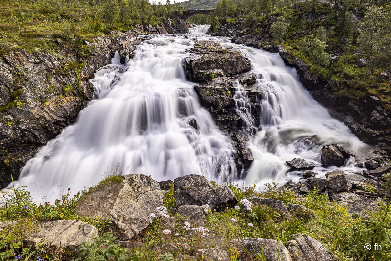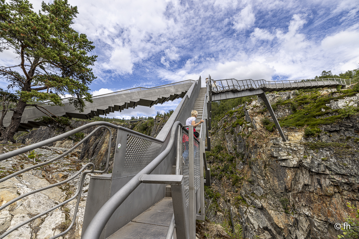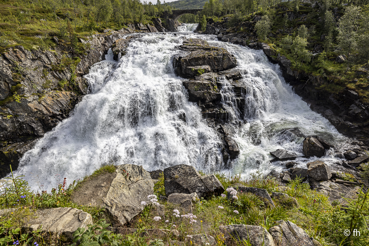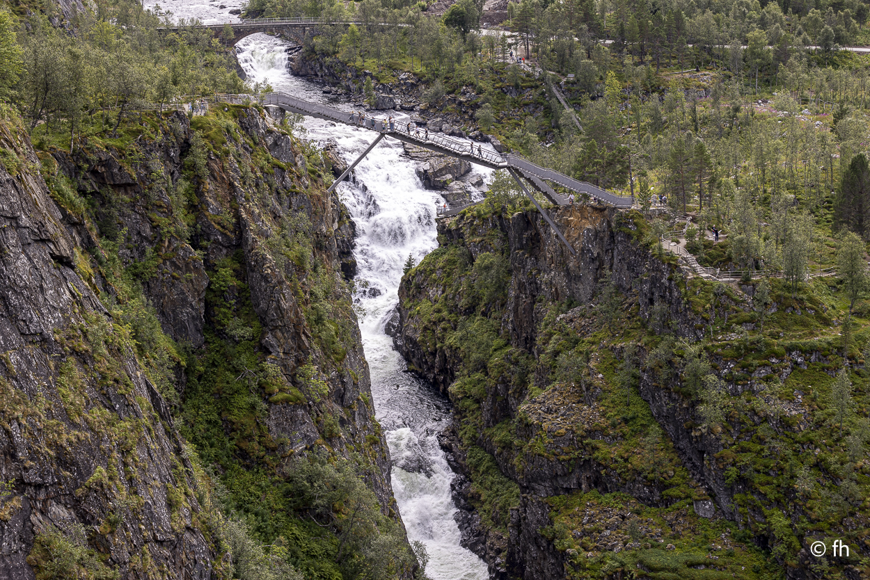 Nach der Fahrt gestern ging es noch mal in die Laufschuhe. Die vielen Kanelboller (Zimtschnecken) müssen verarbeitet werden. Die gibt es hier genauso, wie die Waffeln an jeder Ecke. Die Kanelboller sind fertig zum Verzehr, die Waffeln darfst du dir selbst belegen. Dazu stehen in der Regel zwei Schalen zur Verfügung, eine mit Sauerrahm und eine mit Marmelade. Du kannst dir damit die Waffel nach Bedarf vollpacken. Das haben wir fast jeden Tag auf dem Programm. So auch heute. Danach stand der Besuch des meistbesuchten Wasserfalls Norwegens auf dem Programm. Wir hatten bedenken, dass wir im Trubel der Menschen untergehen. Die Parkplatzsituation ist dann meist auch nicht besonders, vor allem mit einem 7,40 Meter langen Wohnmobil. Nichts davon ist eingetreten. Parkplätze genug und Besucher in überschaubarer Menge.