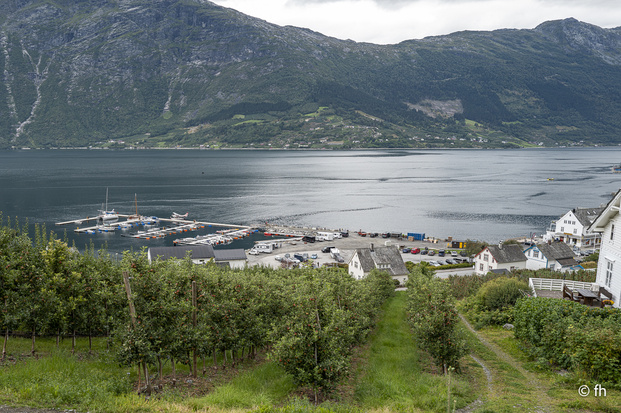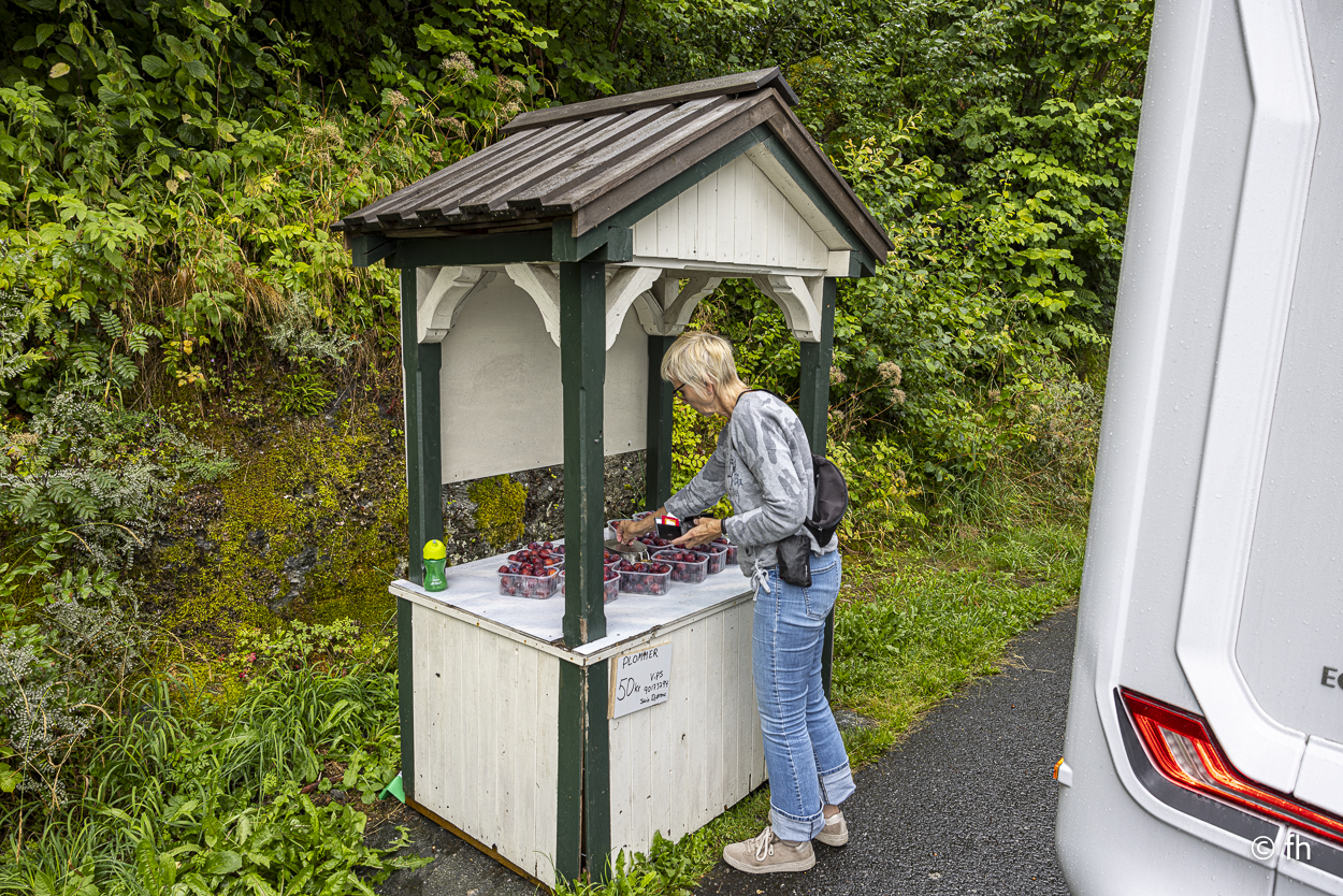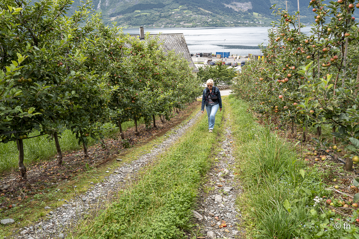 Wir sind bis jetzt 6000 Kilometer durch Finnland und Norwegen gefahren. Unsere Reise neigt sich langsam dem Ende zu. Noch knapp eine Woche dann sind wir, wenn das Auto mitmacht, wieder Zuhause. Bis nach Oslo sind es von Lofthus noch gut 350 km, aber das wäre der direkte Weg. Wir machen daraus locker noch einmal 1000 Kilometer. Denn es gibt hier noch SOOOVIEL zu sehen. Das Land ist unglaublich vielfältig. Gebiete wo du durch endlose Waldgebiete fährst. Dann die kargen, nur mit Steinen bedeckten Landstriche. Gefolgt von den unzähligen Fjorden, in denen die Straßen immer direkt am Ufer verlaufen. Links die steilen Berghänge und rechts das Wasser, oder umgekehrt. Heute haben wir auf unserer kurzen Tagesetappe, die war nur 60 Kilometer lang, einen Landstrich mit Obstbäumen befahren. Obstplantagen soweit das Auge reicht. Es sollen mehr als eine halbe Million sein. Wir haben Sie nicht gezählt. Aber du kannst hier an den Ständen direkt am Straßenrand die Früchte kaufen. Manchmal mit Personal am Stand oder ohne Personal, dann steht da eine Blechdose für das Bargeld und eine Preistafel. Das nennt man Vertrauen in die Kundschaft. Hier in Lofthus gibt ein kleines Freilichtmuseum des Schriftstellerpaars Ingrid und Bernhard Greves. Von hier oben am Museum hat man einen super Blick über den Fjord und die Obstplantagen. Der Besuch in einem Obstbauernladen war für den Obstbauern ein voller Erfolg. Es gab Marmelade und das ein oder andere Cider-Fläschchen zu kaufen. Jetzt stehen wir oberhalb der Obstplantagen in Lofthus auf einem Campingplatz. Dort stehen selbstverständlich auch Obstbäume und unter den Bäumen die Camper. Das Obst hier an den Bäumen steht jedem zur freien Verfügung.