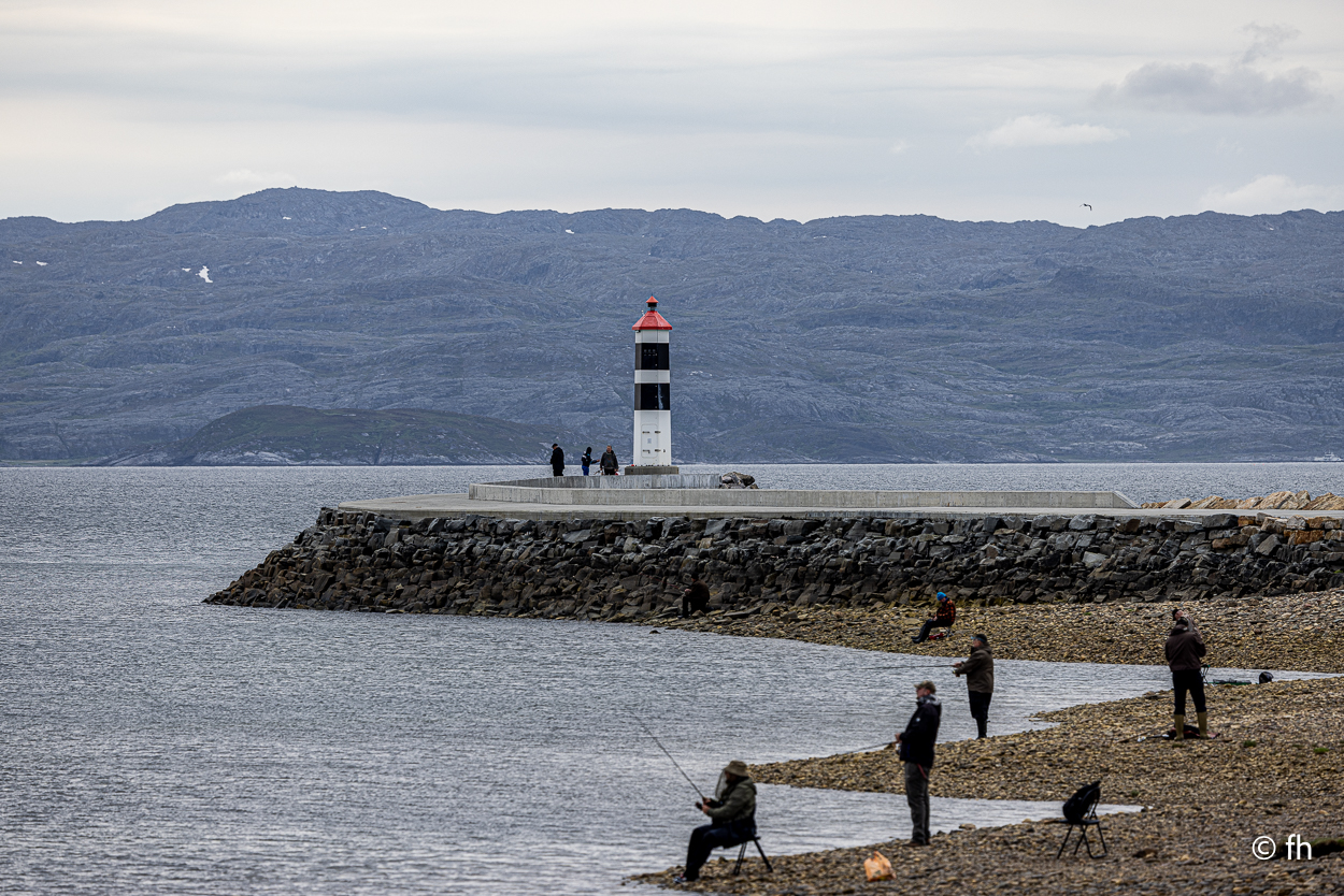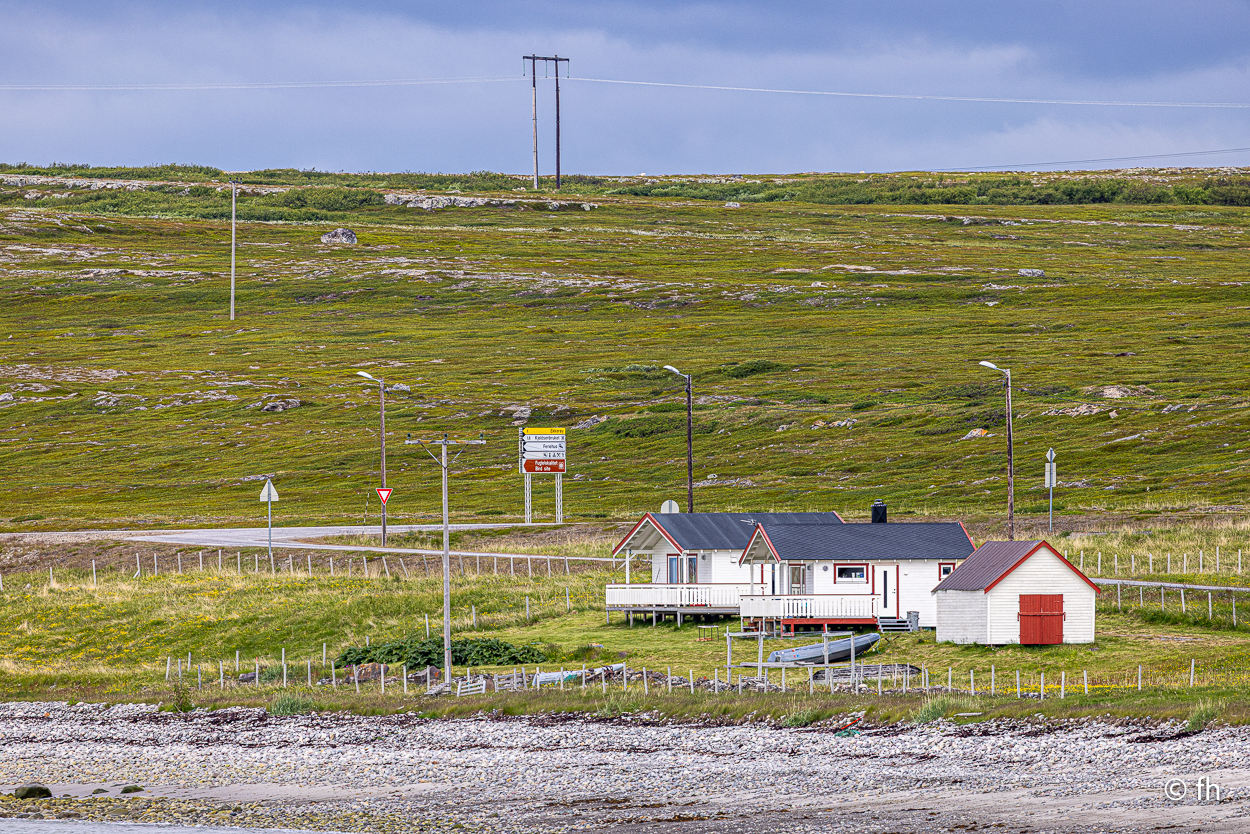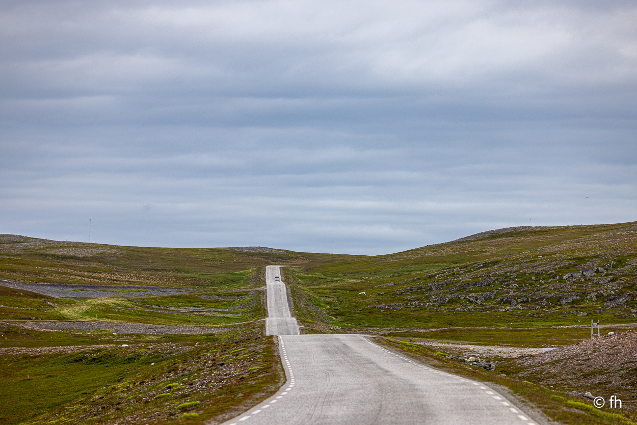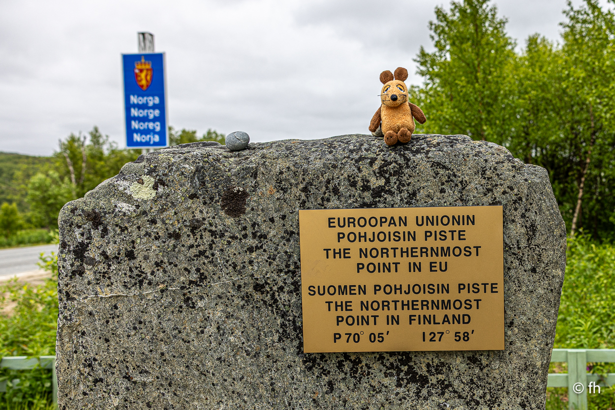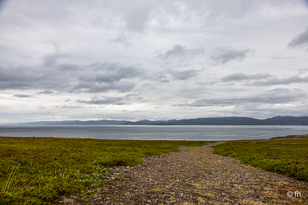 Nachdem wir die Nacht in einem nicht perfekt ausgerichteten Wohnmobil verbracht haben, ich bin immer zum Fußende des Bettes gerutscht, ging die Fahrt wie geplant nach Hamningberg. Der Weg führte uns über den nördlichsten Punkt in Finnland, der auch gleichzeitig die Grenze zu Norwegen markiert. Nach 50 Kilometer war die Grenze in Nuorgam zu Norwegen erreicht. Je weiter wir Richtung Norden fahren, werden die Bäume kleiner und die Landschaft wird übersichtlicher. Wir erreichen die Küste vom Eismeer (Varangerfjord). Die Fahrt nach Hamningberg verläuft entlang der Landschaftsroute Varanger. Die Sonne scheint. Es ist wunderschön hier, wenn man das Karge und die Einsamkeit mag. Landschaft so weit das Auge reicht. Die erste Waffel mit Käse gab es in einem Museum in der Gemeinde Nesseby. Der nächste Stopp war eine Halbinsel in Ekkørøy. Auf der Halbinsel kann man seltene Vögel beobachten, so steht es geschrieben. Wir haben wohl den falschen Zeitpunkt erwischt, die Vögel haben die Insel bereits verlassen. Nur Möwen und einige Rotschenkel haben wir gesehen. Ein Wanderer sagte uns, dass er vor zwei Jahren schon mal hier war, da war die Hölle los. Schade. Aber der 6,5 Kilometer lange Weg hat sich trotzdem gelohnt. Wir waren fast alleine unterwegs. Im Wasser kam dann noch ein Weißschnauzendelfin zum Vorschein. Wir denken das es ein Weißschnauzendelfin war. Die heutige Nacht verbringen wir direkt am Wasser ohne Campingplatz.