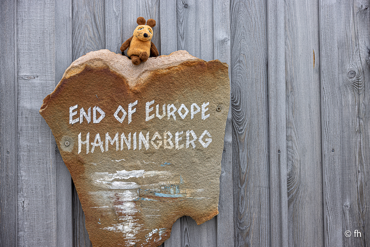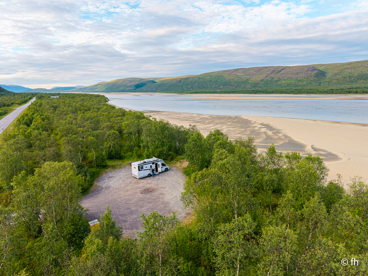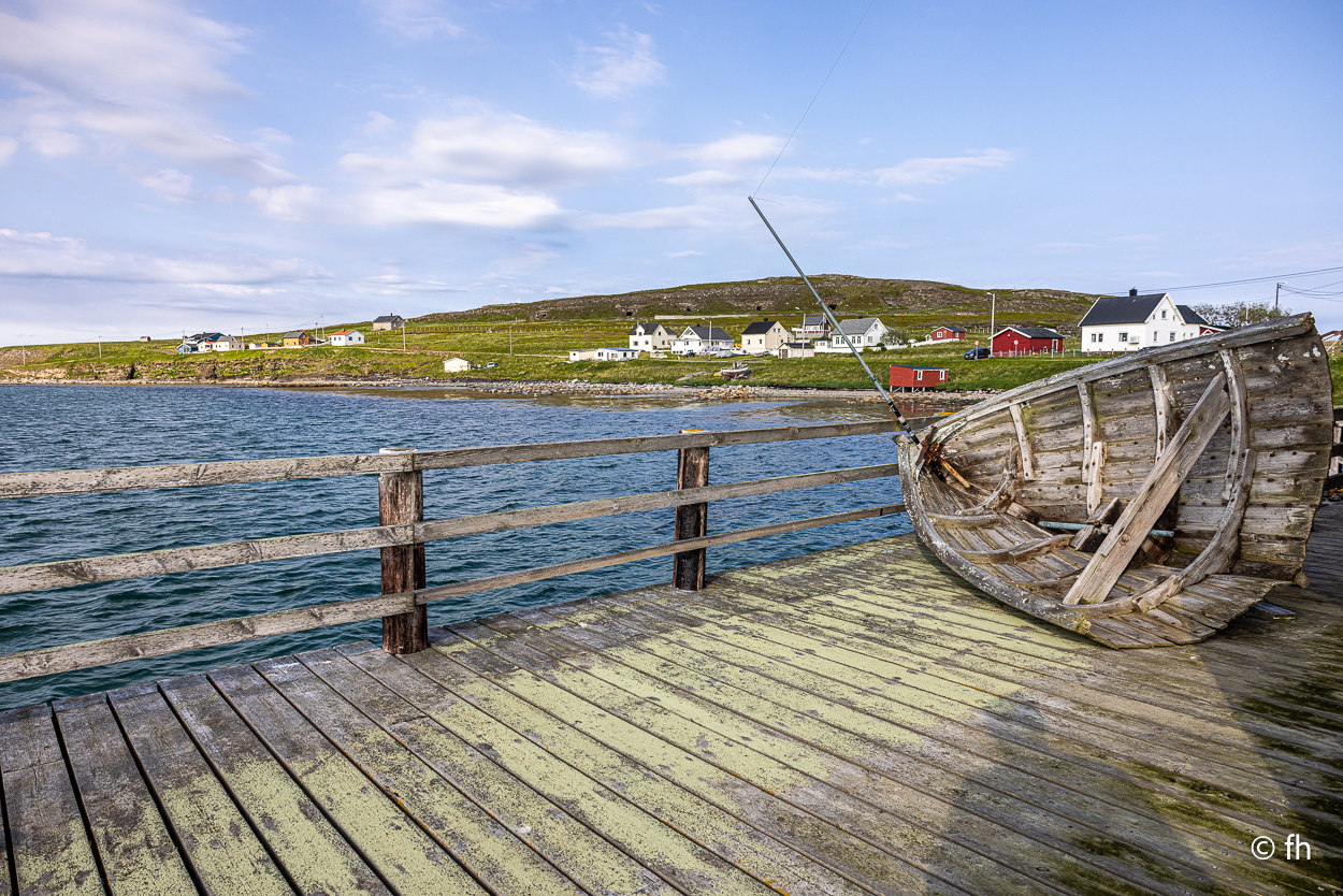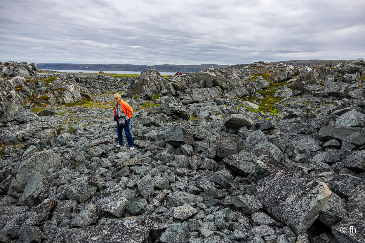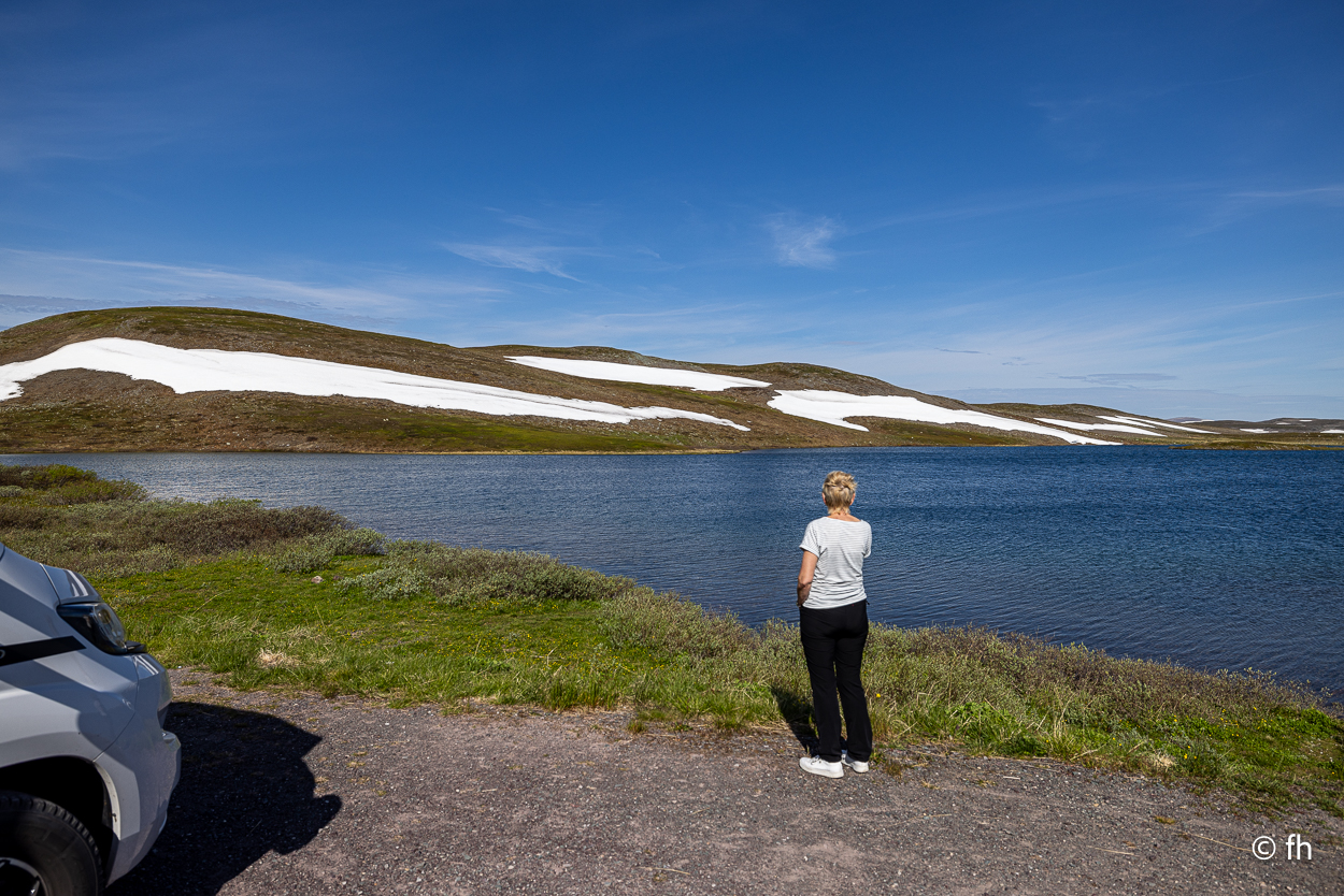 Nachdem wir die Nacht in einem nicht perfekt ausgerichteten Wohnmobil verbracht haben, ich bin immer zum Fußende des Bettes gerutscht, ging die Fahrt wie geplant nach Hamningberg. Der Weg führte uns über den nördlichsten Punkt in Finnland, der auch gleichzeitig die Grenze zu Norwegen markiert. Nach 50 Kilometer war die Grenze in Nuorgam zu Norwegen erreicht. Je weiter wir Richtung Norden fahren, werden die Bäume kleiner und die Landschaft wird übersichtlicher. Wir erreichen die Küste vom Eismeer (Varangerfjord). Die Fahrt nach Hamningberg verläuft entlang der Landschaftsroute Varanger. Die Sonne scheint. Es ist wunderschön hier, wenn man das Karge und die Einsamkeit mag. Landschaft so weit das Auge reicht. Die erste Waffel mit Käse gab es in einem Museum in der Gemeinde Nesseby. Der nächste Stopp war eine Halbinsel in Ekkørøy. Auf der Halbinsel kann man seltene Vögel beobachten, so steht es geschrieben. Wir haben wohl den falschen Zeitpunkt erwischt, die Vögel haben die Insel bereits verlassen. Nur Möwen und einige Rotschenkel haben wir gesehen. Ein Wanderer sagte uns, dass er vor zwei Jahren schon mal hier war, da war die Hölle los. Schade. Aber der 6,5 Kilometer lange Weg hat sich trotzdem gelohnt. Wir waren fast alleine unterwegs. Im Wasser kam dann noch ein Weißschnauzendelfin zum Vorschein. Wir denken das es ein Weißschnauzendelfin war. Die heutige Nacht verbringen wir direkt am Wasser ohne Campingplatz.