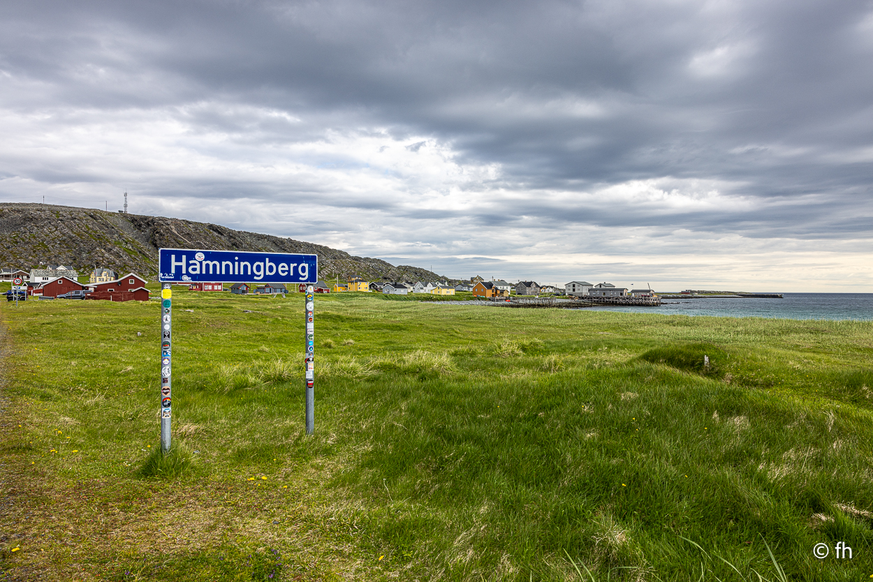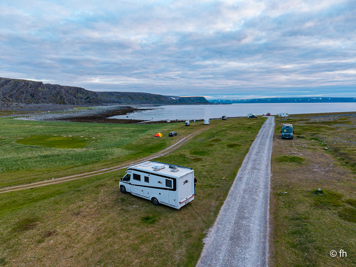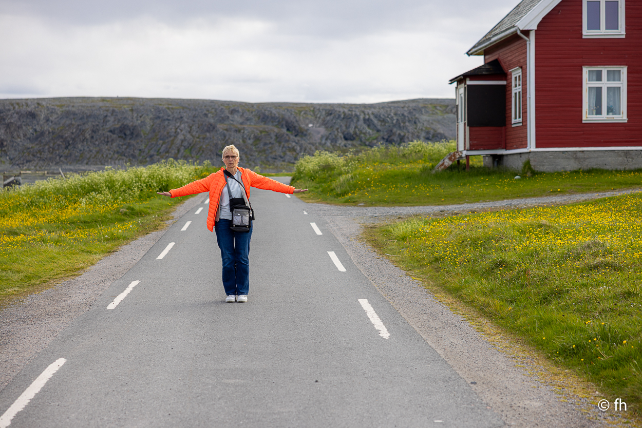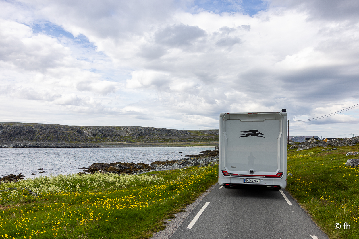Von Vardø noch Hamningberg waren es dann nur noch ca. 60 Kilometer. Das sollte heute noch möglich sein, bis ein Schild kam. Auf dem stand, dass die nächsten 28 Kilometer die Straße nur 3 Meter breit ist. Das heißt vor jeder Kurve langsam rantasten ob jemand entgegenkommt, um dann einen Platz am Rand zu finden der etwas breiter ist, damit zwei Fahrzeuge aneinander vorbei passen. Hamningberg ist eine Sackgasse, das heißt, dass es morgen auf derselben Straße zurück geht. Heute Nacht stehen wir, wie gestern Abend, mit einem grandiosen Ausblick am Wasser. Ach so, auch hier gibt es ein Café mit hervorragenden Waffeln und Kaffee. Da wir hinter dem Polarkreis sind, geht die Sonne nicht unter. Taschenlampen sind hier im Moment kein gutes Geschäft. Christel hat gestern Abend von dem Anblick nicht genug bekommen.
