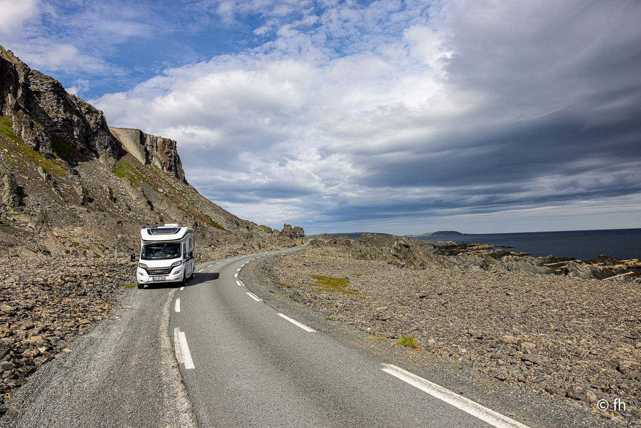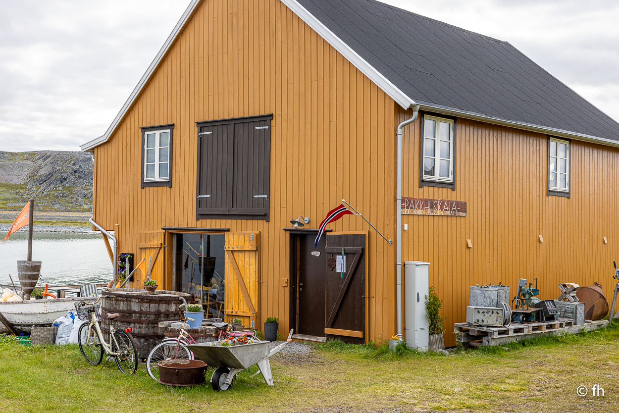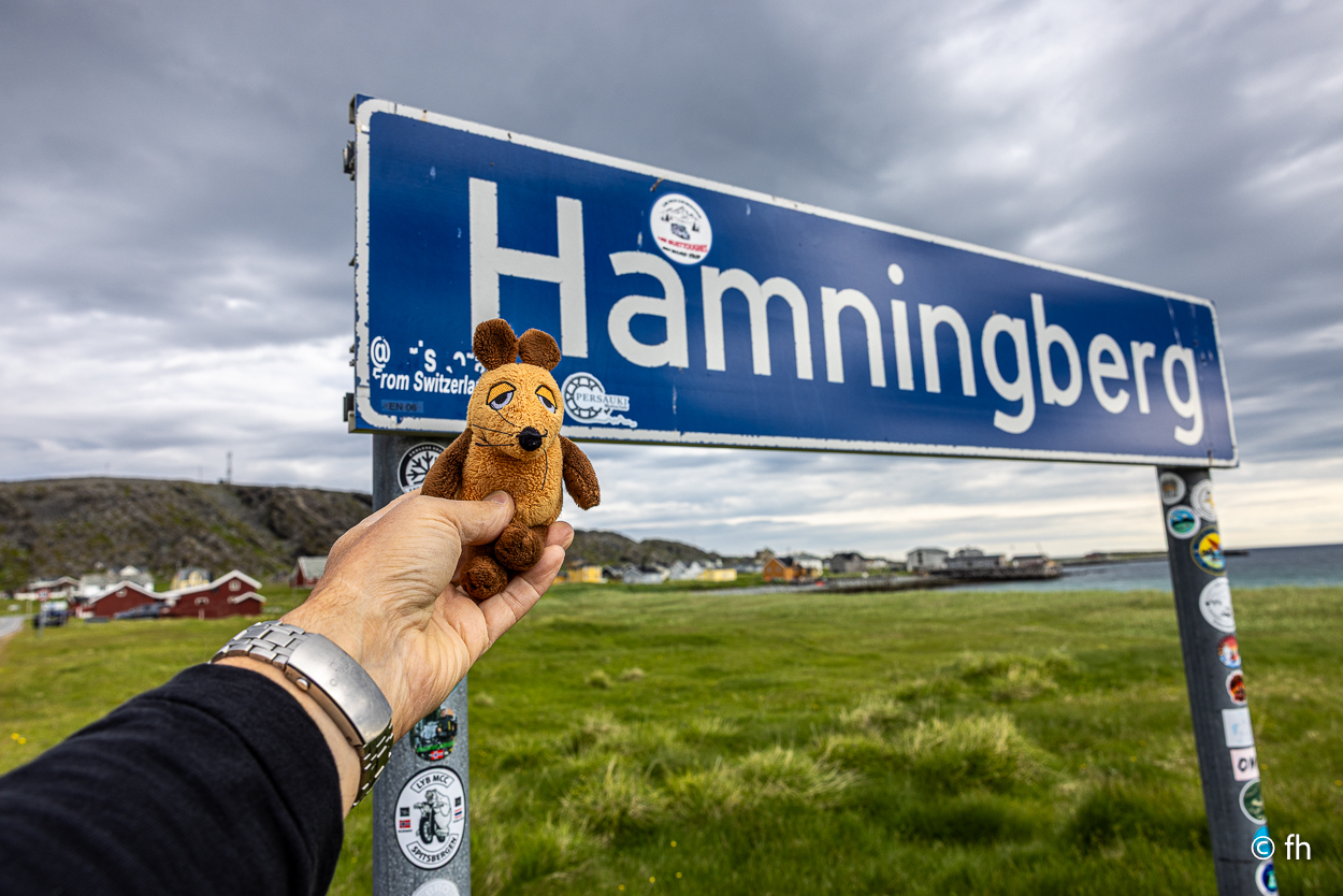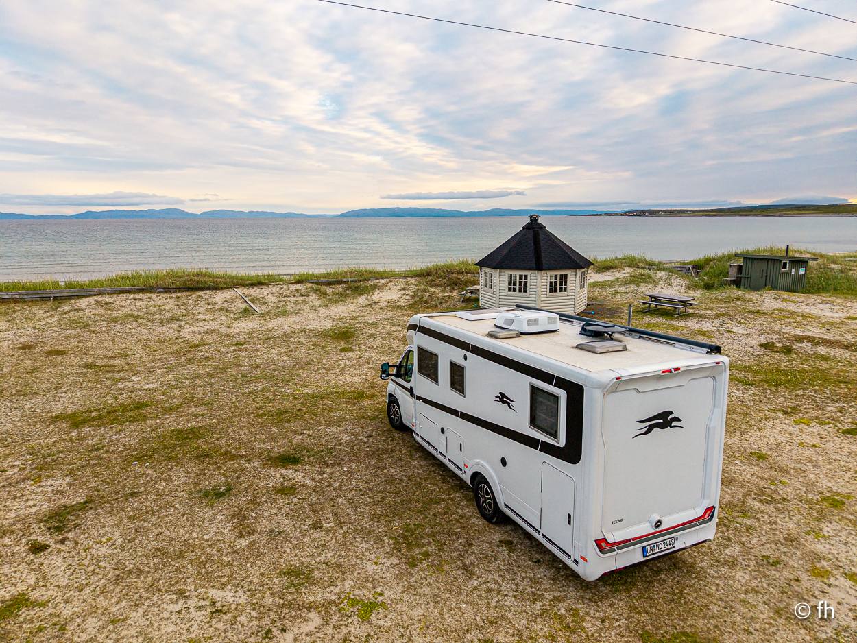 Von Vardø noch Hamningberg waren es dann nur noch ca. 60 Kilometer. Das sollte heute noch möglich sein, bis ein Schild kam. Auf dem stand, dass die nächsten 28 Kilometer die Straße nur 3 Meter breit ist. Das heißt vor jeder Kurve langsam rantasten ob jemand entgegenkommt, um dann einen Platz am Rand zu finden der etwas breiter ist, damit zwei Fahrzeuge aneinander vorbei passen. Hamningberg ist eine Sackgasse, das heißt, dass es morgen auf derselben Straße zurück geht. Heute Nacht stehen wir, wie gestern Abend, mit einem grandiosen Ausblick am Wasser. Ach so, auch hier gibt es ein Café mit hervorragenden Waffeln und Kaffee. Da wir hinter dem Polarkreis sind, geht die Sonne nicht unter. Taschenlampen sind hier im Moment kein gutes Geschäft. Christel hat gestern Abend von dem Anblick nicht genug bekommen.