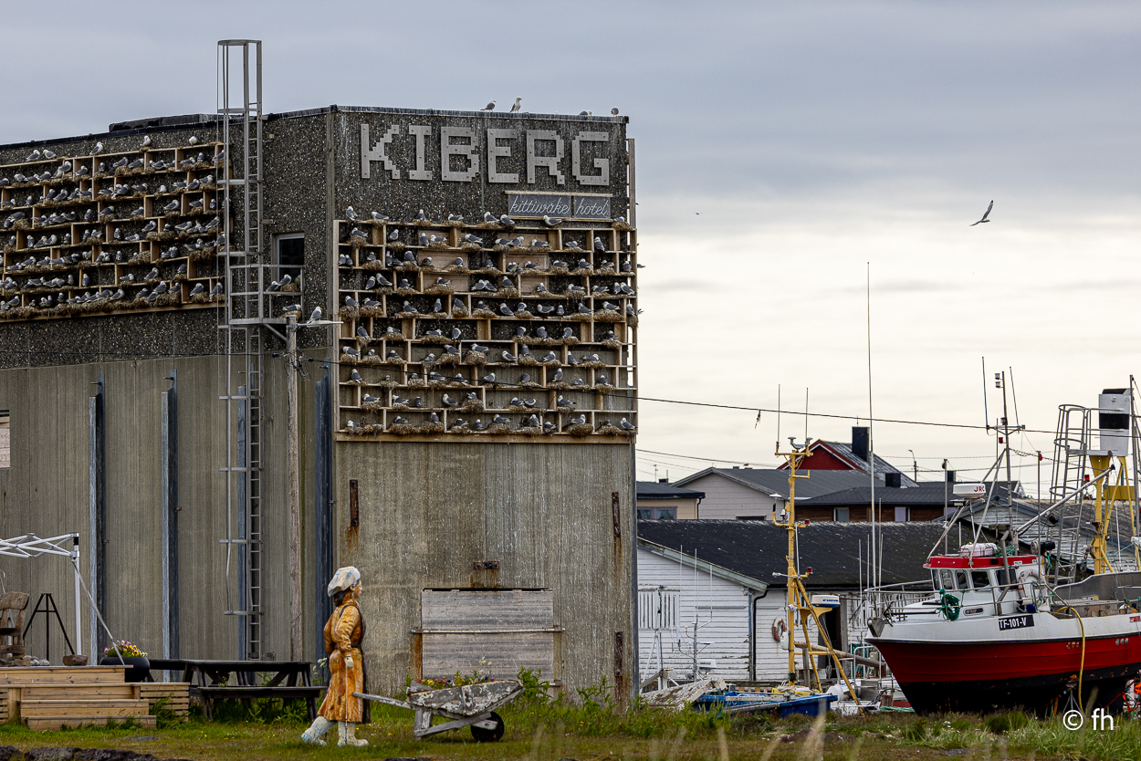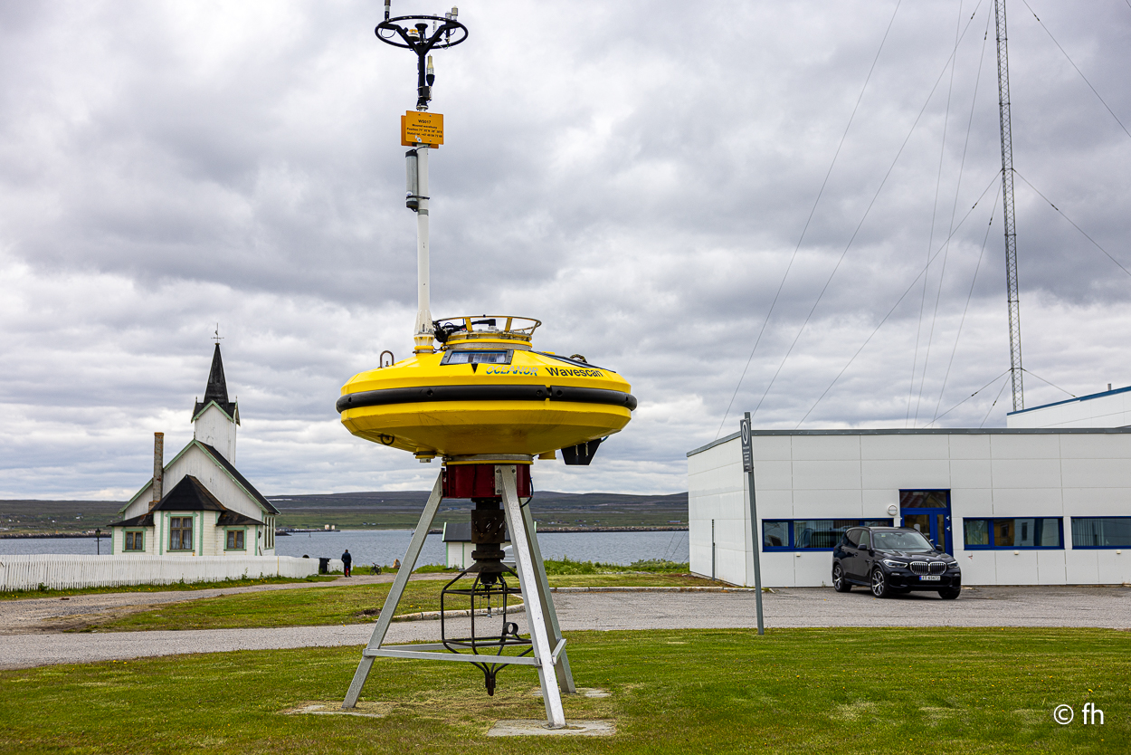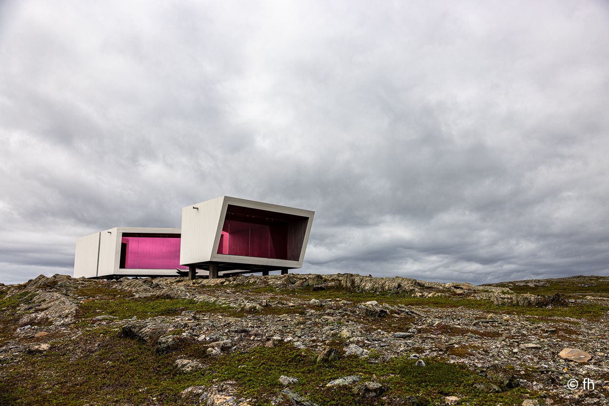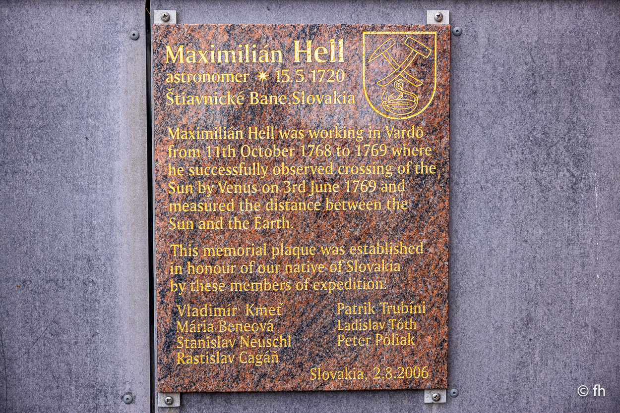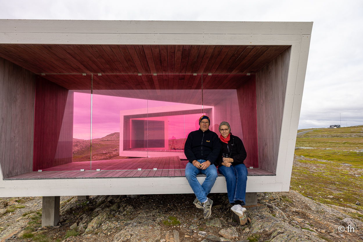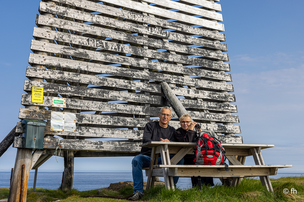 Das Ziel Hamningberg haben wie gestern nicht erreicht. Mal sehen, ob wir es heute schaffen oder ob wir wieder irgendwo bummeln. Also früh los. Wir haben ja gestern am Grenzübergang eine Stunde zurückbekommen. Zweimal in einer Woche eine Zeitumstellung, aber jetzt bleibt es bis zur Heimfahrt so. Unser erstes Ziel war mehr ein Zufall. Eine Vogelstation wurde mit einem Hinweisschild in Kiberg angekündigt. Leider stand da nur ein Turm, der als Mövenhotel dient. Ein paar Kilometer vor der Stadt Vardø haben wir auf dem Berg Domen eine kleine Rast eingelegt. Dort steht ein Kunstwerk, das so gebaut ist, dass man die grandiose Aussicht auf die Stadt windgeschützt genießen kann.
