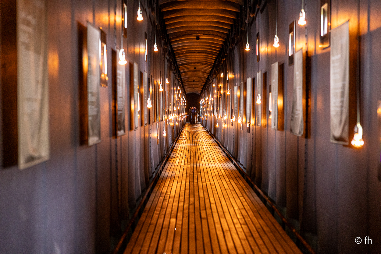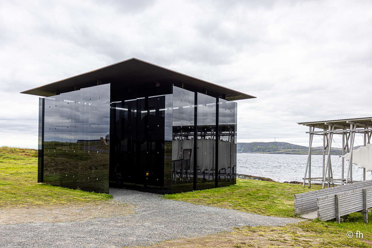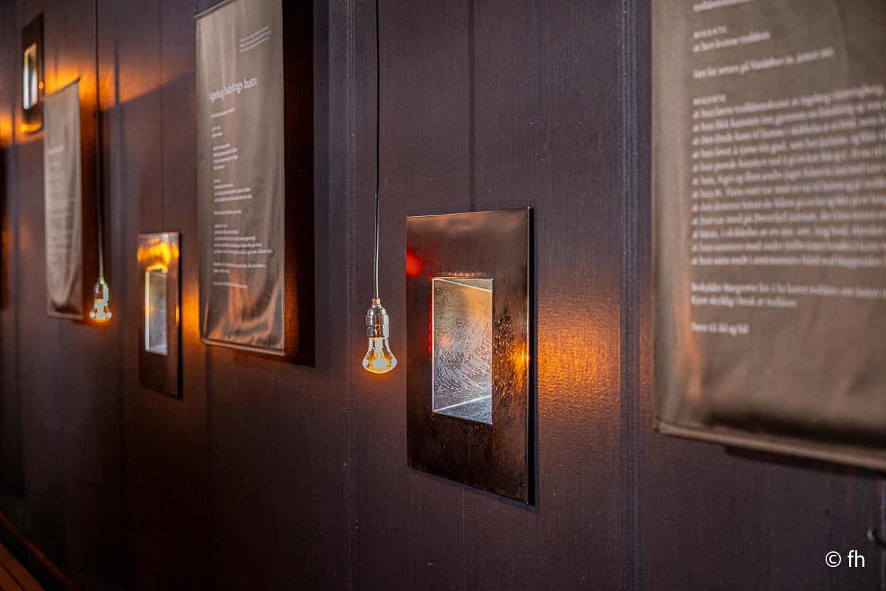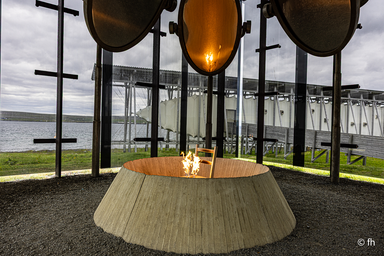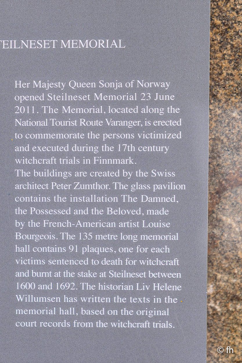 Dann begann die große Geschichtstour. Hier in der Gegend um Vardø wurden im 17.Jahrhundert (von 1600 -1692) 91 Hexen verbrannt. In einem Glaspavillon ist eine Installation mit einem brennenden Stuhl zu sehen. Nebenan ist eine 135 Meter lange Halle, in der für jede Hexe eine kleine Lampe vor einem Fenster angebracht ist. Neben jedem Fenster ist das Urteil aufgehängt, das zur Verurteilung geführt hat.