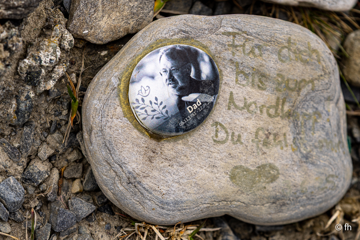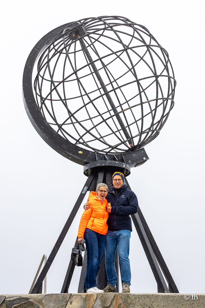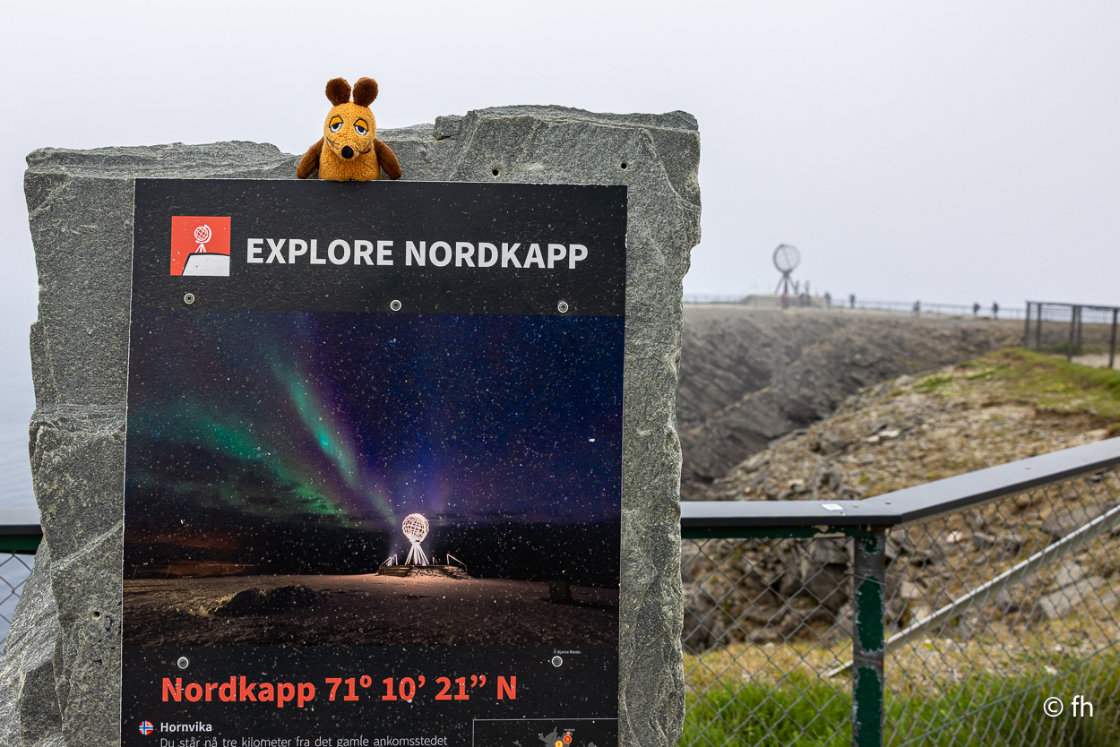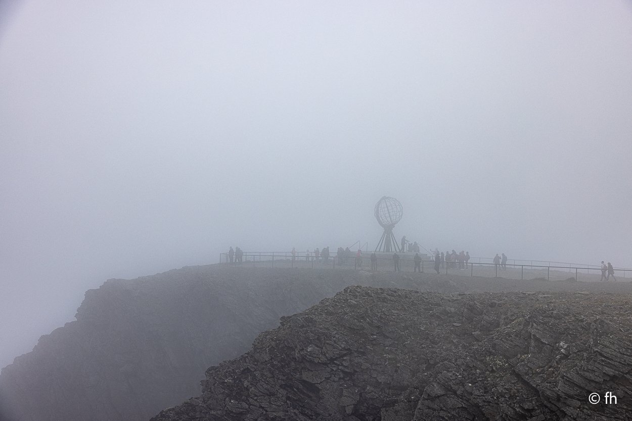 Die Musik von dem Festival in Lakselv war bis um 4 Uhr zu hören, aber es hat uns nicht gestört. Die Nacht war heute etwas kürzer. Wir sind um 7 Uhr aus den Federn, denn wir wollten gegen Mittag das Nordkap erreichen. Dann hast du eine Chance, einen guten Platz dort auf dem Parkplatz für die Nacht am Nordkap zu erwischen. Schön am Rand mit Blick zum Wasser. Das mit dem Parkplatz am Rand hat gut geklappt. Denn es war noch ohne Ende Platz, wo es bei unseren letzten beiden Besuchen ziemlich voll war. Der Grund für die Leere. Vor kurzem hat hier ein Wohnmobil gebrannt. Hier stehen die Wohnmobile sehr dicht beieinander. Wenn eins brennt, dann geht auch schnell ein zweites und mehr in Flammen auf. Deshalb darf hier aus Sicherheitsgründen nur noch 5 Stunden geparkt werden und nachts nicht mehr. Denn nachts gibt es hier auf dem Parkplatz keine Aufsicht. Wenn es hier brennt, ist das Chaos perfekt. Die nächste Feuerwehr ist wahrscheinlich in Honningsvåg. Das ist 50 Minuten entfernt. Schade, denn hier nachts die Sonne zu beobachten macht den Reiz aus. Aber heute, bei dem Nebel, wäre es sowieso nicht möglich gewesen. Der ein oder andere tritt diese Reise zum Nordkap vielleicht im Namen eines verlorenen Menschen an, dessen Wunsch es vielleicht war, einmal im Leben das Nordkap zu besuchen. Aber es nie geschafft hat. ( Siehe Foto )
