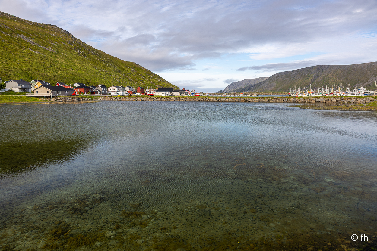 Wir fahren weiter zum nördlichsten Fischerdorf nach Skarsvåg und übernachten dort. Hier scheint, im Gegensatz zum Nordkap, die Sonne. Gleich geht es ins Fischrestaurant.