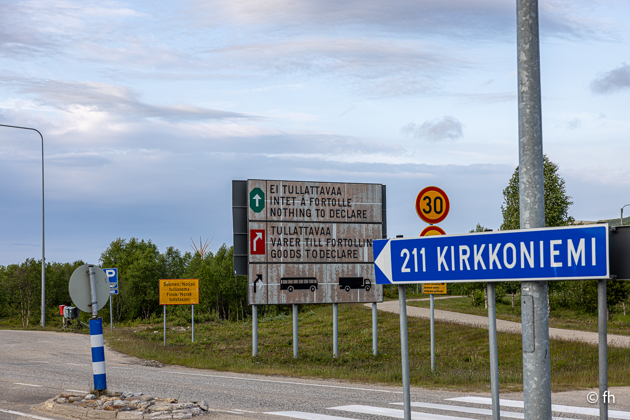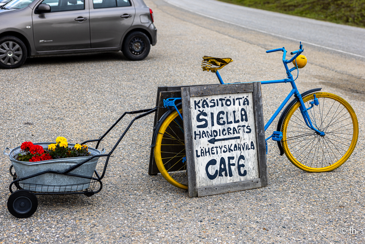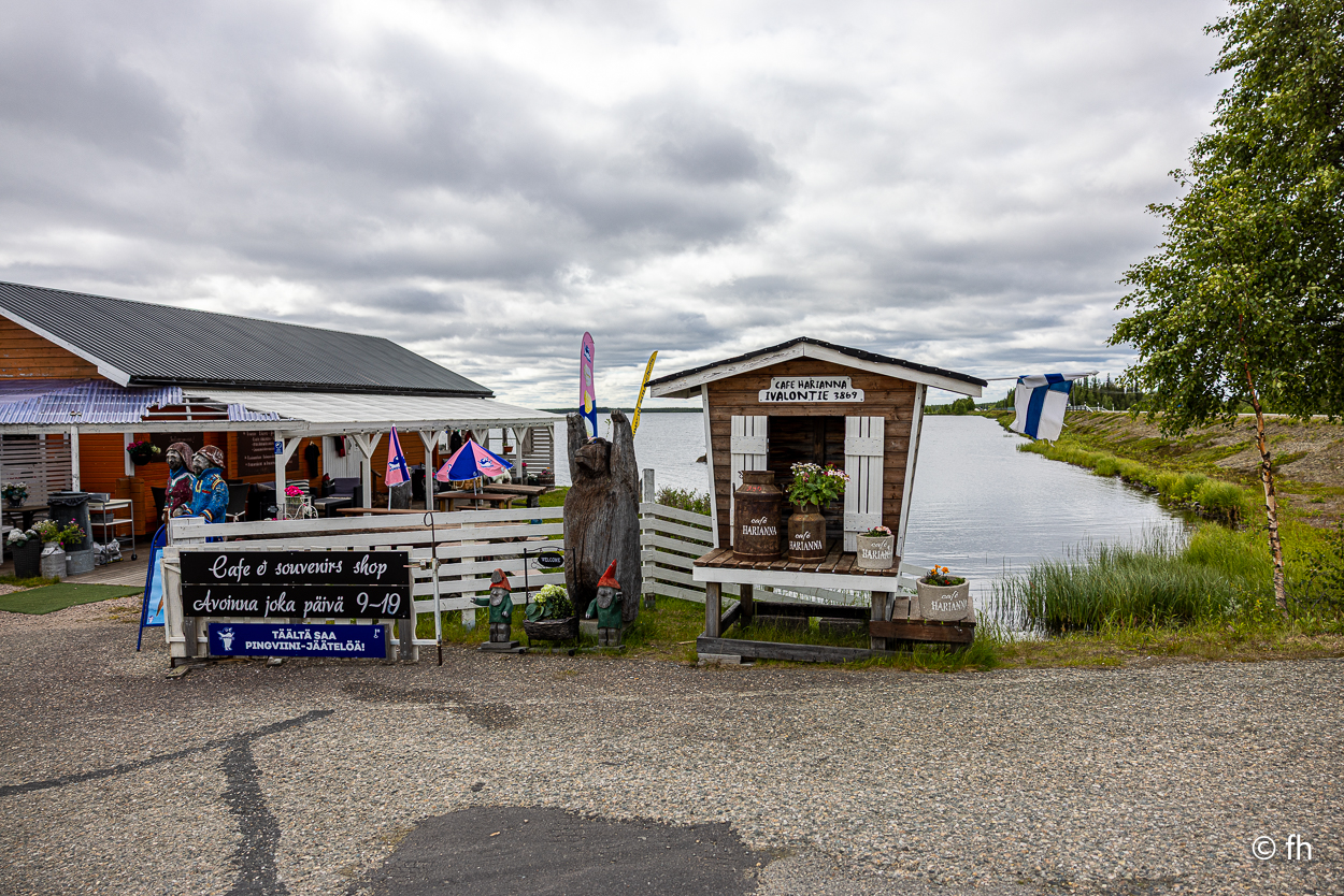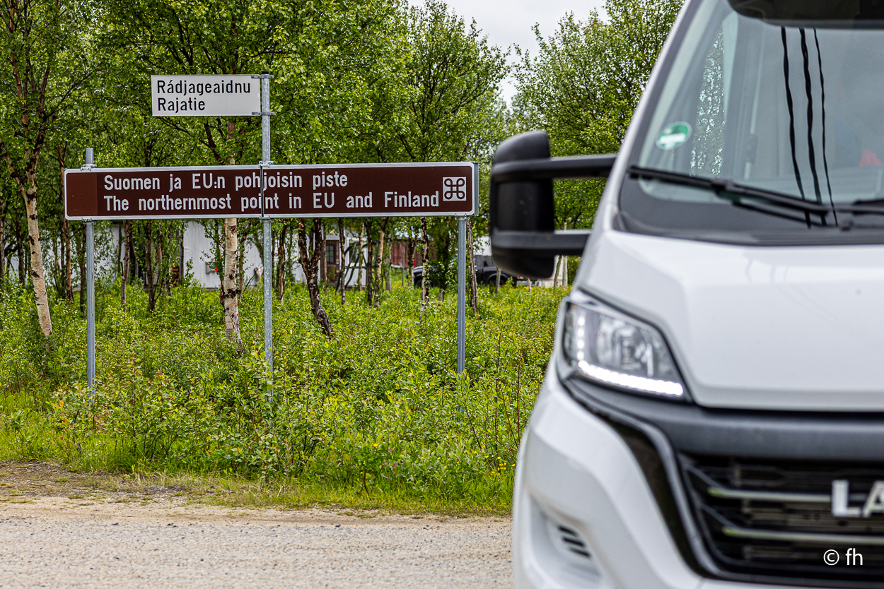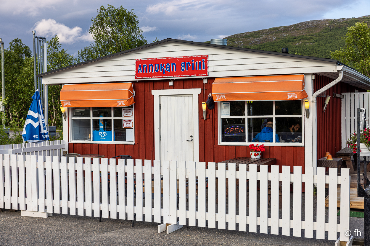 Da sind wir heute Abend, nach dem Abendessen, mal kurz über die Grenze von Finnland nach Norwegen gegangen. Hier in Utsjoki ist die Grenze von Finnland nach Norwegen. Aber morgen geht es weiter Richtung Norden, zum nördlichsten Punkt in Finnland. Am südlichsten Punkt in Finnland waren wir ja schon. Das Ziel ist dann Nuorgam, das soll dann der nördlichste Punkt sein. Dann geht es über die Grenze nach Norwegen und weiter bis nach Hamningberg. Wann wir da ankommen? Mal sehen. Wenn das so weiter geht wie heute, von einem Café zum nächsten, dann kann das dauern. Der heutige Tag war eine Kaffeetour. Erst ging es in ein nettes Café, das uns mit übergroßen Moltebeeren gelockt hat. Wir wollten eigentlich nur Moltebeeren kaufen. Keine da, die Saison beginnt erst in zwei Wochen. Na gut, dann eben einen Kaffee. Den zweiten Stopp haben wir als Pause nach einer langen Etappe eingebaut. Es gab leckere Waffeln und einen super Kaffee. Leider hatte die kleine Bude die Türen sperrangelweit offen und das bei 10 Grad Außentemperatur. Es geht gemütlicher. Den letzten Kaffeestopp gab es dann kurz vor unserem Nachquartier. Wir wussten da noch nicht, dass wir nur 3 Kilometer später einen Campingplatz anfahren würden, bei den Kirchhütten in Utsjoki.