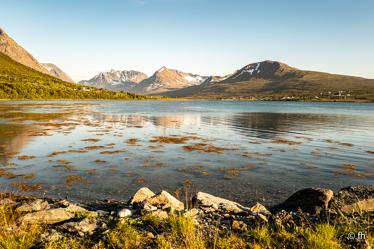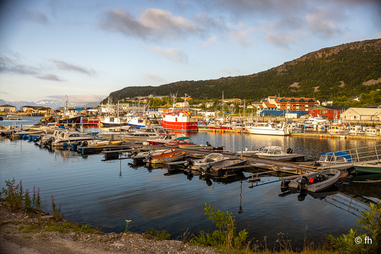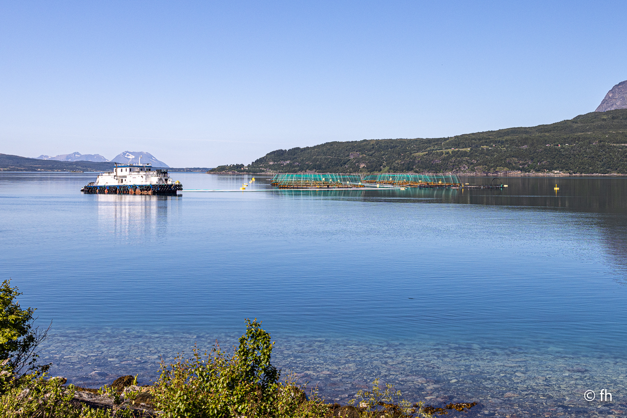 Gestern Abend haben wir in Skjervøy einfach am Hafen geparkt. Bei einem Gang durch das Dorf sind wir in dem einzigen Lokal, das es hier in Skjervøy gibt, hängengeblieben. Es gab leckere Pizza und „Fisch and Chips“. Der Junge am Nachbartisch meinte, man trifft überall auf der Welt auf Deutsche. Wieso überall auf der Welt? Er arbeitet bei einer Firma, die Marktführer für Fischzerlegungsanlagen ist. Der junge Mann mit seinen 27 Jahren war schon auf der ganzen Welt und repariert dort diese Anlagen. Die stehen halt überall. Sein Spezialgebiet sind Zerlegungsanlagen für Lachs. Wir haben uns nett unterhalten und viel von ihm über die Zuchtmethoden und die dazu führende Umweltverschmutzung gelernt. Diese runden Teile für die Fischzucht gehen bis zu 70 Meter tief ins Wasser und beherbergen bis zu 150.000 Lachse. Die essen nicht nur, sondern geben das Essen auch wieder zurück. Das belastet die Gewässer.
