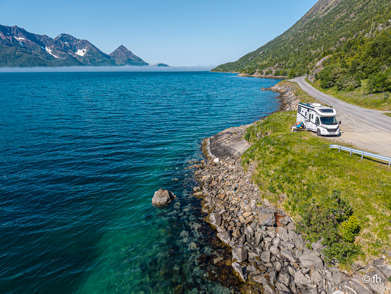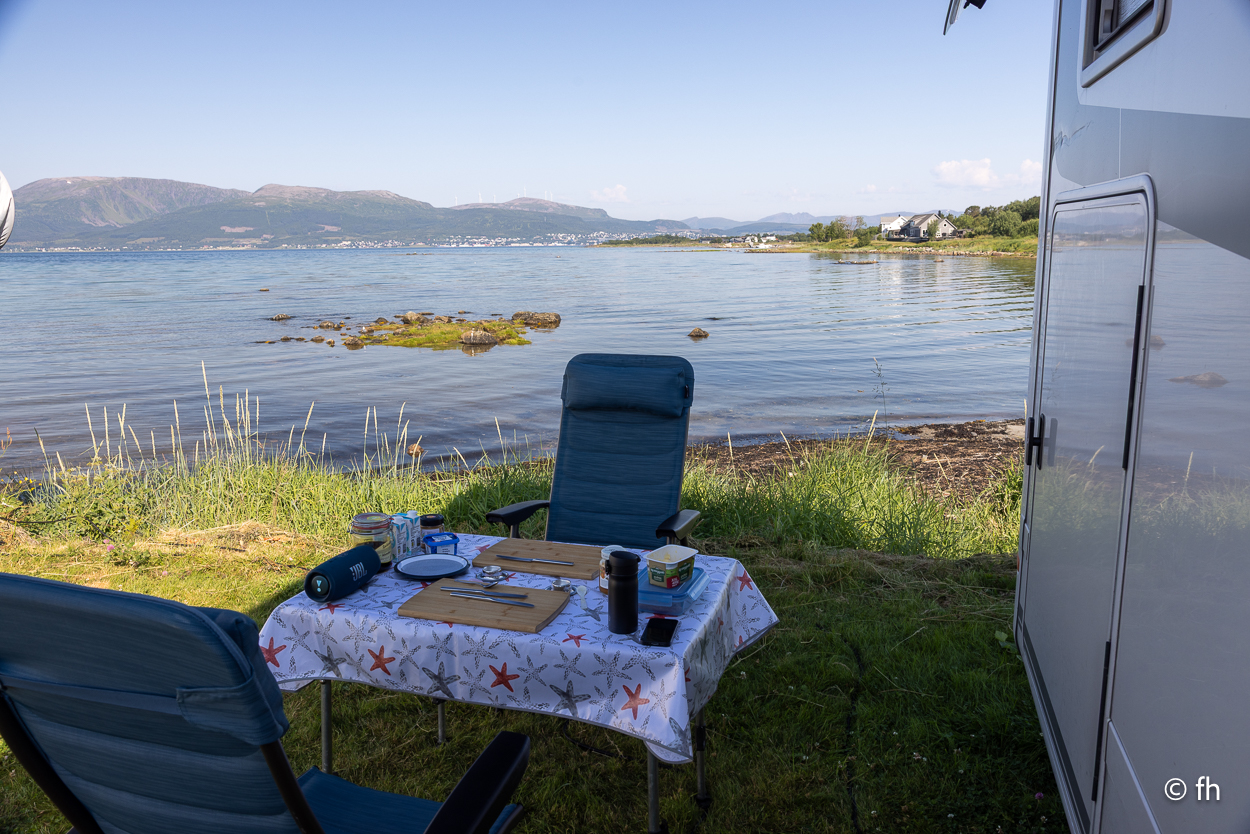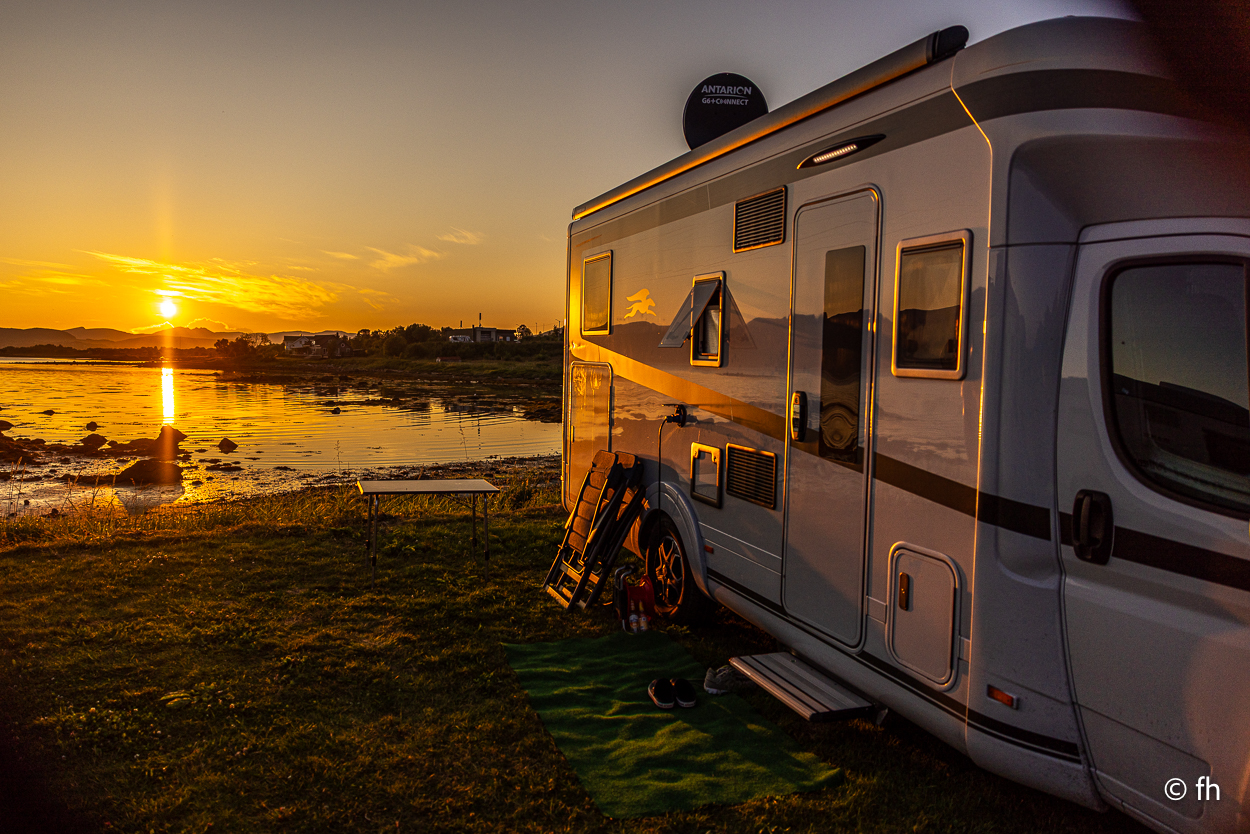 Gestern ist unsere Fahrt von Grov nach Kjerringnes ohne besondere Vorkommnisse abgelaufen. Übernachtet haben wir auf einem super Platz. Eine kleine Landzunge, die nur 50 Meter breit ist. Wir mussten heute leider umziehen, nur 10 Kilometer weiter nach Sortland. Nun stehen wir auf einem Platz, der zwar nicht besonders gepflegt ist, aber es ist alles vorhanden. Leider schon sehr veraltet und es ist bis jetzt der teuerste. Als Camper ist man es gewohnt mit wenig auszukommen. Es muss leider sein, da wir hier heute Abend von einem Guide abgeholt werden. Es gab beim Buchen der Tour keine andere Abholmöglichkeit. Die Aussicht von unserem Wohnmobil entschädigt für die schlechten Sanitäranlagen. Außerdem haben wir alles Wichtige selbst im Haus. Na ja, die Nacht wird sowie so etwas kürzer, denn der Guide kommt erst um 23 Uhr und das ganze dauert 3-5 Stunden. Wir werden berichten.