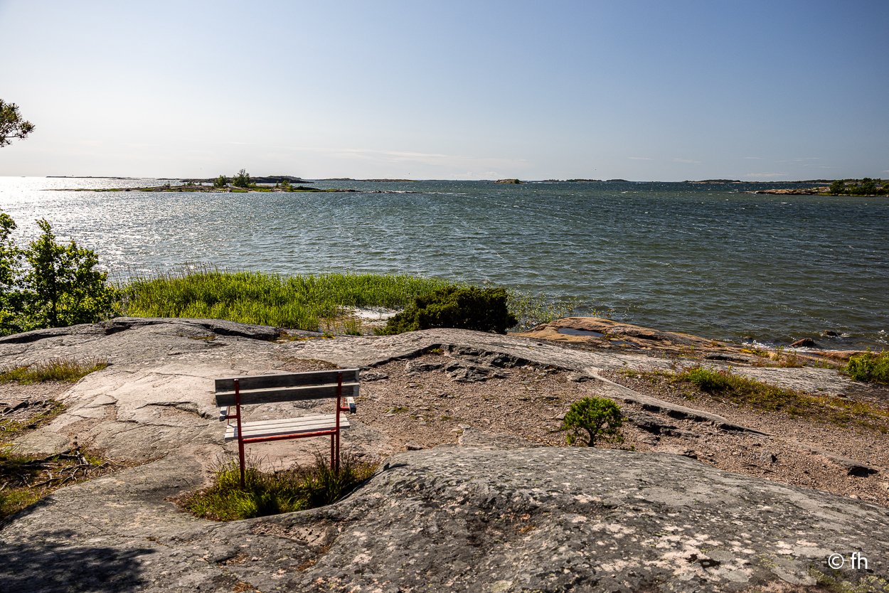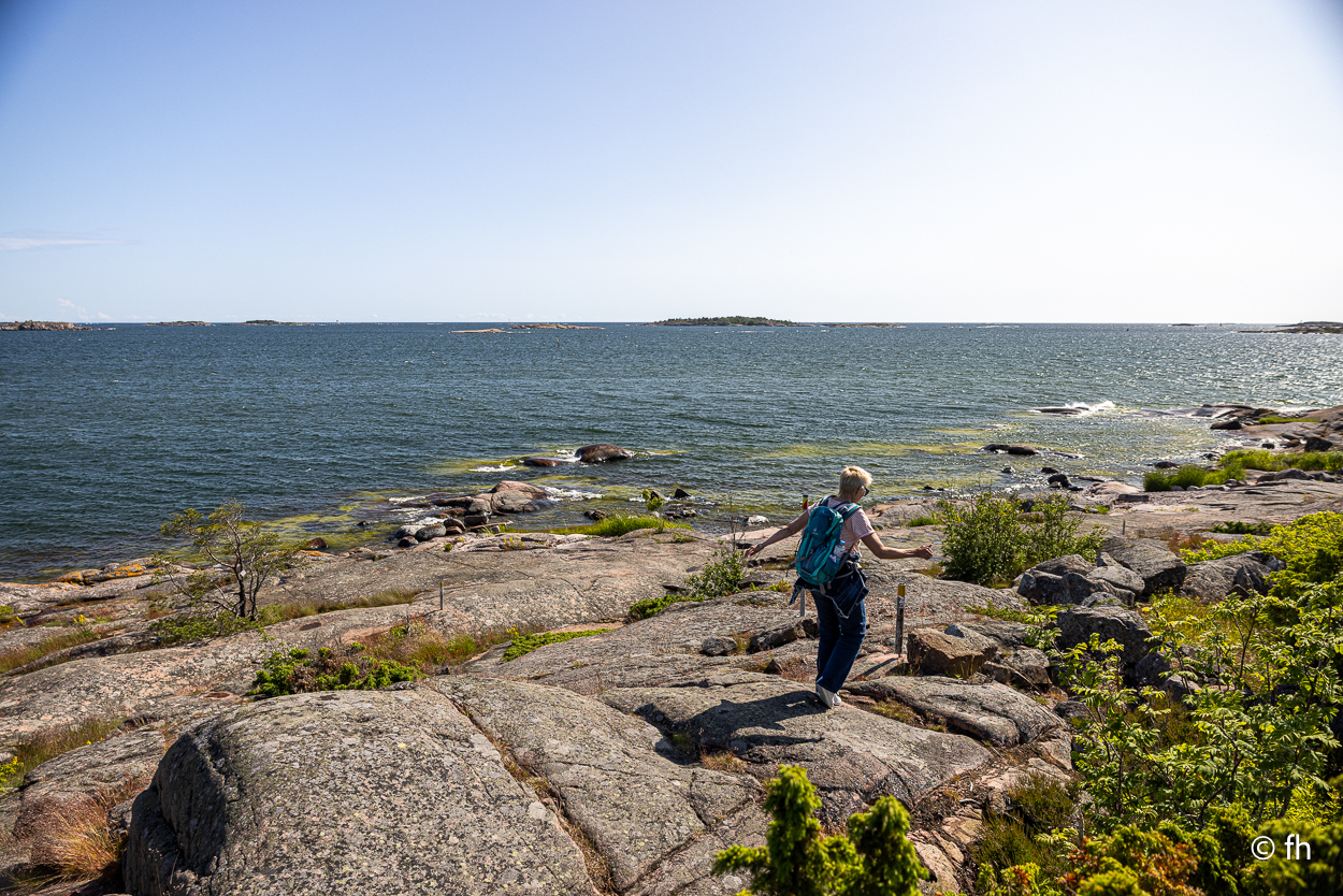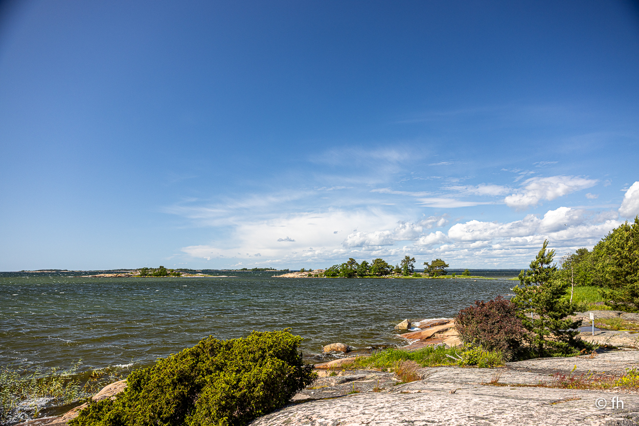 Nun aber zum südlichsten Punkt in Finnland, zumindest den Punkt den man zu Fuß erreichen kann. Ab nach Hanko. Da wir etwas orientierungslos waren, sind wir erst einmal ins Centrum gefahren. Hanko ist das kleine Côte d’Azur von Finnland, hat Christel mir gesagt. Ein schönes Städtchen mit einigen alten Villen und modernen Hotels, die sich sehen lassen können. Die Boote im Hafen zeugen davon, dass hier nicht nur normales Publikum ist. Wir dachten, dass wir den südlichsten Punkt von der Stadt aus zu Fuß erreichen können. Weit gefehlt. Wir mussten noch gut 5 km fahren. In einem kleinen Wäldchen direkt am Wasser, von wo die Tour starten soll, haben wir ein schattiges Plätzchen gefunden. Also los, Richtung Süden. Auf einem Holzsteg, den man entlang des Ufers gebaut hatte, ging es los. Bis zu dem Punkt, als wir ein älteres Pärchen überholt haben und uns erkundigt haben ob dort, wo der Turm steht, der südlichste Punkt ist. Da sind sie wohl falsch. Sie müssen auf die andere Seite der Landzunge. Super. Den ganzen Weg wieder zurück. Endlich, da ist der Wegweiser zum Naturpfad, der direkt zum Ziel führt. Immer entlang der Küste. Das Ufer war nur einige Meter entfernt. Ein kräftiger Wind blies uns die ganze Zeit von vorne ins Gesicht. Es ging über Schotter, Geröll und karge Felsen, vorbei an einer alten verfallenen deutschen Basis aus dem Krieg bis zu unserem Ziel. Am Ziel erwartete uns ein Steinhaufen mit einer Tafel, auf der nichts mehr zu lesen war. Egal. Da die Strecke nicht sehr einfach zu gehen war und es immerhin fast 8 Kilometer waren, waren wir erst gegen 18:00 Uhr am Auto. Also kurz die 35 Kilometer zurück nach Ekenäs, wo wir die heutige Nacht verbringen. Deshalb, Ekenäs-Hanko-Ekenäs.
