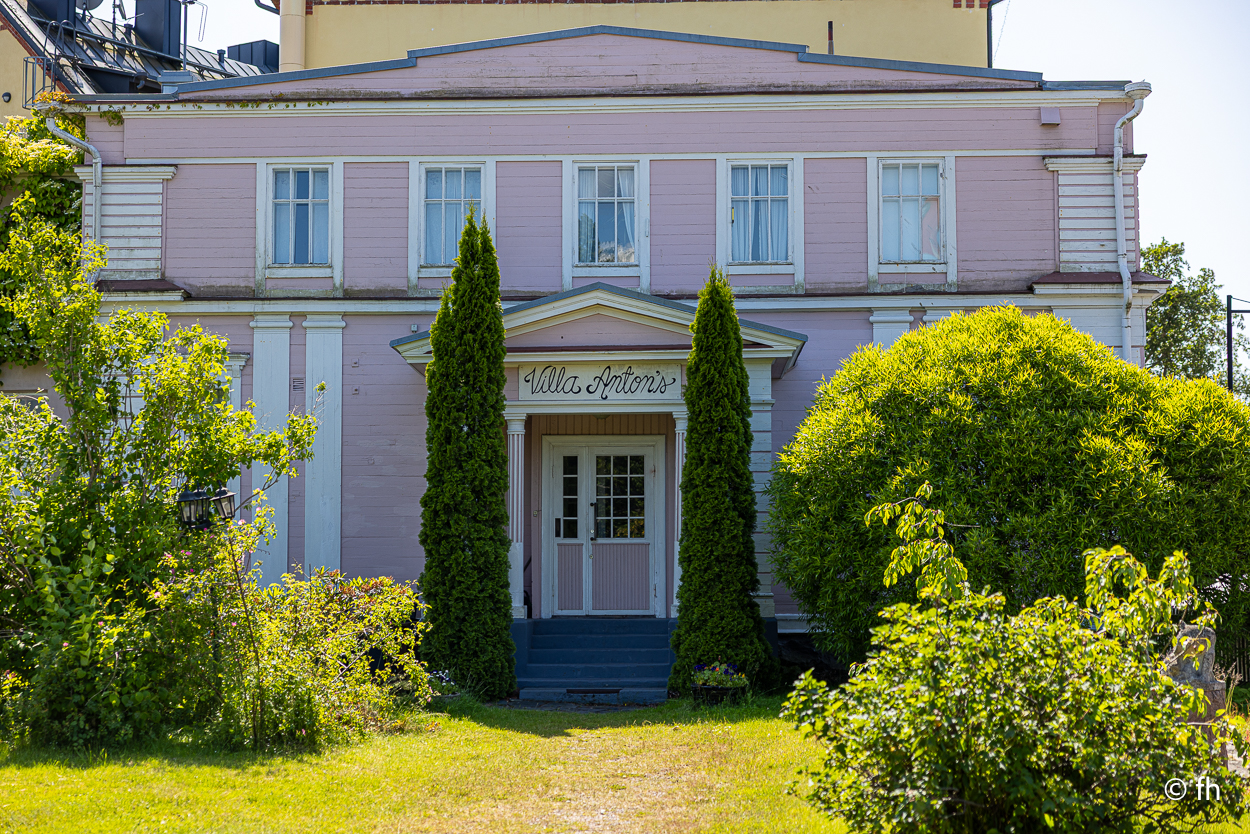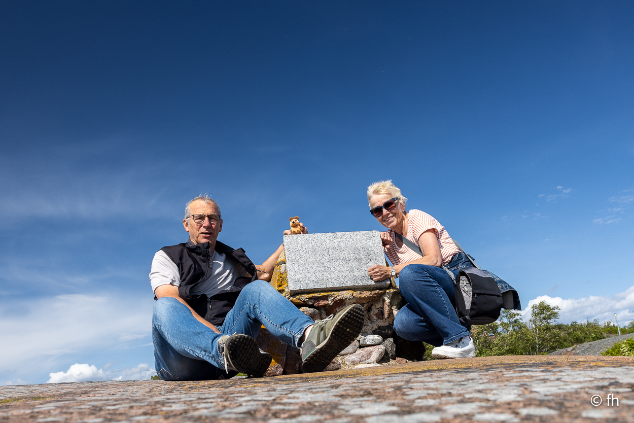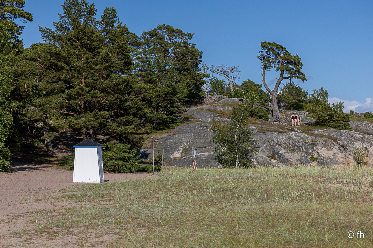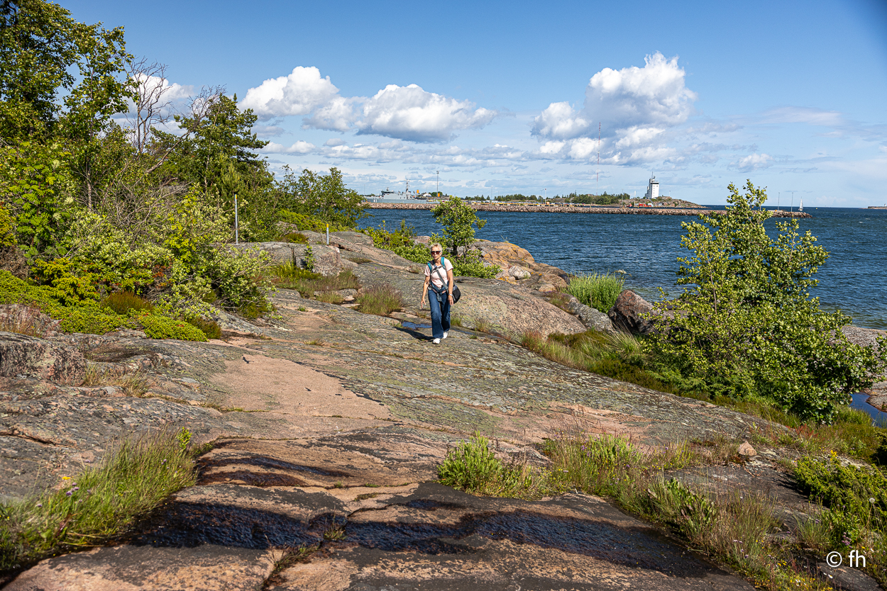 Nun aber zum südlichsten Punkt in Finnland, zumindest den Punkt den man zu Fuß erreichen kann. Ab nach Hanko. Da wir etwas orientierungslos waren, sind wir erst einmal ins Centrum gefahren. Hanko ist das kleine Côte d’Azur von Finnland, hat Christel mir gesagt. Ein schönes Städtchen mit einigen alten Villen und modernen Hotels, die sich sehen lassen können. Die Boote im Hafen zeugen davon, dass hier nicht nur normales Publikum ist. Wir dachten, dass wir den südlichsten Punkt von der Stadt aus zu Fuß erreichen können. Weit gefehlt. Wir mussten noch gut 5 km fahren. In einem kleinen Wäldchen direkt am Wasser, von wo die Tour starten soll, haben wir ein schattiges Plätzchen gefunden. Also los, Richtung Süden. Auf einem Holzsteg, den man entlang des Ufers gebaut hatte, ging es los. Bis zu dem Punkt, als wir ein älteres Pärchen überholt haben und uns erkundigt haben ob dort, wo der Turm steht, der südlichste Punkt ist. Da sind sie wohl falsch. Sie müssen auf die andere Seite der Landzunge. Super. Den ganzen Weg wieder zurück. Endlich, da ist der Wegweiser zum Naturpfad, der direkt zum Ziel führt. Immer entlang der Küste. Das Ufer war nur einige Meter entfernt. Ein kräftiger Wind blies uns die ganze Zeit von vorne ins Gesicht. Es ging über Schotter, Geröll und karge Felsen, vorbei an einer alten verfallenen deutschen Basis aus dem Krieg bis zu unserem Ziel. Am Ziel erwartete uns ein Steinhaufen mit einer Tafel, auf der nichts mehr zu lesen war. Egal. Da die Strecke nicht sehr einfach zu gehen war und es immerhin fast 8 Kilometer waren, waren wir erst gegen 18:00 Uhr am Auto. Also kurz die 35 Kilometer zurück nach Ekenäs, wo wir die heutige Nacht verbringen. Deshalb, Ekenäs-Hanko-Ekenäs.