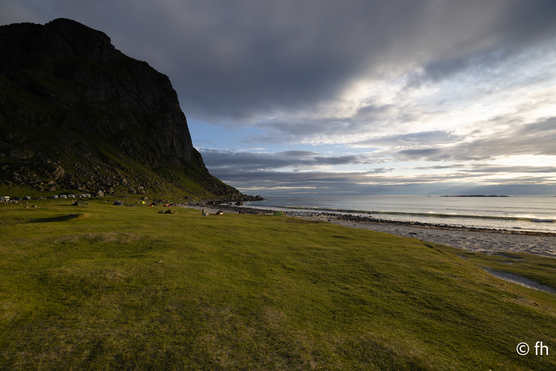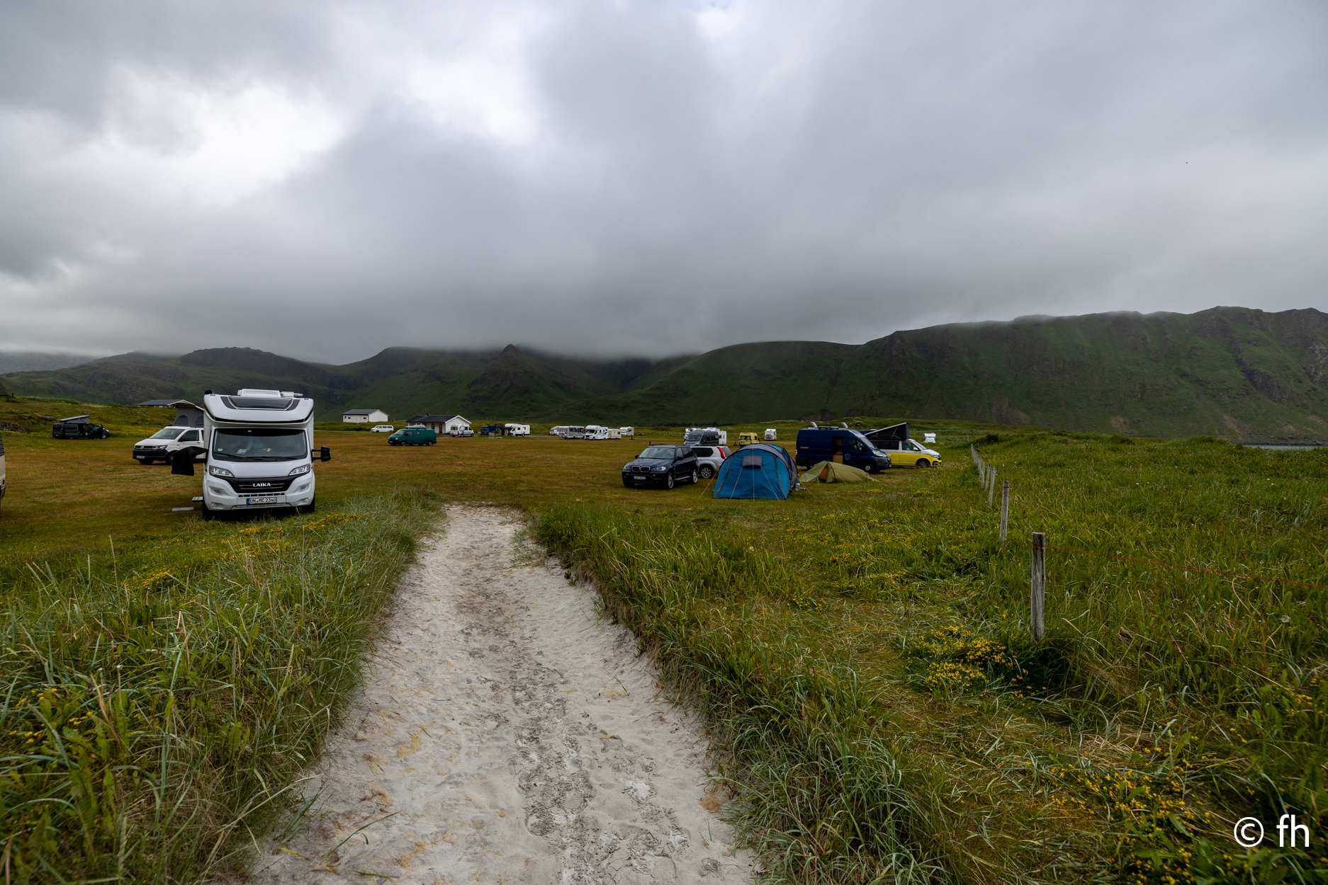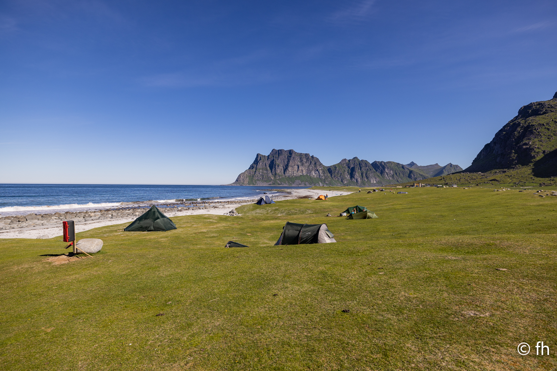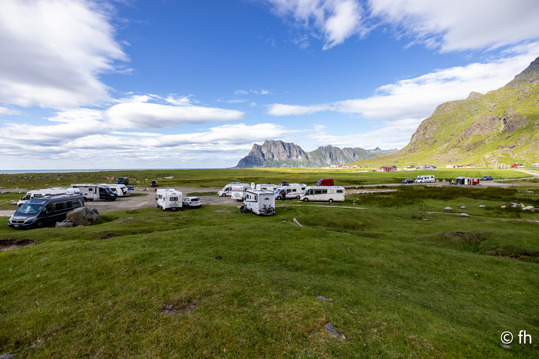 Da haben wir doch gestern übersehen, dass das Fotografieren des Fisches entlohnt werden muss. Damit wir nichts schuldig bleiben, haben wir noch mal kurz einen Stopp eingelegt und den Euro in die Kiste gesteckt. Ein kleiner Rundflug mit der Drohne war auch noch drin. Dann ging es Richtung Uttakleiv. Christel wollte unbedingt Surfer auf dem Wasser sehen. Keiner da. Angeblich soll der Strand in Uttakleiv der schönste Strand in Europa sein. Weiß nicht, wer das geschrieben hat. Aber so ein bisschen hat er Recht. Der Strand liegt eingebettet von Bergen in einer kleinen Bucht. Das Licht in der Mitternachtssonne ist unglaublich. Man kann sich nicht satt sehen. Der Strand ist voll mit kleinen Zelten, die stehen, bevor der Sandstrand anfängt, auf einem kurzen satt grünem hügeligen Rasen. Der wird hier von den Schafen immer schön kurz gehalten. Allerdings sind die Hinterlassenschaften nicht ohne. Man muss schon sehen wo der nächste Fußtritt hingeht. Die machen auch vor unserem Wohnmobil keine Ausnahme. Nach dem Abendessen ging es dann noch mal ans Wasser. Ein junger Mann hat es sich in seiner Hängematte für die Nacht eingerichtet. Vor den Zelten genossen die Menschen, so wie wir die Mitternachtssonne. Ein Traum. Es ist schwer den Weg ins Bett zu finden.