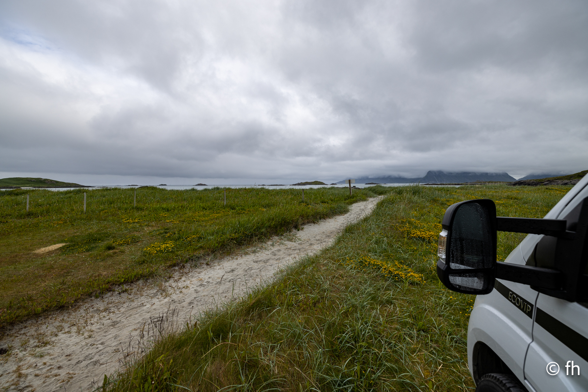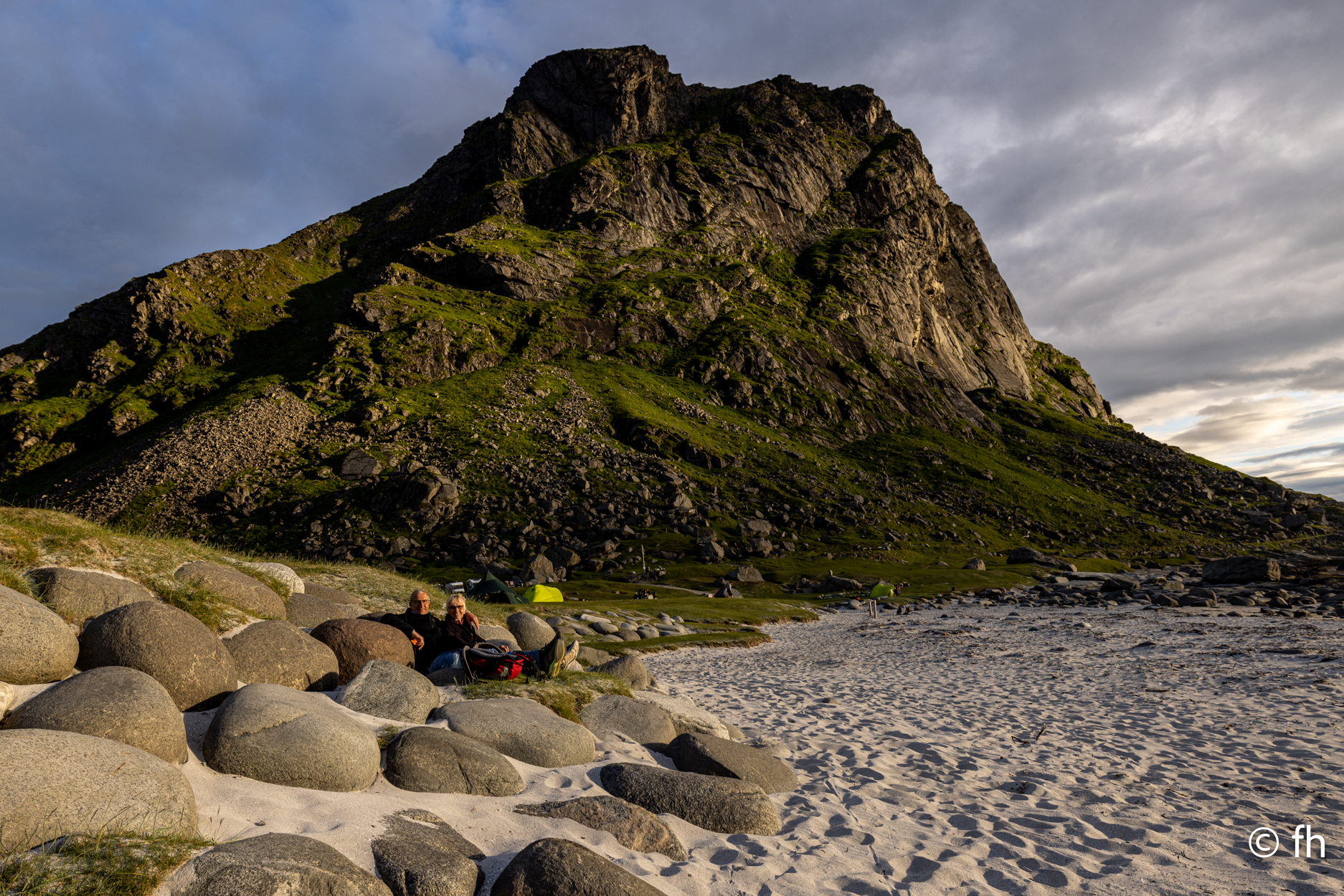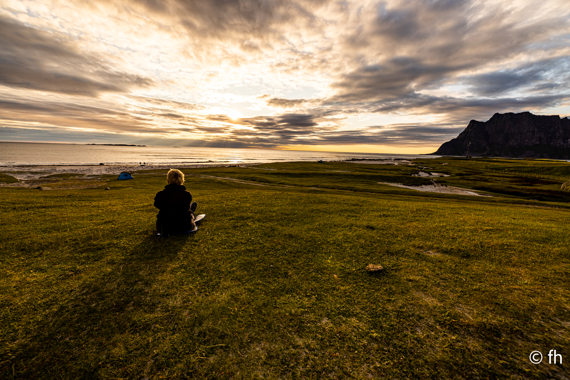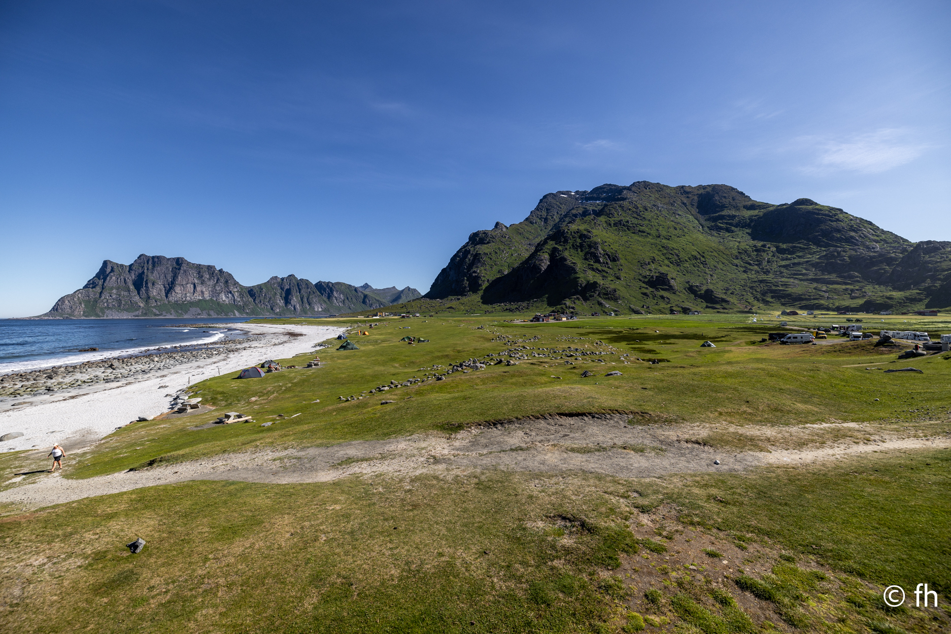 Da haben wir doch gestern übersehen, dass das Fotografieren des Fisches entlohnt werden muss. Damit wir nichts schuldig bleiben, haben wir noch mal kurz einen Stopp eingelegt und den Euro in die Kiste gesteckt. Ein kleiner Rundflug mit der Drohne war auch noch drin. Dann ging es Richtung Uttakleiv. Christel wollte unbedingt Surfer auf dem Wasser sehen. Keiner da. Angeblich soll der Strand in Uttakleiv der schönste Strand in Europa sein. Weiß nicht, wer das geschrieben hat. Aber so ein bisschen hat er Recht. Der Strand liegt eingebettet von Bergen in einer kleinen Bucht. Das Licht in der Mitternachtssonne ist unglaublich. Man kann sich nicht satt sehen. Der Strand ist voll mit kleinen Zelten, die stehen, bevor der Sandstrand anfängt, auf einem kurzen satt grünem hügeligen Rasen. Der wird hier von den Schafen immer schön kurz gehalten. Allerdings sind die Hinterlassenschaften nicht ohne. Man muss schon sehen wo der nächste Fußtritt hingeht. Die machen auch vor unserem Wohnmobil keine Ausnahme. Nach dem Abendessen ging es dann noch mal ans Wasser. Ein junger Mann hat es sich in seiner Hängematte für die Nacht eingerichtet. Vor den Zelten genossen die Menschen, so wie wir die Mitternachtssonne. Ein Traum. Es ist schwer den Weg ins Bett zu finden.