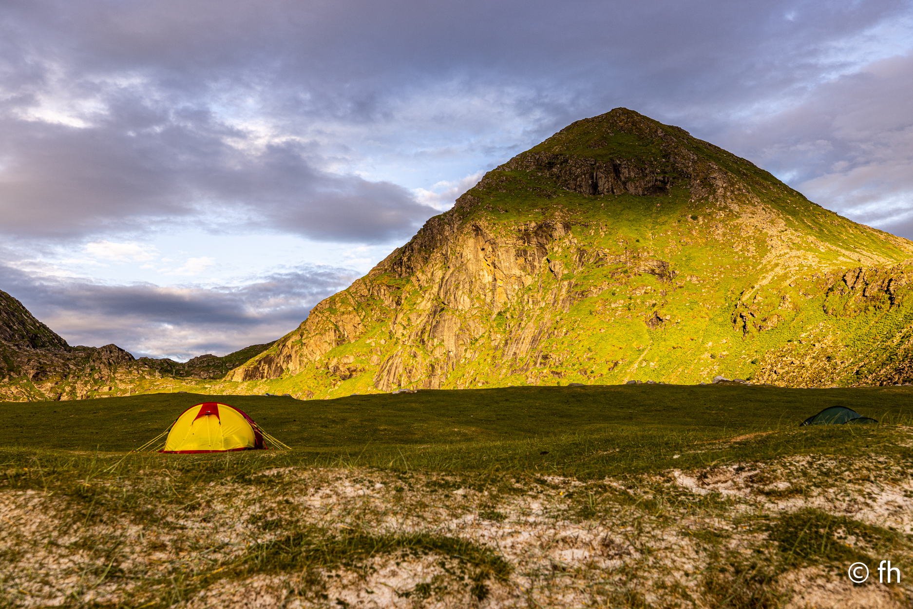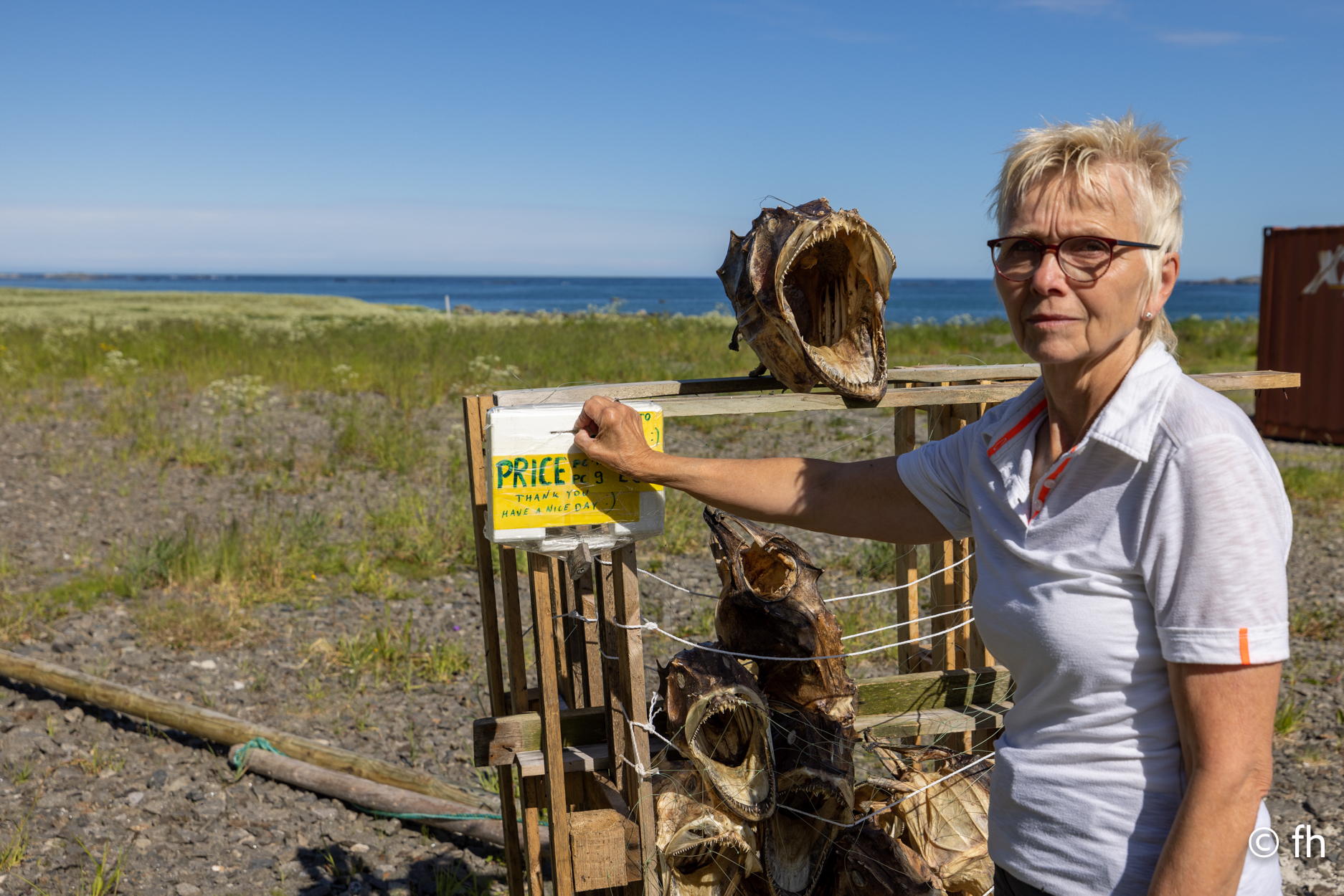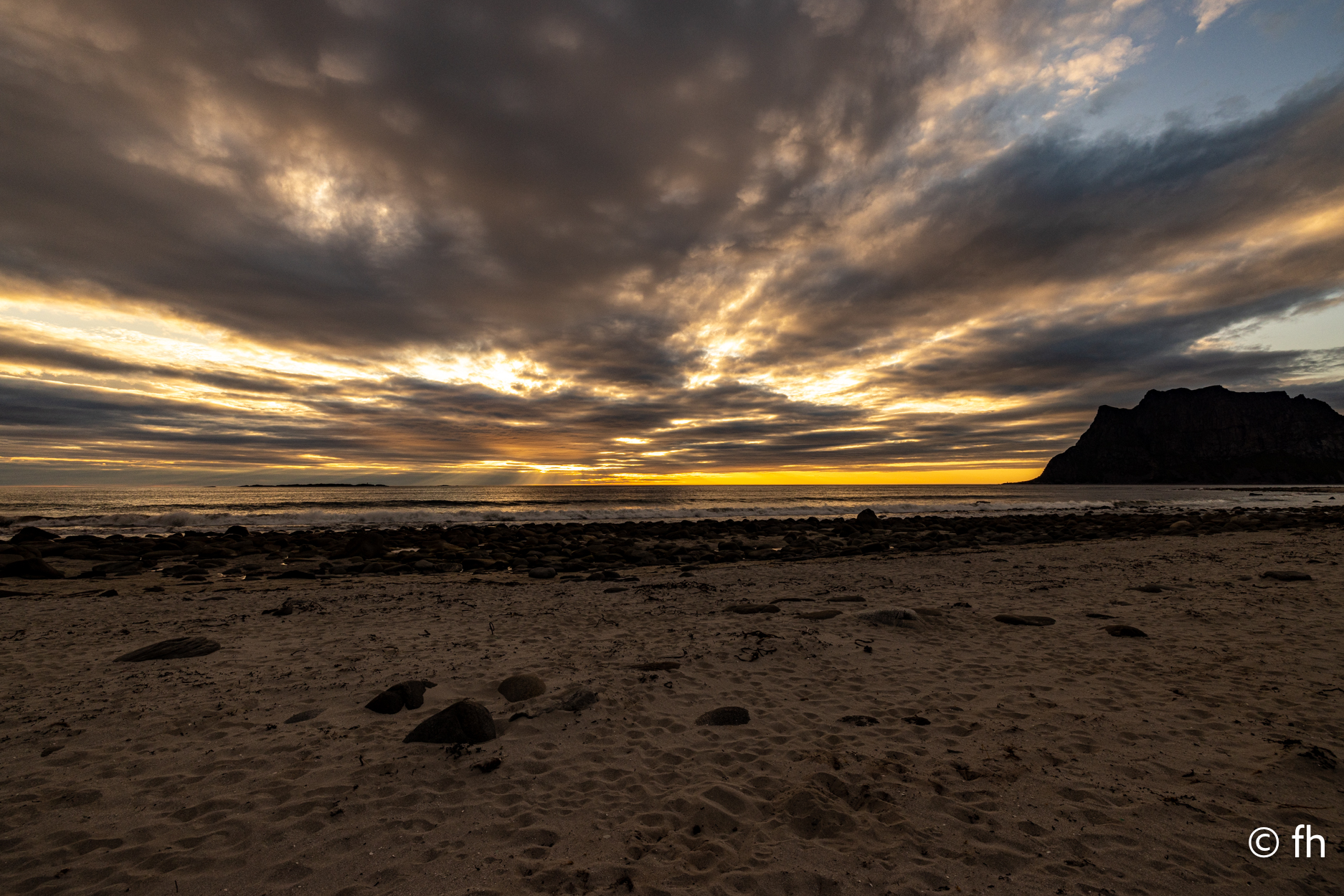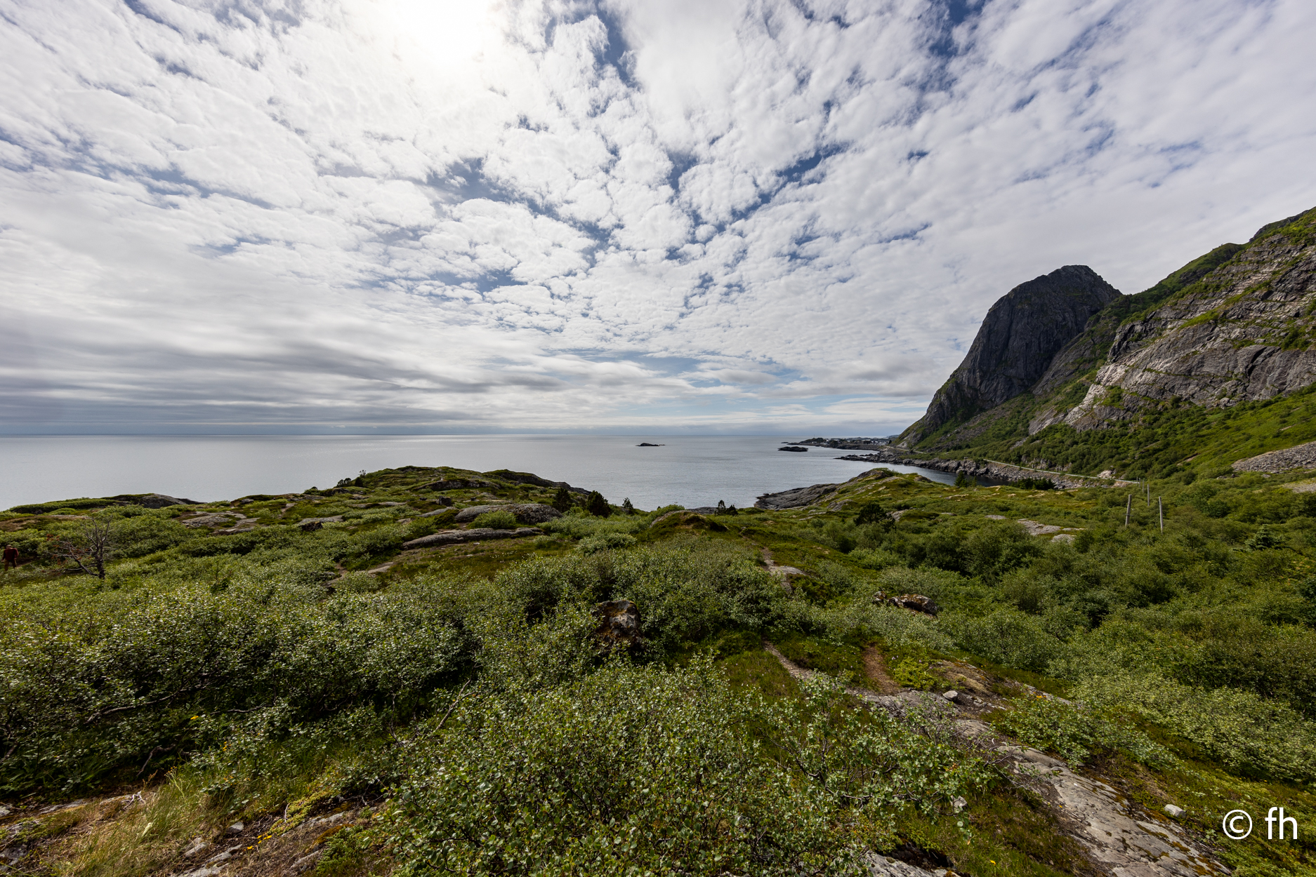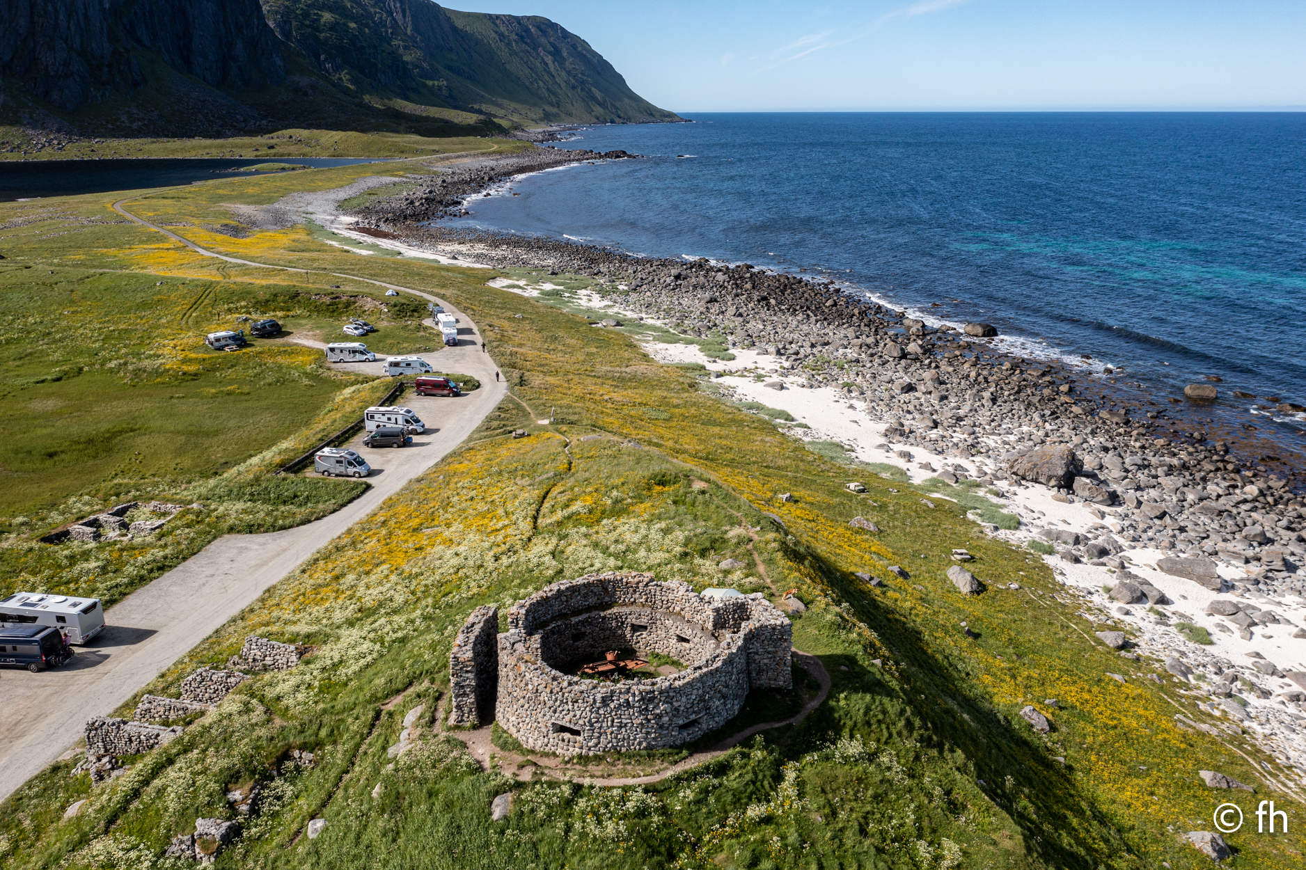 Da haben wir doch gestern übersehen, dass das Fotografieren des Fisches entlohnt werden muss. Damit wir nichts schuldig bleiben, haben wir noch mal kurz einen Stopp eingelegt und den Euro in die Kiste gesteckt. Ein kleiner Rundflug mit der Drohne war auch noch drin. Dann ging es Richtung Uttakleiv. Christel wollte unbedingt Surfer auf dem Wasser sehen. Keiner da. Angeblich soll der Strand in Uttakleiv der schönste Strand in Europa sein. Weiß nicht, wer das geschrieben hat. Aber so ein bisschen hat er Recht. Der Strand liegt eingebettet von Bergen in einer kleinen Bucht. Das Licht in der Mitternachtssonne ist unglaublich. Man kann sich nicht satt sehen. Der Strand ist voll mit kleinen Zelten, die stehen, bevor der Sandstrand anfängt, auf einem kurzen satt grünem hügeligen Rasen. Der wird hier von den Schafen immer schön kurz gehalten. Allerdings sind die Hinterlassenschaften nicht ohne. Man muss schon sehen wo der nächste Fußtritt hingeht. Die machen auch vor unserem Wohnmobil keine Ausnahme. Nach dem Abendessen ging es dann noch mal ans Wasser. Ein junger Mann hat es sich in seiner Hängematte für die Nacht eingerichtet. Vor den Zelten genossen die Menschen, so wie wir die Mitternachtssonne. Ein Traum. Es ist schwer den Weg ins Bett zu finden.