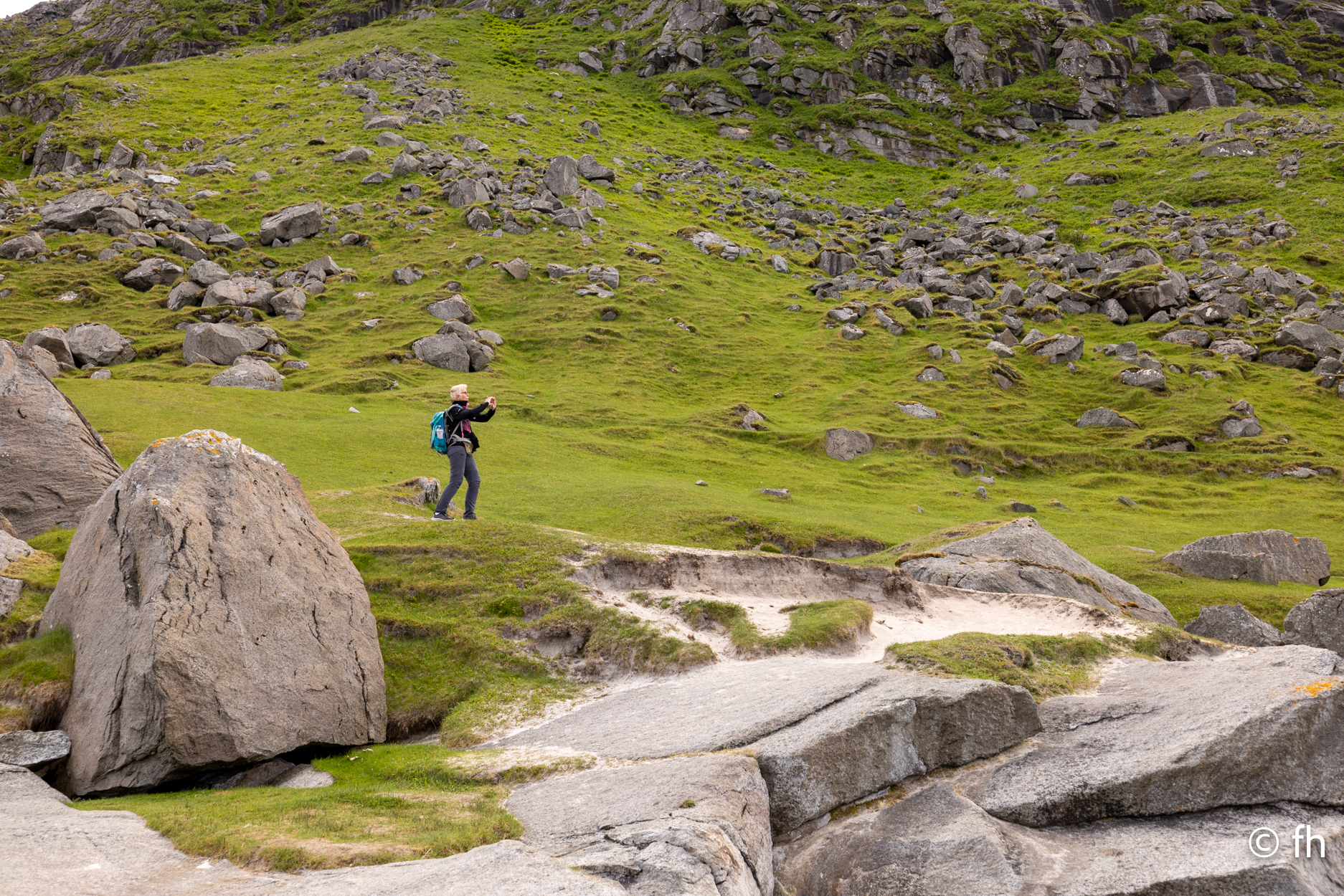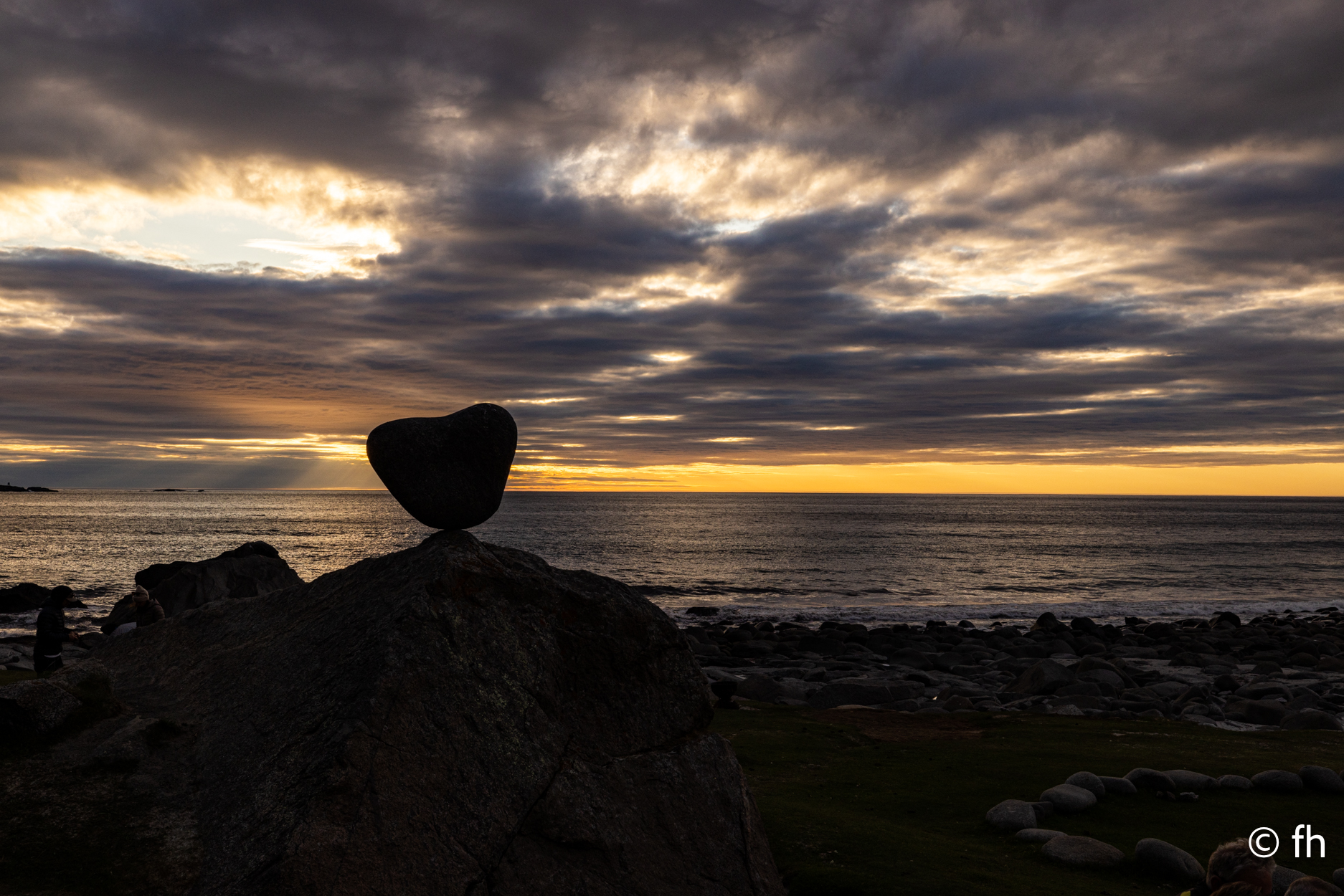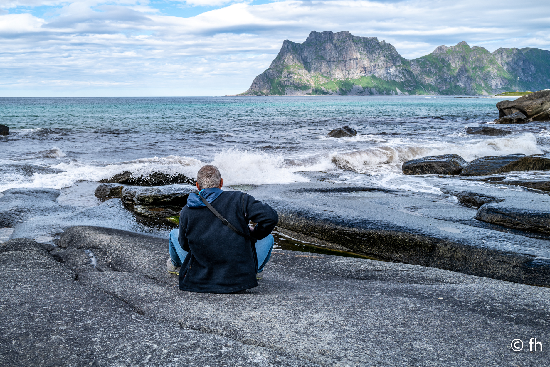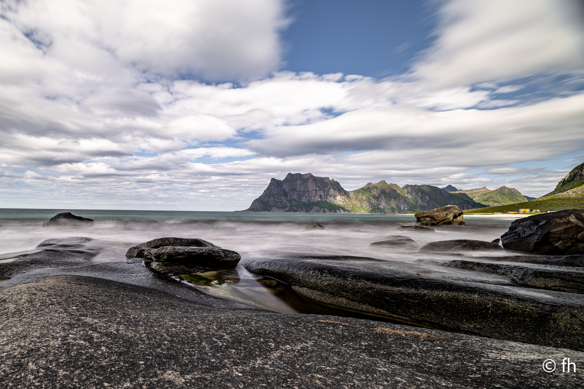 Da haben wir doch gestern übersehen, dass das Fotografieren des Fisches entlohnt werden muss. Damit wir nichts schuldig bleiben, haben wir noch mal kurz einen Stopp eingelegt und den Euro in die Kiste gesteckt. Ein kleiner Rundflug mit der Drohne war auch noch drin. Dann ging es Richtung Uttakleiv. Christel wollte unbedingt Surfer auf dem Wasser sehen. Keiner da. Angeblich soll der Strand in Uttakleiv der schönste Strand in Europa sein. Weiß nicht, wer das geschrieben hat. Aber so ein bisschen hat er Recht. Der Strand liegt eingebettet von Bergen in einer kleinen Bucht. Das Licht in der Mitternachtssonne ist unglaublich. Man kann sich nicht satt sehen. Der Strand ist voll mit kleinen Zelten, die stehen, bevor der Sandstrand anfängt, auf einem kurzen satt grünem hügeligen Rasen. Der wird hier von den Schafen immer schön kurz gehalten. Allerdings sind die Hinterlassenschaften nicht ohne. Man muss schon sehen wo der nächste Fußtritt hingeht. Die machen auch vor unserem Wohnmobil keine Ausnahme. Nach dem Abendessen ging es dann noch mal ans Wasser. Ein junger Mann hat es sich in seiner Hängematte für die Nacht eingerichtet. Vor den Zelten genossen die Menschen, so wie wir die Mitternachtssonne. Ein Traum. Es ist schwer den Weg ins Bett zu finden.