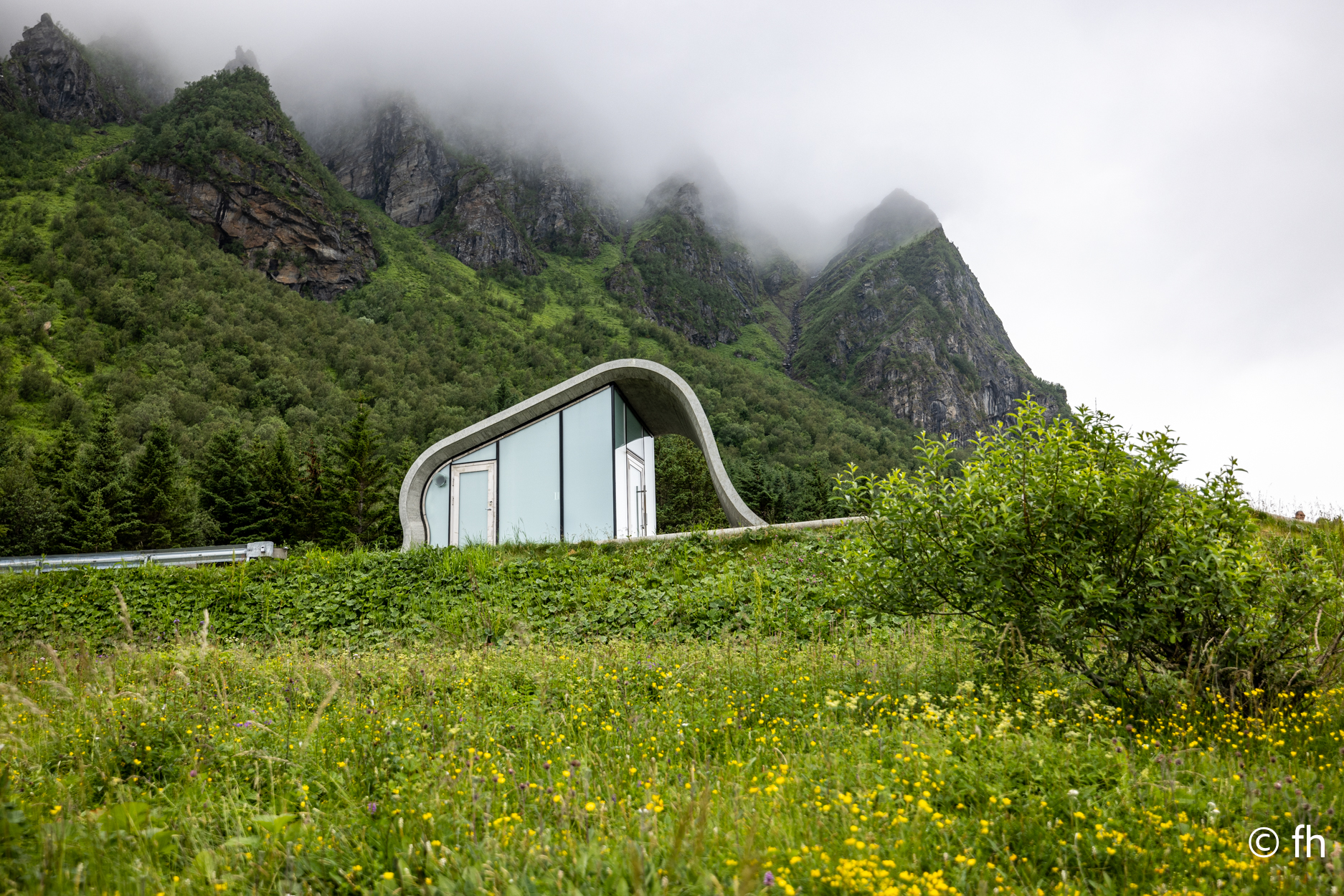 Der Start in den Tag war nass, es hat die ganze Nacht geregnet. Nachts um Drei bin ich von einem Geräusch, wie ein tropfender Wasserhahn, wach geworden. Nach langem Suchen im Fahrzeug ging der Weg dann nach draußen. Der Übeltäter war schnell gefunden. Vom Dach tropfte es auf eine Kunststoffabdeckung hinten am Fahrzeug, quasi direkt an meinem Schlafplatz. Ein Schlappen quer in die Fahrradspeichen schaffte die Erlösung. Morgen wollen wir den Gletscher Svartisen besichtigen. Wir haben uns entschlossen schon mal in die Nähe des Schiffsanleger zu fahren, von wo die Schiffe zum Gletscher starten. Auf dem Weg nach Furoy sind wir dann noch an der schönsten Toilette in Norwegen vorbei gekommen.
