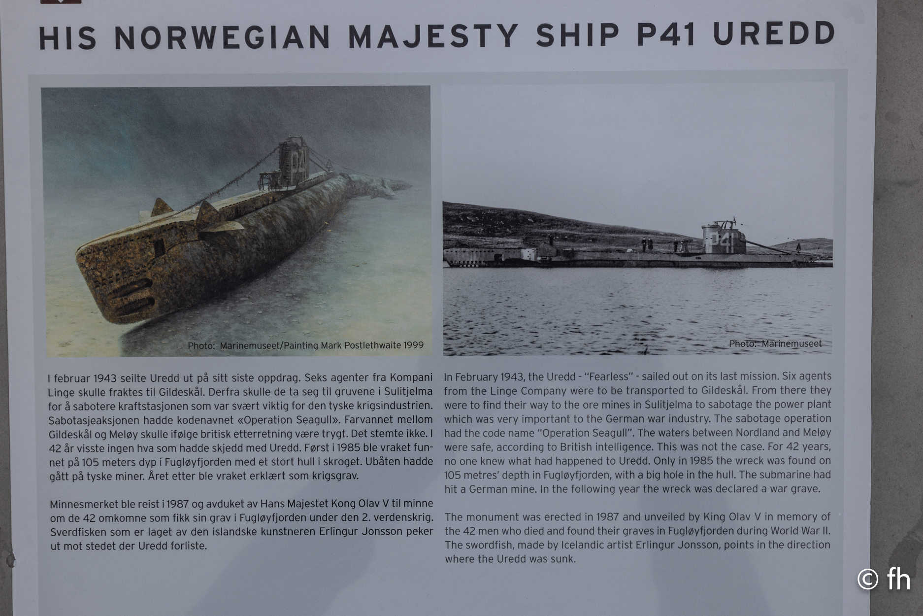 Dort gibt es außerdem ein Ort der Erinnerung. Hier wurde ein Denkmal zum Gedenken an die Opfer errichtet, die sich im U-Boot „Uredd“ befanden, als es im Zweiten Weltkrieg auf eine Mine im Fugløyfjord gelaufen war. Das U-Boot befand sich auf dem Weg nach Gildeskål mit Agenten der Kompanie Linge, die nach Sulitjelma weitergebracht werden sollten, um einen Sabotageakt gegen das Kraftwerk bei den Gruben auszuüben.