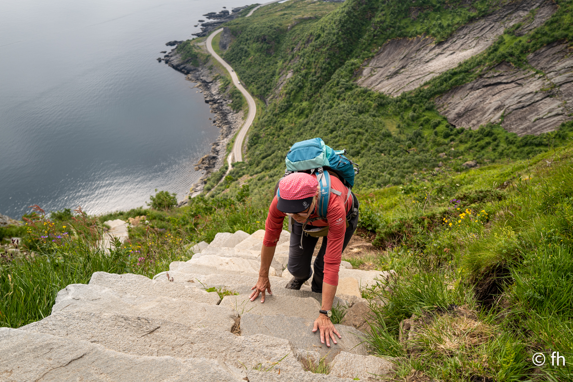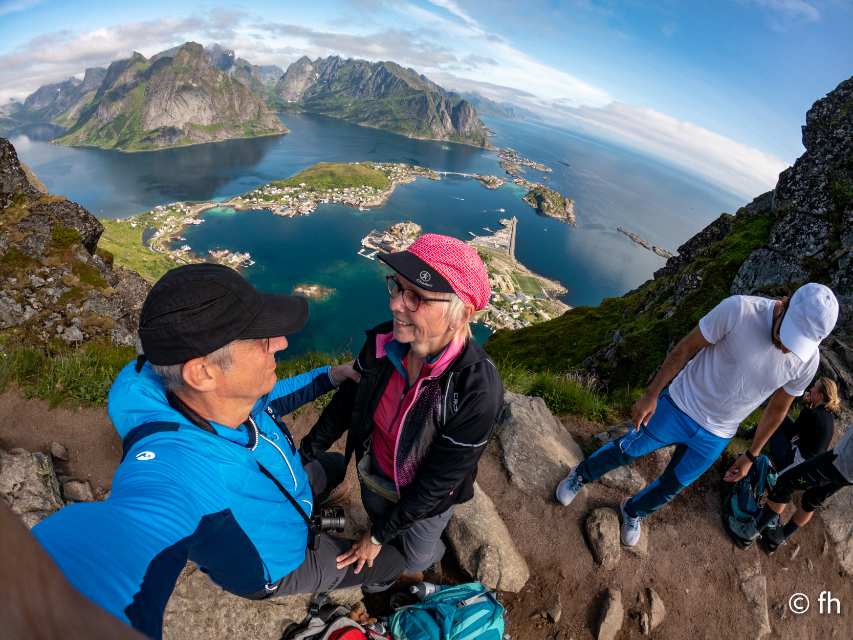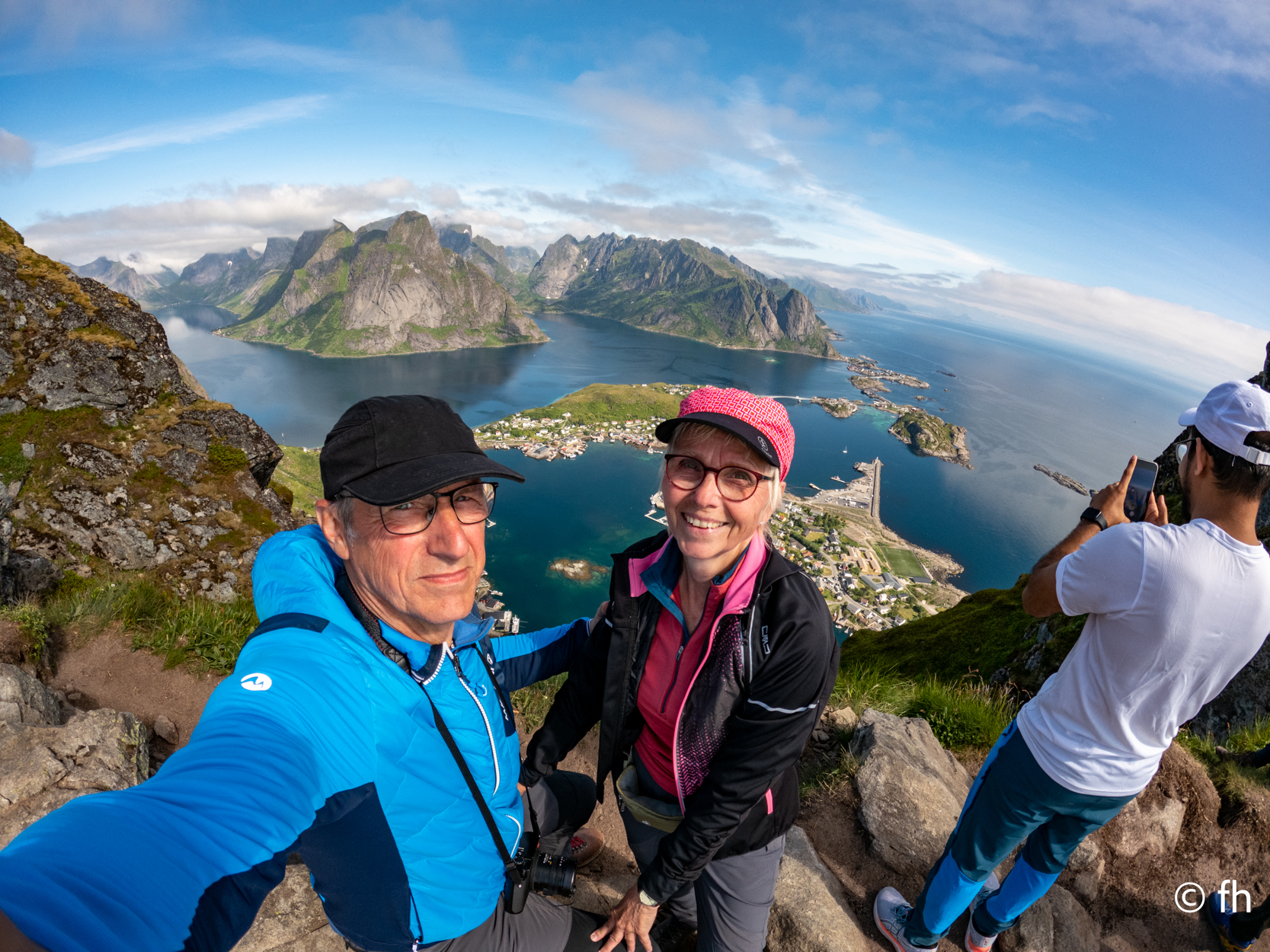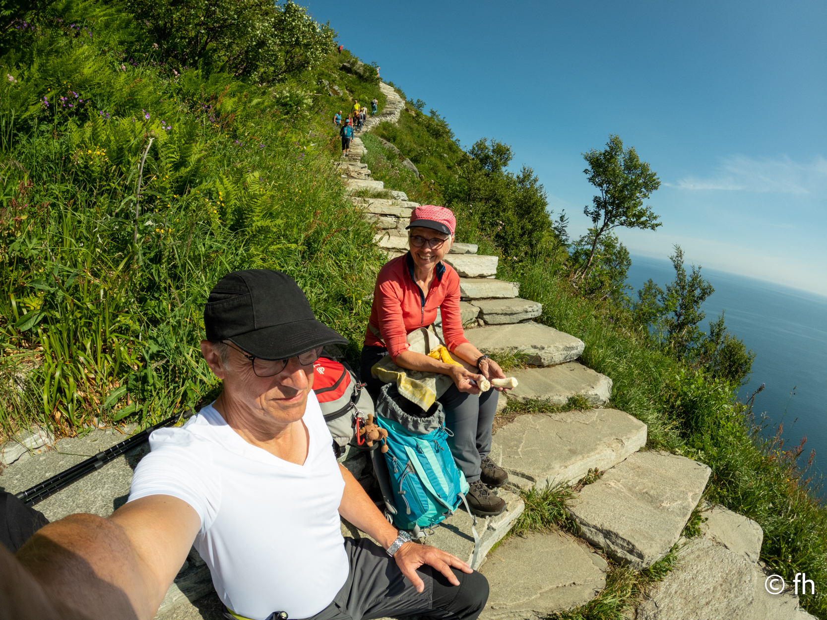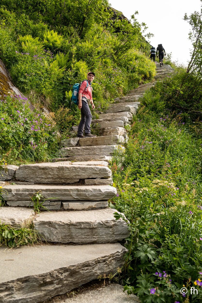 So, und nun zum ernsten Teil des Tages. Die Klettertour auf den Berg „ Reinebringen“. Ich schlage vor, demnächst nicht alles zu lesen, was man in Reiseführern findet. Über 1500 Stufen, wenn man Stufen dazu sagen kann. Stufen bis zu einer Tritthöhe von 30 cm und mehr. Von Sherpas aus Nepal gebaut. Kein Scherz das stimmt. Der Anfang der Treppe war ziemlich locker, die Stufen hatten dort noch eine angenehme Tritthöhe und waren gut zu gehen. Das hörte allerdings ziemlich schnell auf. Die Stufen wurden immer unregelmäßiger in der Höhe und Tiefe. Eine echt anstrengende Nummer. Ab Stufe 400, waren es ja nur noch 1100 Stück, und die Intervalle für die Pausen wurden immer kürzer. Die Frage, die mich die ganze Zeit quälte, wie kommen wir da heile wieder runter. Zumal ich nicht wirklich schwindelfrei bin, und die Stufen teilweise ziemlich hoch waren. Aber nach gut 90 Minuten war das ersehnte Ziel erreicht. Wir wurden mit einem traumhaften Postkartenausblick belohnt. Alter Schwede das war ein super Blick. Nach erfolgreichem Abstieg und einer Dusche ging es ab in das Restaurant von gestern. Das Eis musste sein.