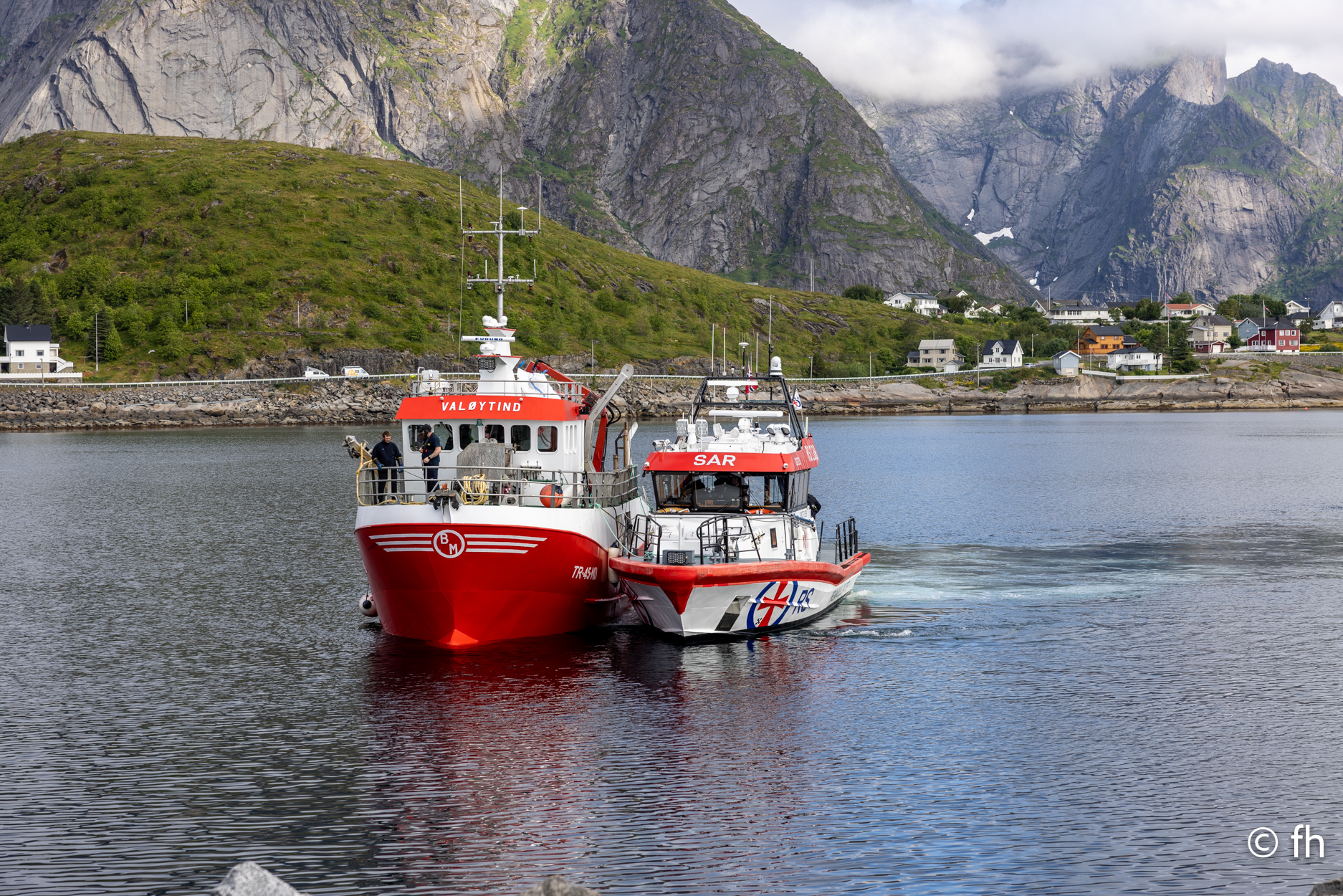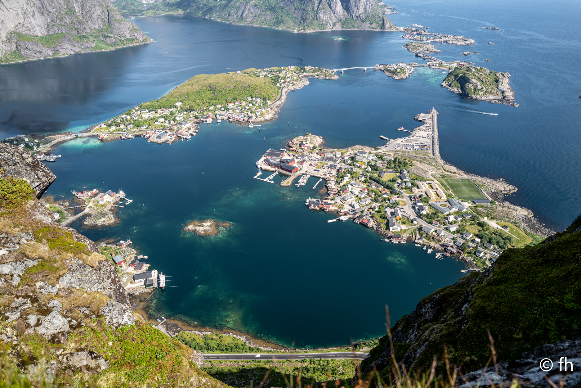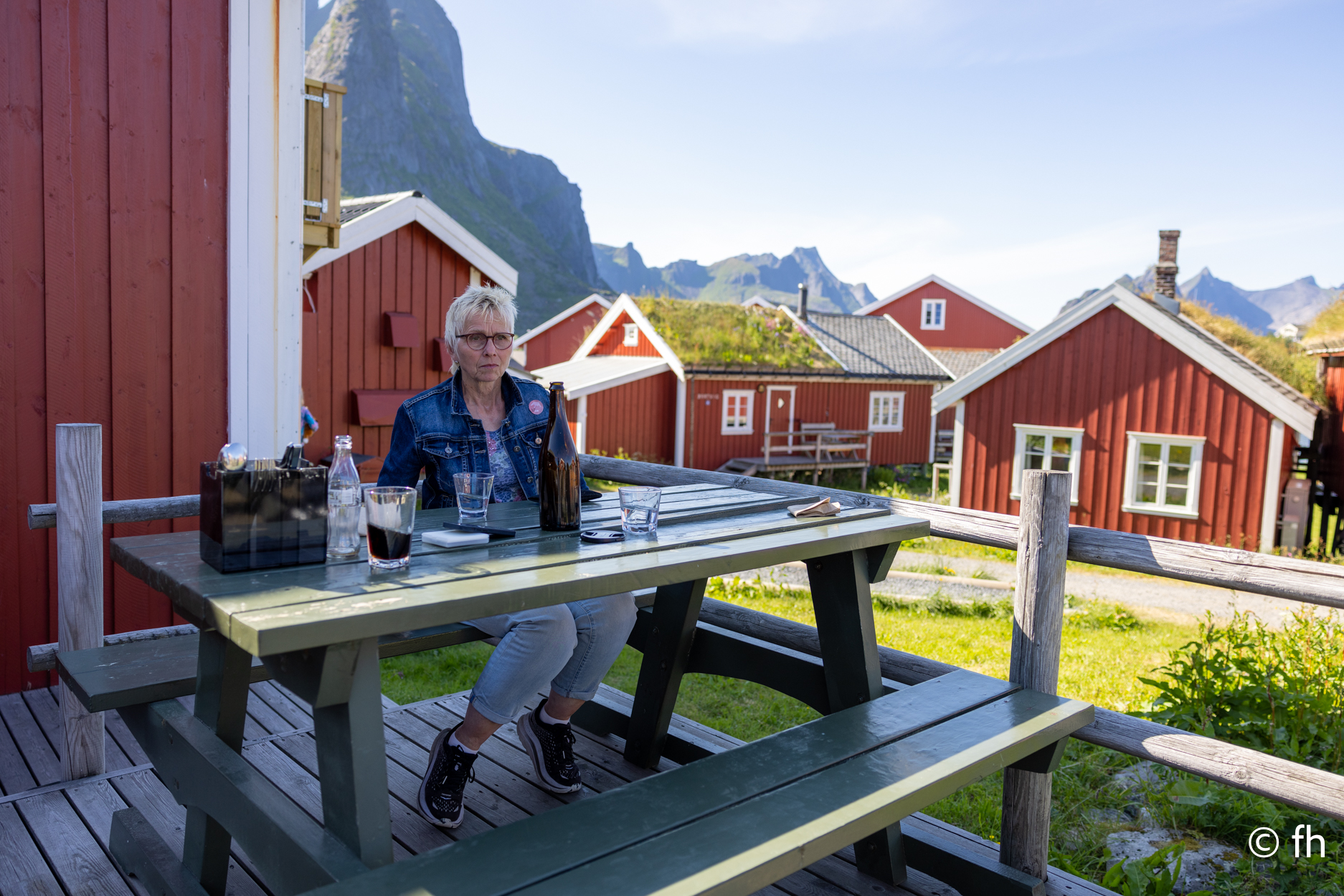 Der Abschluss der Reise über die Lofoten war der Ort „A“, der Ort liegt auf dem südlichsten Teil der Lofoten der mit dem Auto zu erreichen ist. In A ist eines der Paradiese für Hobby Angler. Die holen die Fische dort Kistenweise aus dem Wasser. An Land werden sie dann filetiert und für die Reise nach Hause eingefroren. Im Moment sitzen wir auf der Fähre von Moskenes nach Bodo und schreiben diesen Bericht. Die Fähre ist nicht voll und so haben wir einen Logenplatz ganz vorne mit Sicht auf das Ziel. In der Ferne kann man die Berge erkennen, die von der tief stehenden Sonne angestrahlt werden und über den Bergen ist der Mond zu sehen. Am Heck des Schiffes gibt es ein schönen Blick auf die Mitternachtssonne, die steht 2 Meter über dem Wasser und leuchtet feuerrot. Vorne der Mond und hinten die Sonne in voller Pracht, verrückt.