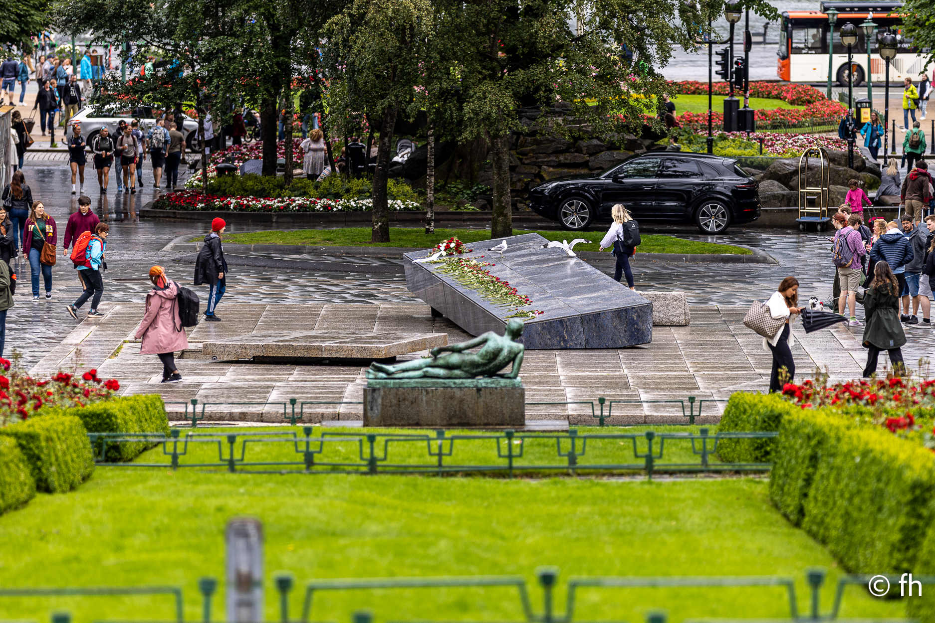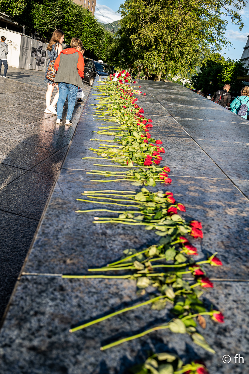 Wir waren jetzt schon zum dritten Mal in Bergen. In Bergen regnet es immer, so sagt man. Wir hatten aber immer Glück mit dem Wetter, außer einem kleinen Regenguss schien meist die Sonne. Wenn du Regenkleidung benötigst, hier gibt es sie. Modische Gummistiefel mit oder ohne Absatz, den schicken Regenmantel in alle Variationen. Touristen aus der ganzen Welt treffen sich hier. Beim Bummeln durch die Stadt viel uns ein mit Rosen und einem Kranz bedeckter Stein auf. Er dient den Menschen jedes Jahr als Gedenkstätte für die Opfer des Massakers vom 22. Juli 2011. Wir haben hier vor der Stadt zwei Nächte verbracht. Die Verkehrsanbindung war super, die Straßenbahn sowie die Bus-Haltestelle waren nur wenige Meter von unserem Wohnmobil entfernt. Wenn man den Pfad des Touristenstrom in der Stadt verlässt, gibt es viele ursprüngliche Gebäude und Gassen zu erkunden. Nicht zu vergesesen die Cafe’s mit den leckeren Zimtschnecken, die du dann ohne den üblichen Touristenandrang genießen kannst. Eine schöne Stadt. Ein Besuch lohnt immer.