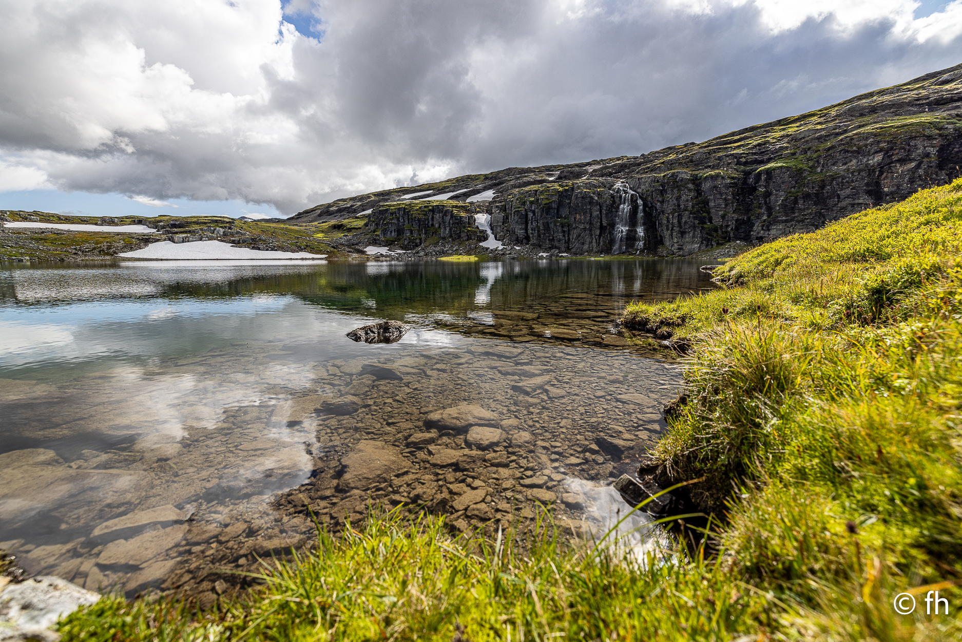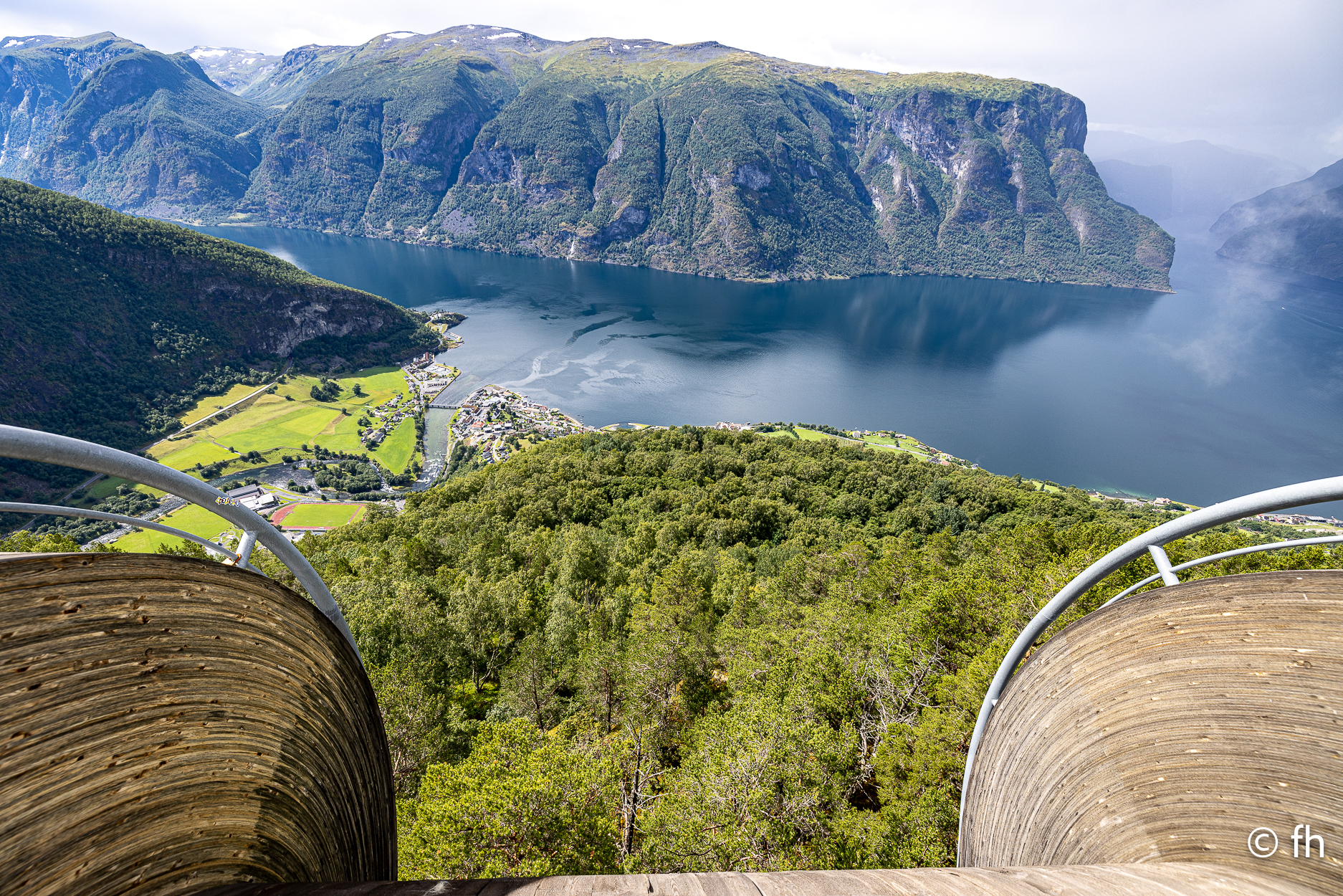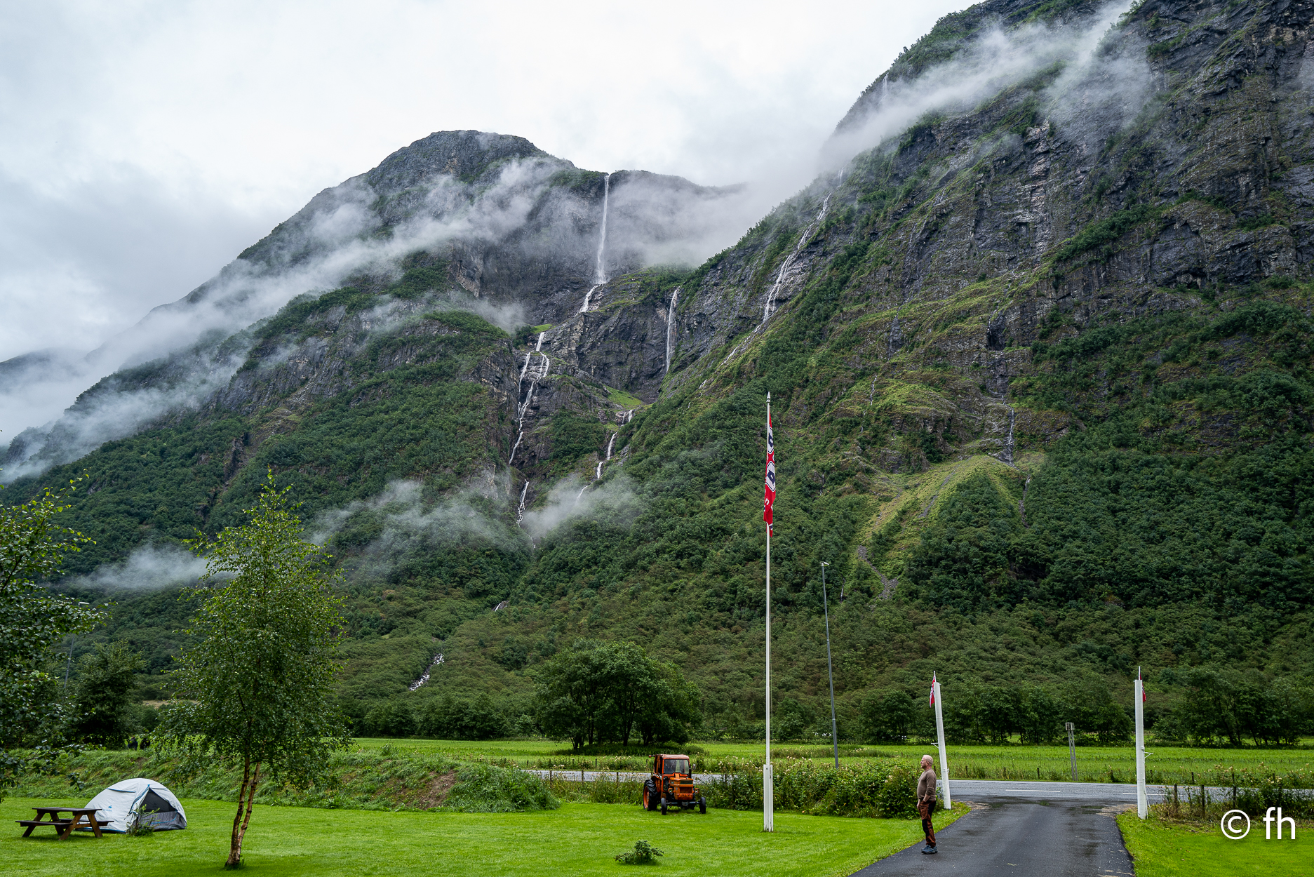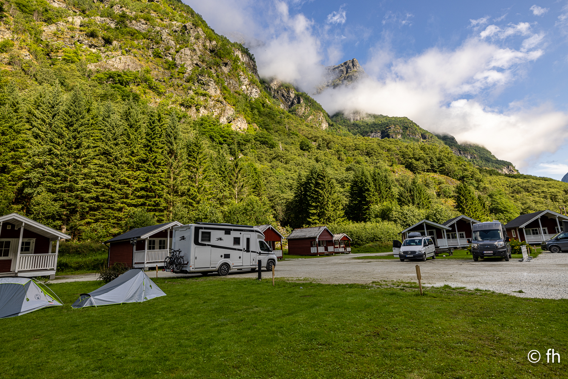 Die Fahrt von Bergen nach Gudvangen war ein nasses Abenteuer, die meiste Zeit nur Regen. Also nichts Besonderes zu berichten. Nach der Ankunft auf dem Campingplatz in Gudvangen haben wir die Wikingerstadt besucht. Ne, nicht wirklich. 500 Meter vom Campingplatz gab es ein Wikingerdorf zu besichtigen. Zum Glück war das Museum schon geschlossen. Auf dem Rückweg ging’s noch kurz zum Fähranleger nur 300 Meter die Straße rein. Ein Riesen-Store mit lauter Nippes und einem Restaurant mit geschätzt 200 Sitzplätzen, nichts für uns. Gleich nebenan ein Bäckerladen, nichts wie hin, vielleicht gibt es hier Zimtschnecken. Es gab noch mehr als Zimtschnecken. Alles sah lecker aus. Die Wahl fiel auf einen mini Berliner und ein Teil mit Schokoladen-Stückchen, habe den Namen vergessen. Als ich noch einen zweiten Cappuccino bestellte, und gleichzeitig das Lokal und die verspeisten Dinge lobte, ging es los. Der Chef erklärte uns, dass er das Geschäft erst seit einem Jahr betreibt und das Gebäude ein altes Postamt war. Der Holzkonstruktion war ihr Alter anzusehen. Nach einem netten Plausch mussten wir dann noch auf Kosten des Hauses ein Croissant gefüllt mit Schokolade probieren. Lecker. Heute Morgen haben wir uns dann für die tägliche Kaffeepause mit frischen Croissants eingedeckt. Wir haben die Croissant dann an einem der unzähligen Bäche die das Land bietet genossen. Nach dem Start heute Morgen ging es nach ca. 1000 Meter in den ersten Tunnel, 12 km lang. Wir hatten gestern Abend den Plan, heute durch den längsten Autotunnel der Welt zu fahren, der ist 24,5 km lang. Der wäre kurz nach dem 12 km langen Gudvangen Tunnel gekommen. Vor dem Tunnel haben wir uns dann entschlossen, den Weg über den Berg zu nehmen. Der Umweg hat uns den ganzen Tag gekostet, aber es war die richtige Entscheidung. Wir wurden mit unbeschreiblichen Eindrücken belohnt. Eine wunderschöne Landschaft. Dort auf der Hochebene sieht es teilweise aus wie auf dem Mond, obwohl wir noch nie da waren, auf dem Mond. Einfach eindrucksvoll, du kannst kilometerweit über die Berge schauen. Für die heutige Nacht haben wir uns am Rande eines Fjords gestellt. Kein Campingplatz, wir sind autark, Gas für die Heizung und heißes Wasser ist ausreichend vorhanden. Wir genießen die Aussicht bis es dunkel wird.